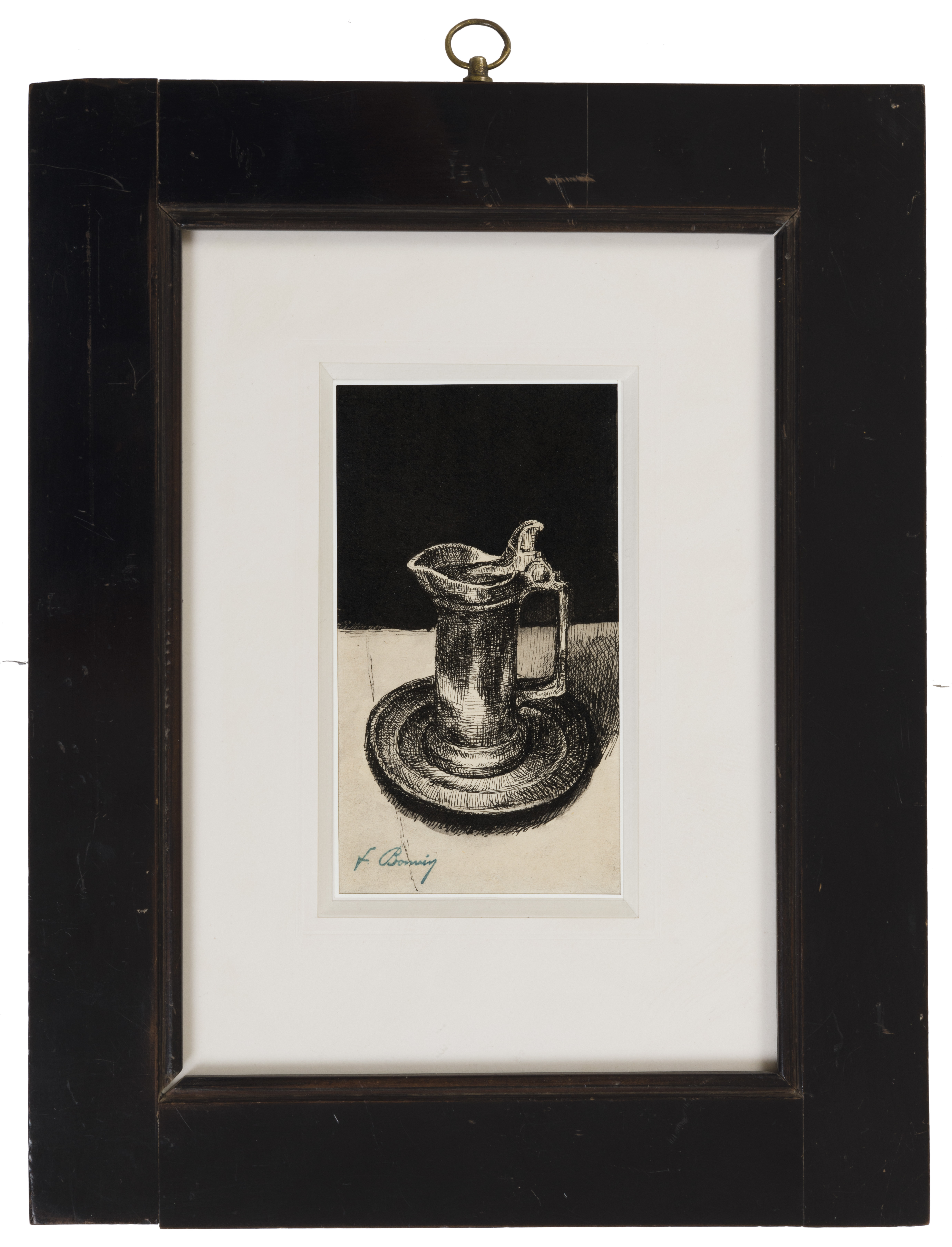 An accomplished still life painter, François Bonvin preferred to depict humble household or kitchen objects in a manner inspired by the example of the 18th century painter Jean-Siméon Chardin, whose work he greatly admired. A visitor to Bonvin’s studio noted that ‘When you penetrate into the interior, you think you have been transported into another world: furniture in rough wood, clay pitchers, copper cauldrons, frying pans – objects of all kinds were littered across the floor in the midst of vegetables and baskets of fruits: these were the artist’s props.’