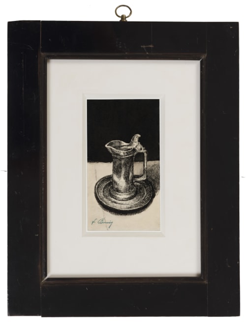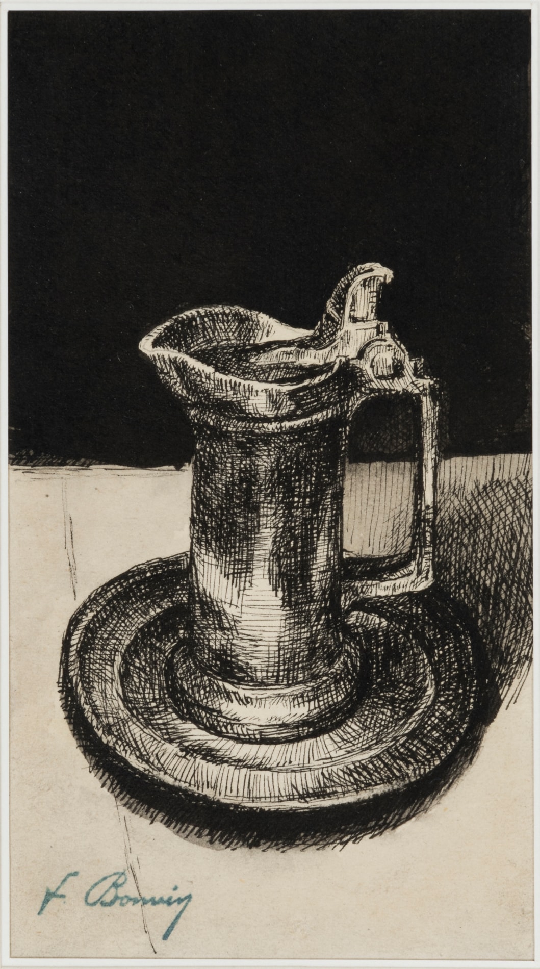 An accomplished still life painter, François Bonvin preferred to depict humble household or kitchen objects in a manner inspired by the example of the 18th century painter Jean-Siméon Chardin, whose work he greatly admired. A visitor to Bonvin’s studio noted that ‘When you penetrate into the interior, you think you have been transported into another world: furniture in rough wood, clay pitchers, copper cauldrons, frying pans – objects of all kinds were littered across the floor in the midst of vegetables and baskets of fruits: these were the artist’s props.’