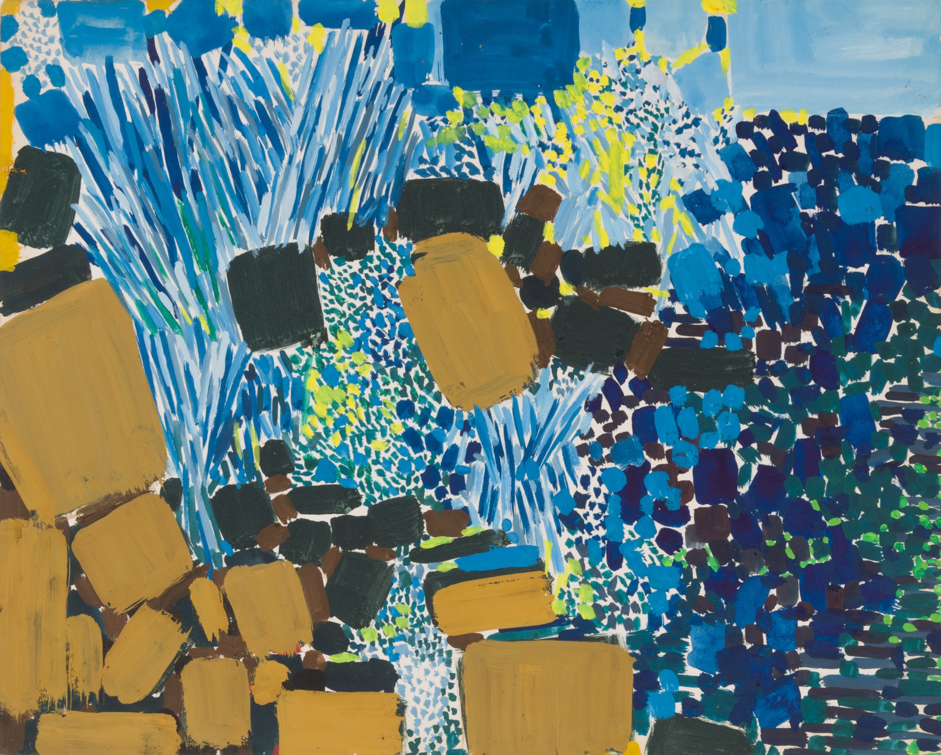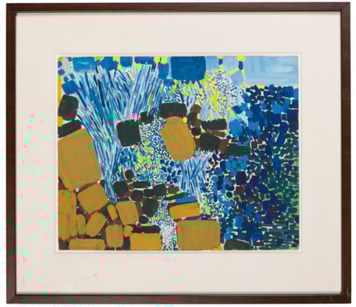 Lynne Drexler’s work was always first and foremost about colour., and her use of squarish patches of vibrant colour is seen to particularly brilliant effect in this large gouache. Executed in 1962, a year after her first solo exhibition and the same year that she married the painter John Hultberg, Washerwomen reflects the longstanding influence on Drexler of her training with Hans Hofmann, notably his particular emphasis on a rhythmic approach to composition and a vibrant colour palette. This devotion to colour was something that Drexler also admired in the work of such artists as Vincent van Gogh and Henri Matisse, with both of whom her works were often likened by later writers.
