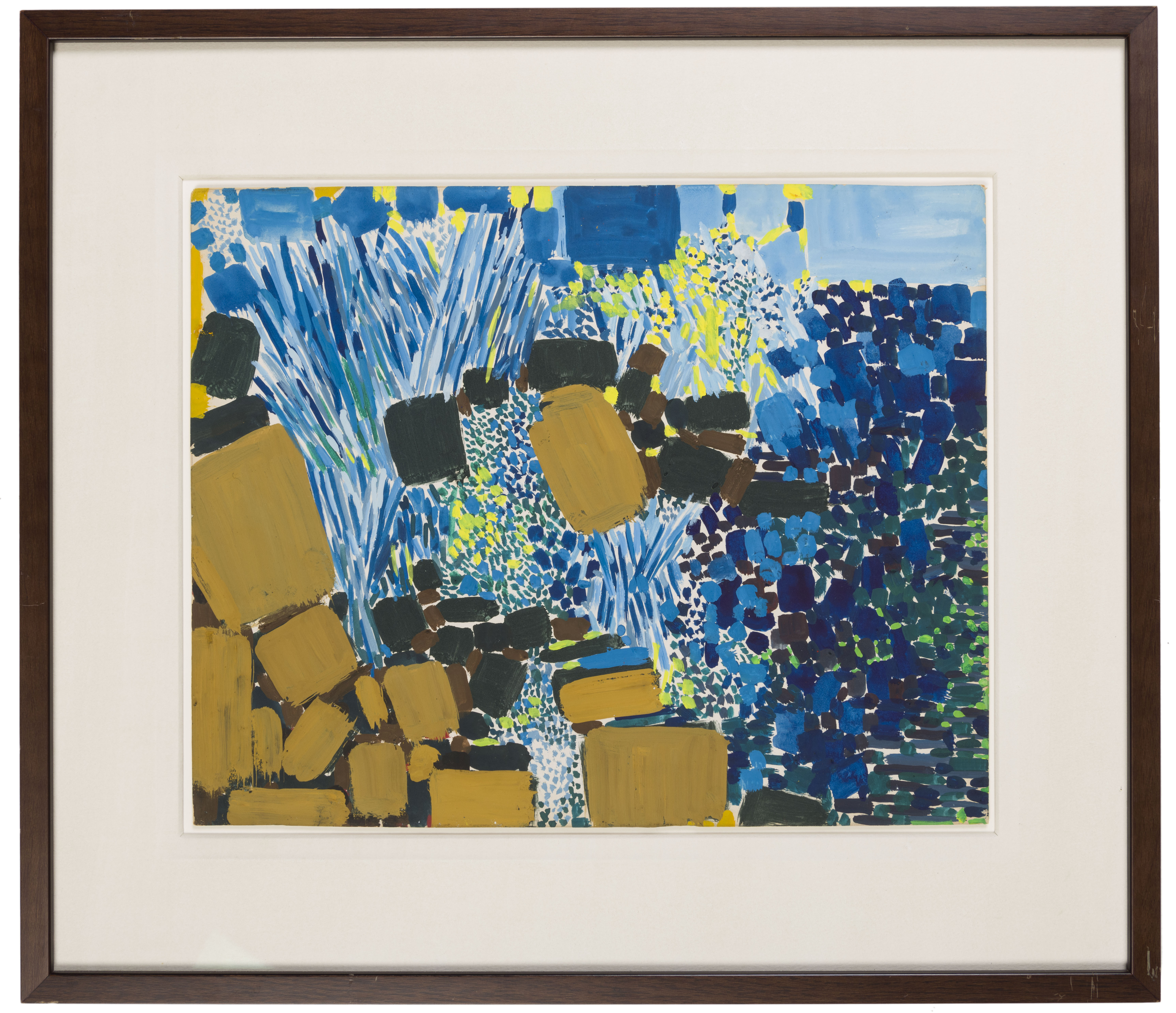 Lynne Drexler’s work was always first and foremost about colour., and her use of squarish patches of vibrant colour is seen to particularly brilliant effect in this large gouache. Executed in 1962, a year after her first solo exhibition and the same year that she married the painter John Hultberg, Washerwomen reflects the longstanding influence on Drexler of her training with Hans Hofmann, notably his particular emphasis on a rhythmic approach to composition and a vibrant colour palette. This devotion to colour was something that Drexler also admired in the work of such artists as Vincent van Gogh and Henri Matisse, with both of whom her works were often likened by later writers.