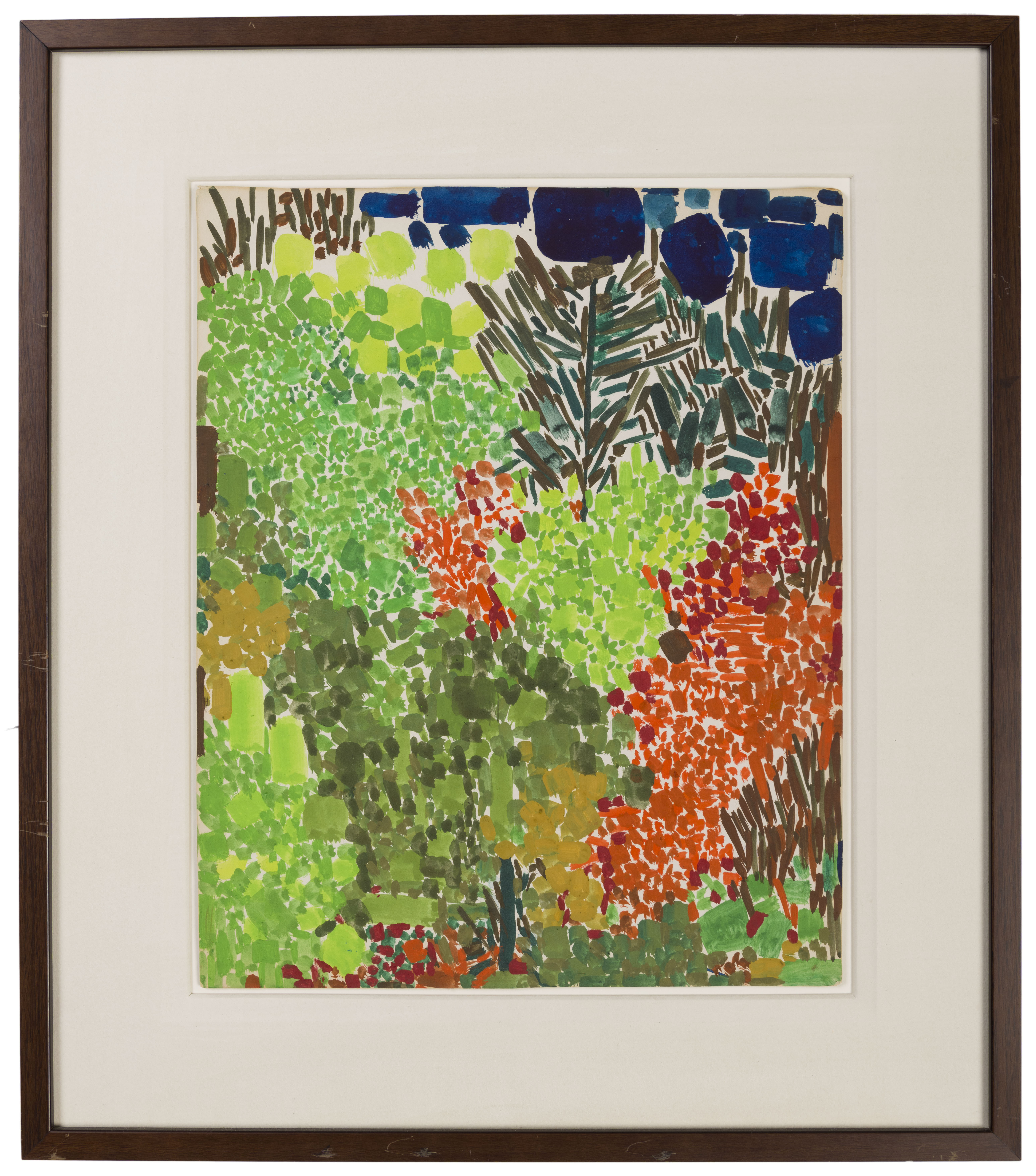 Lynne Drexler’s characteristic use of squarish patches of colour, applied with short brushstrokes, is seen to brilliant effect in this vibrant gouache, which is dated 1962. This was the year of Drexler’s marriage to the artist John Hultberg, and the present work may have been executed during the couple’s honeymoon in Maine that year. Foliage Study also reflects something of the influence of Drexler’s training with Hans Hofmann, in his particular emphasis on a rhythmic approach to composition and a brilliant colour palette. This devotion to colour was something that Drexler also admired in the work of such artists as Vincent van Gogh and Henri Matisse, with whom Hofmann had studied in Paris in the early years of the 20th century.