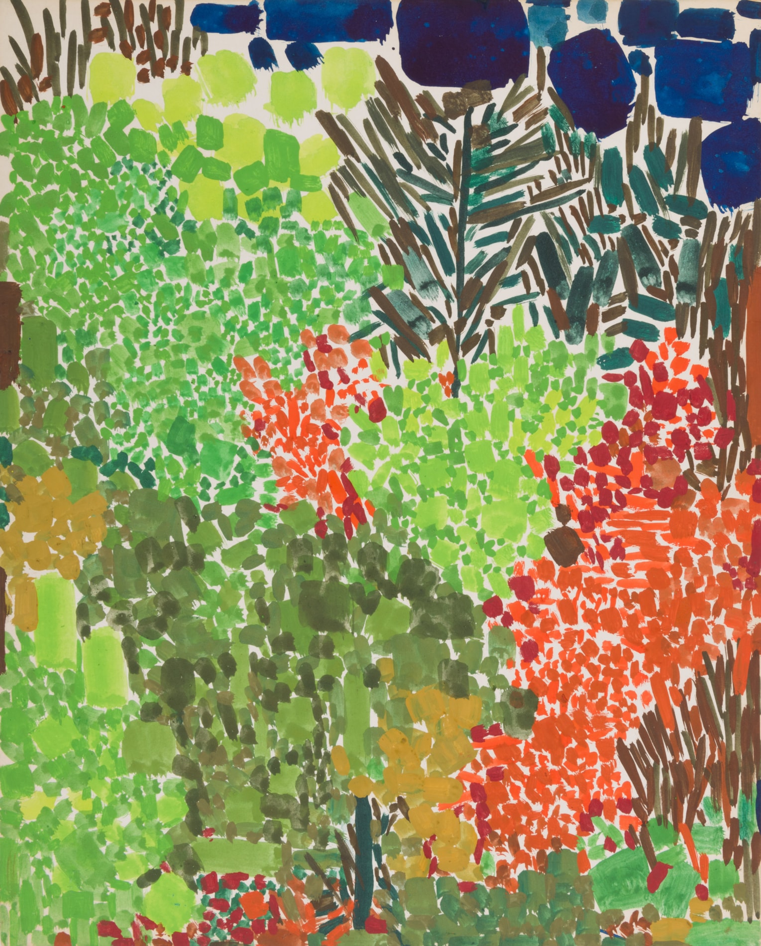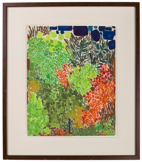 Lynne Drexler’s characteristic use of squarish patches of colour, applied with short brushstrokes, is seen to brilliant effect in this vibrant gouache, which is dated 1962. This was the year of Drexler’s marriage to the artist John Hultberg, and the present work may have been executed during the couple’s honeymoon in Maine that year. Foliage Study also reflects something of the influence of Drexler’s training with Hans Hofmann, in his particular emphasis on a rhythmic approach to composition and a brilliant colour palette. This devotion to colour was something that Drexler also admired in the work of such artists as Vincent van Gogh and Henri Matisse, with whom Hofmann had studied in Paris in the early years of the 20th century.