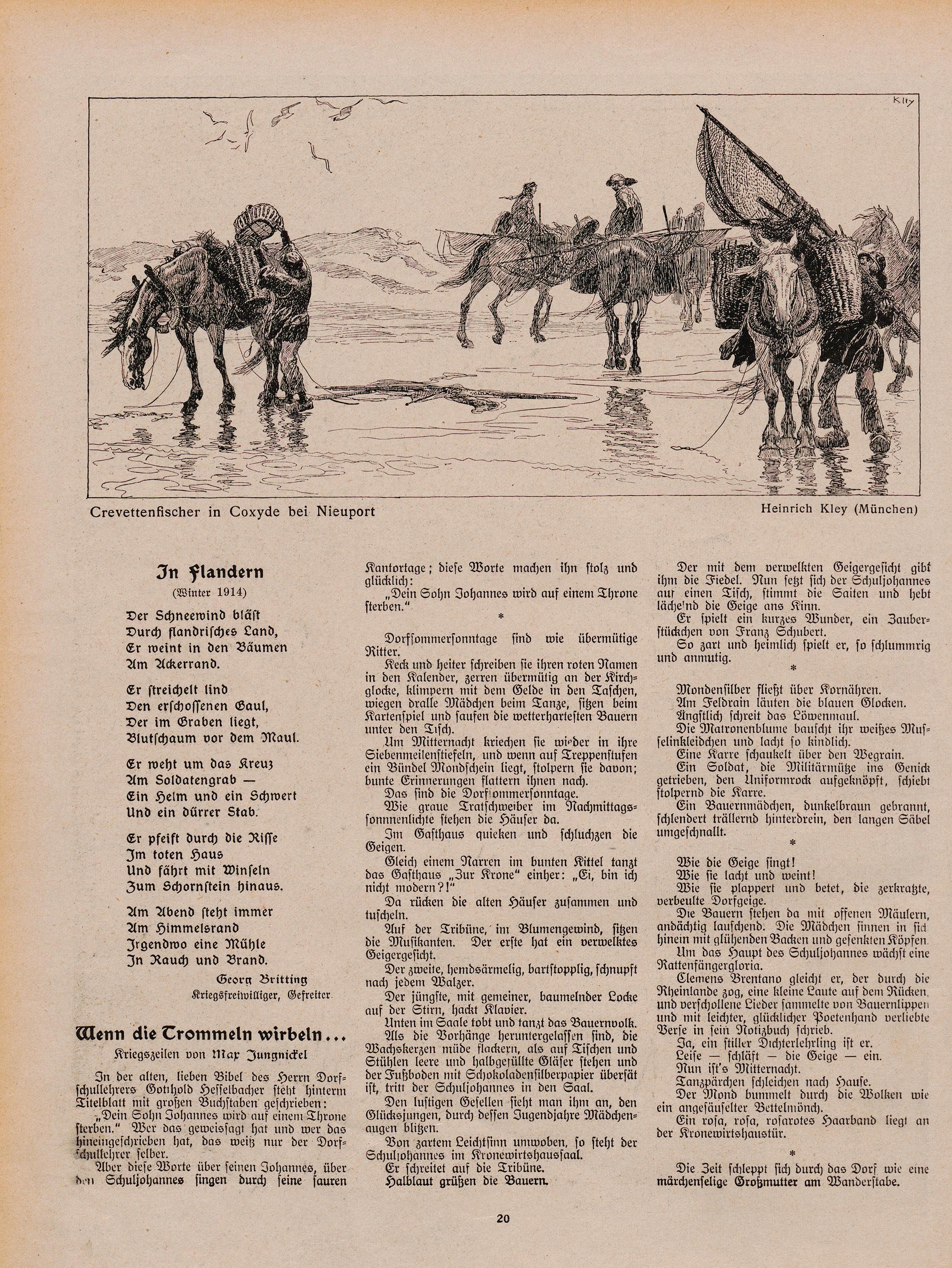 The present sheet was drawn at Koksijde, a town on the North Sea cost of Belgium, and was used for an illustration which appeared in the illustrated Munich journal Jugend in 1915. Kley produced over 230 illustrations for the weekly magazine between 1897 and 1938, and indeed two special issues of Jugend, published in 1910 and 1915, were almost entirely taken up with his work.
