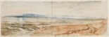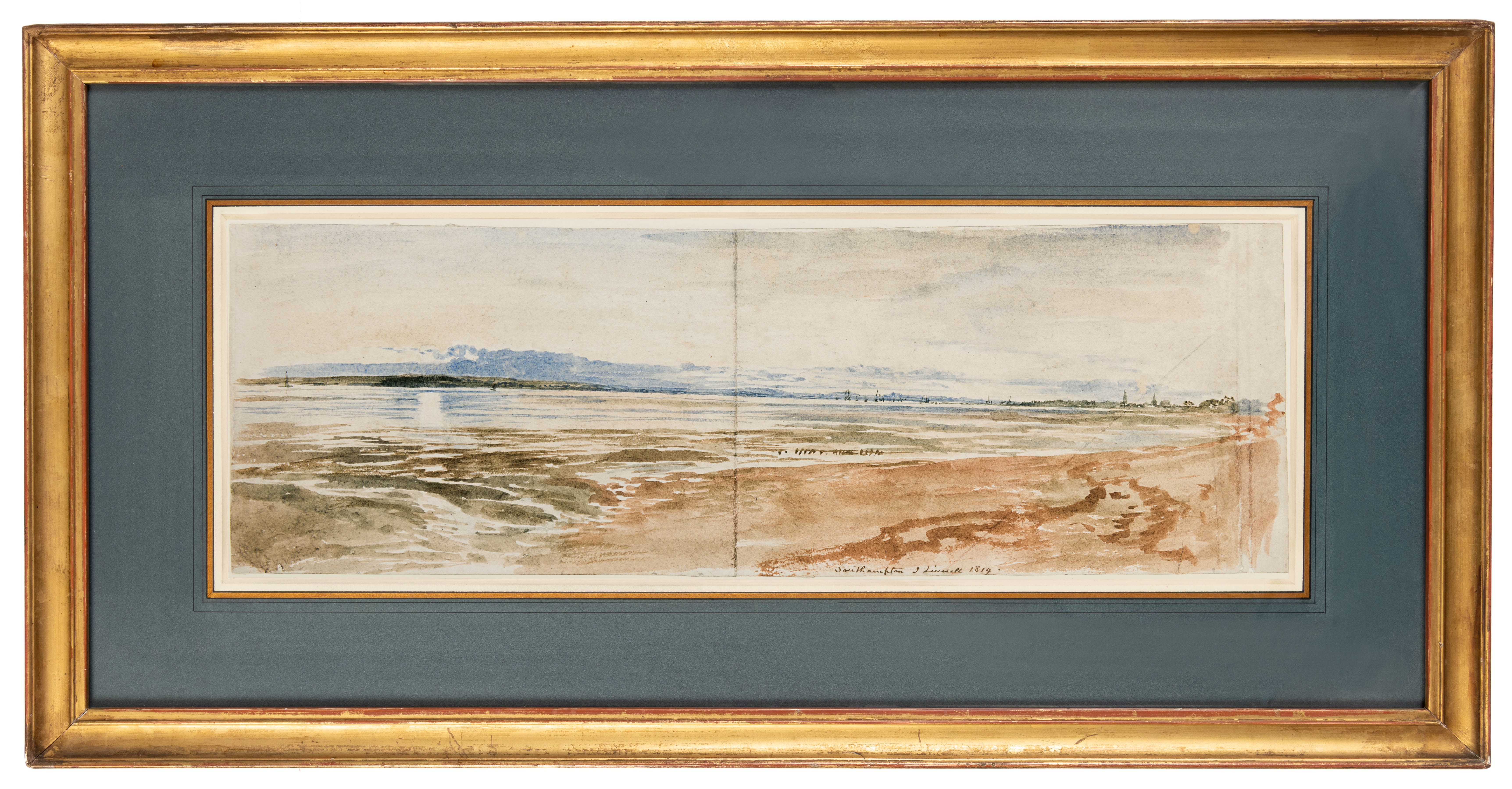 John Linnell visited the port city of Southampton in September and October of 1819. He stayed there as the guest of the painter and engraver David Charles Read, who introduced him to his patron Chambers Hall (1786-1855), of Elmfield Lodge in Southampton. Linnell produced several studies of the landscape around Southampton Water and the Itchen and Test rivers, which he later developed into oil paintings. Drawn on the double-page spread of one of the artist’s early sketchbooks, this sunset view was, some years later, used as a reference study for a small oil painting commissioned from Linnell by the collector Chambers Hall in 1825. The vibrant hues of sunset in the painting delighted Hall and resulted in the commission of a second canvas, The Ferry of Itchen, also painted in 1825. As Hall wrote to Linnell about the painting of Southampton from the River near Netley Abbey, ‘You have indeed realised ideas which I had long cherished of a most magnificent effect of nature, the interest in which is heightened to me from the circumstance of locality…My real ambition is now the Itchen Ferry (morning) as a companion to the sunset.’