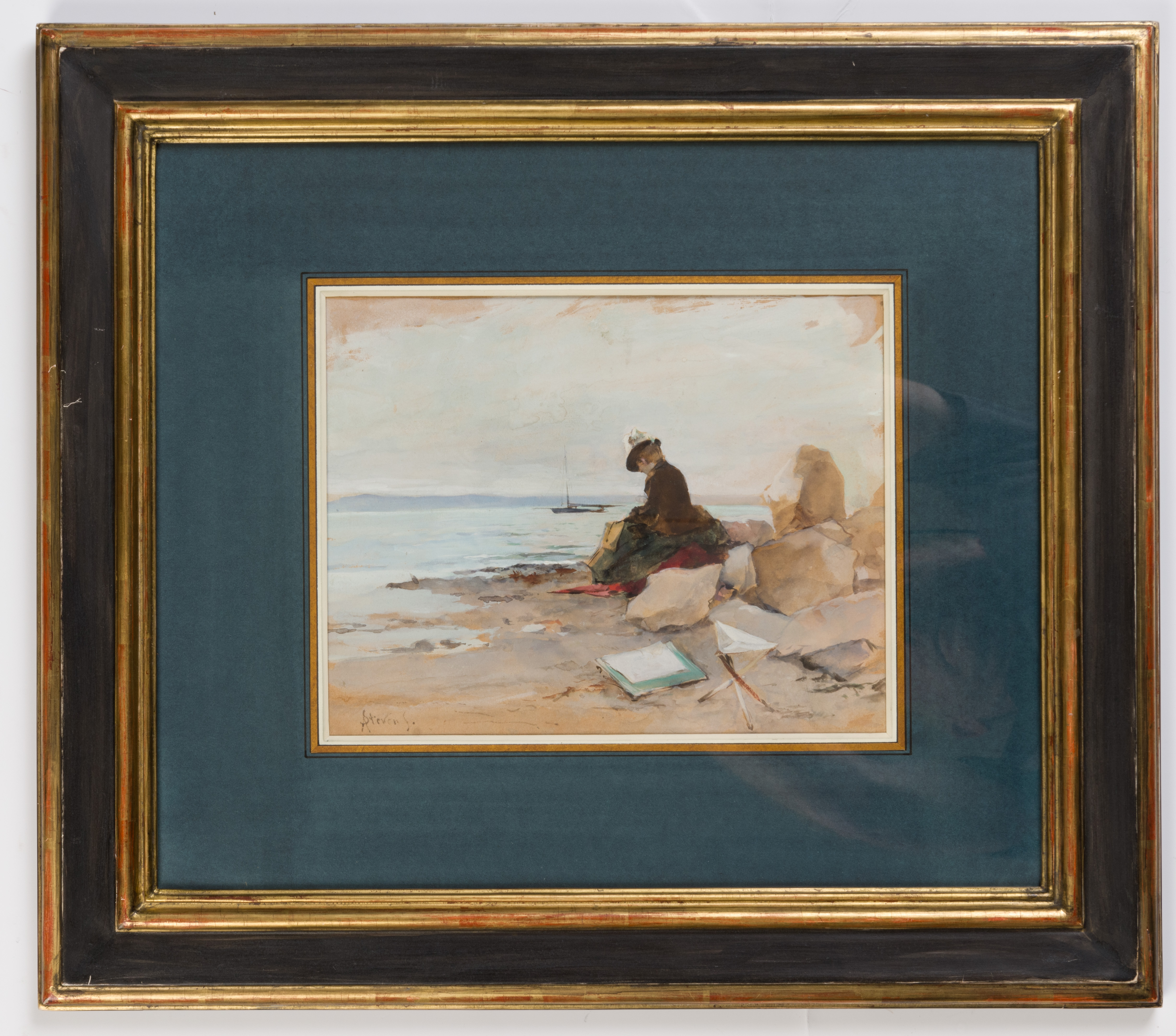 From the age of seventeen, Alfred Emile Leopold Stevens trained in Brussels with François-Joseph Navez, who had been a pupil of Jacques-Louis David. In 1844 he moved to Paris to study with Camille Roqueplan. (He may also have received some artistic instruction from Jean-Auguste-Dominique Ingres at the Ecole des Beaux-Arts.) Stevens returned briefly to Brussels in 1849 and exhibited at the Salon there in 1851, but by the following year he was back in Paris, where he was to live and work for the remainder of his career. He made his debut at the Paris Salon in 1853, where he won a third-class medal and had one of his paintings acquired by the State for the Musée des Beaux-Arts in Marseille. Within a few years Stevens had established his favoured genre of intimate scenes of women in modern interiors for which he was to become famous.