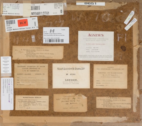 It has been suggested that the present sheet may have been part of a group of fifteen watercolour sketches - done as ‘sample studies’ with a view to obtaining commissions for finished watercolours - seen by Ruskin on the 10th of May 1844 and noted in his diary that day. Two of this group of slightly larger, finished Swiss watercolours are today in the Turner Bequest at the Tate in London and four more are in the Fitzwilliam Museum in Cambridge, while single sheets are in the Courtauld Gallery and the Victoria and Albert Museum in London. This sample watercolour of The Lauerzersee with the Ruins of Schwanau and the Mythens was not, however, used by the artist until several years later, when it served as the basis for one of his final ten finished watercolours of Swiss views, The Lauerzersee with the Mythens of c.1848, which was acquired by Turner’s patron Henry Vaughan and today in the collection of the Victoria and Albert Museum in London. The finished watercolour, however, lacks the lightness of the present study, and is somewhat darker in tonality.