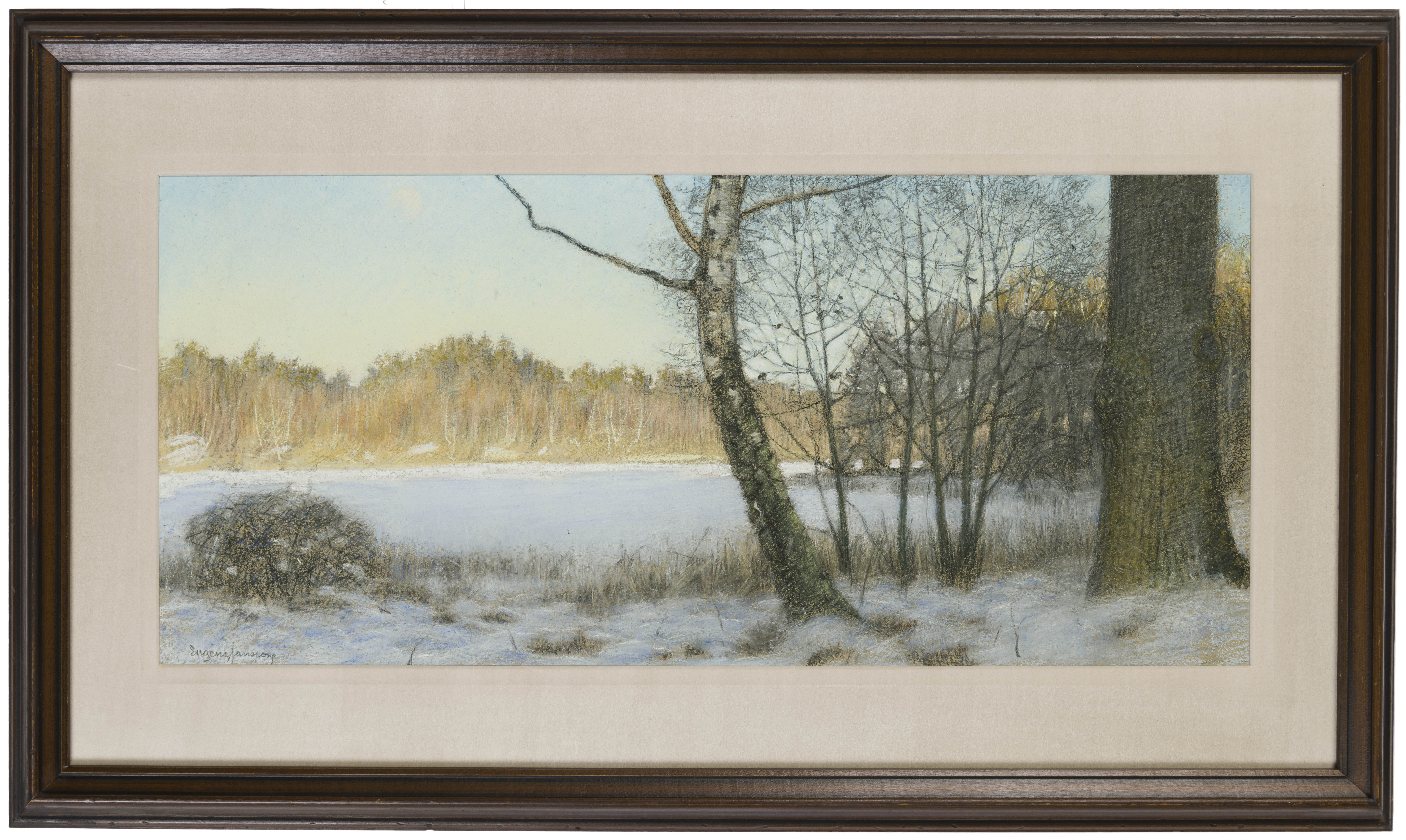 Winter scenes appear often in the early work of Jansson, who was adept as a pastellist and used the medium to particularly fine effect in such atmospheric scenes as the present sheet. This large pastel landscape is likely to date from the late 1880s or the beginning of the 1890s, during the early part of the artist’s independent career. That Jansson’s early pastel landscapes were admired is seen in the fact that King Oscar II of Sweden purchased one of them in 1891. After around 1894, however, Jansson seems to have worked much less in pastel, perhaps at the suggestion of his friend, the artist Karl Nordström, who seems to have encouraged him to focus on oil paintings instead of pastels.