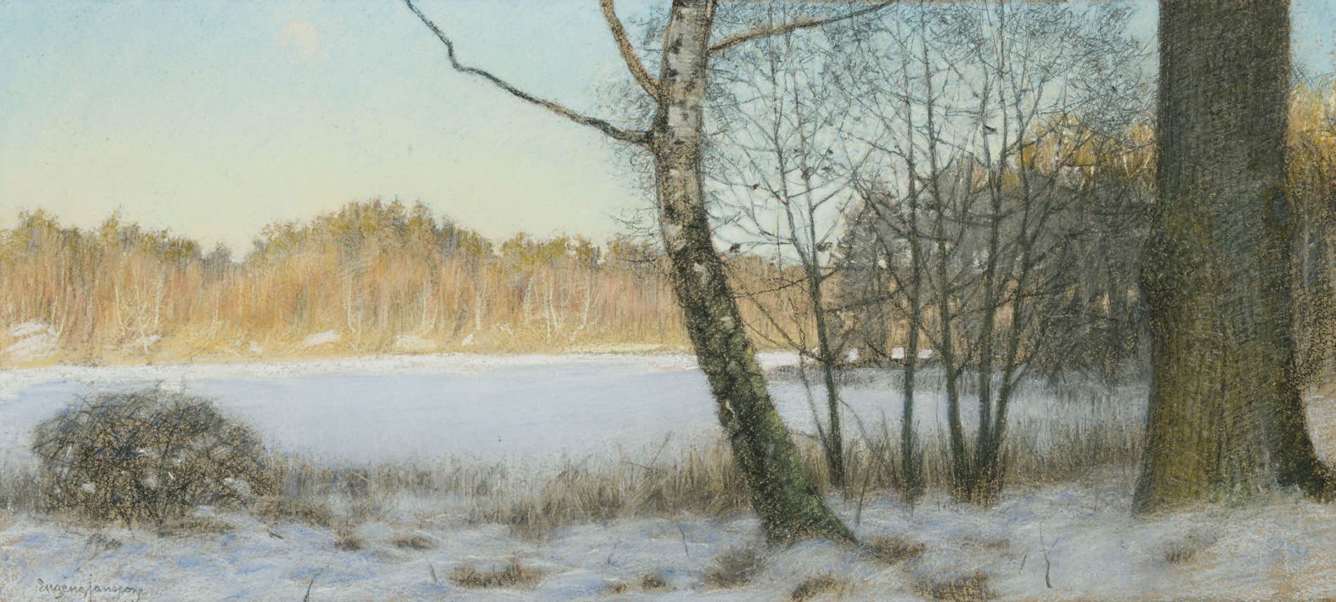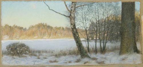 Winter scenes appear often in the early work of Jansson, who was adept as a pastellist and used the medium to particularly fine effect in such atmospheric scenes as the present sheet. This large pastel landscape is likely to date from the late 1880s or the beginning of the 1890s, during the early part of the artist’s independent career. That Jansson’s early pastel landscapes were admired is seen in the fact that King Oscar II of Sweden purchased one of them in 1891. After around 1894, however, Jansson seems to have worked much less in pastel, perhaps at the suggestion of his friend, the artist Karl Nordström, who seems to have encouraged him to focus on oil paintings instead of pastels.