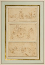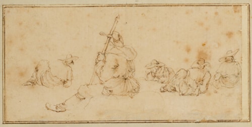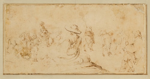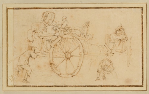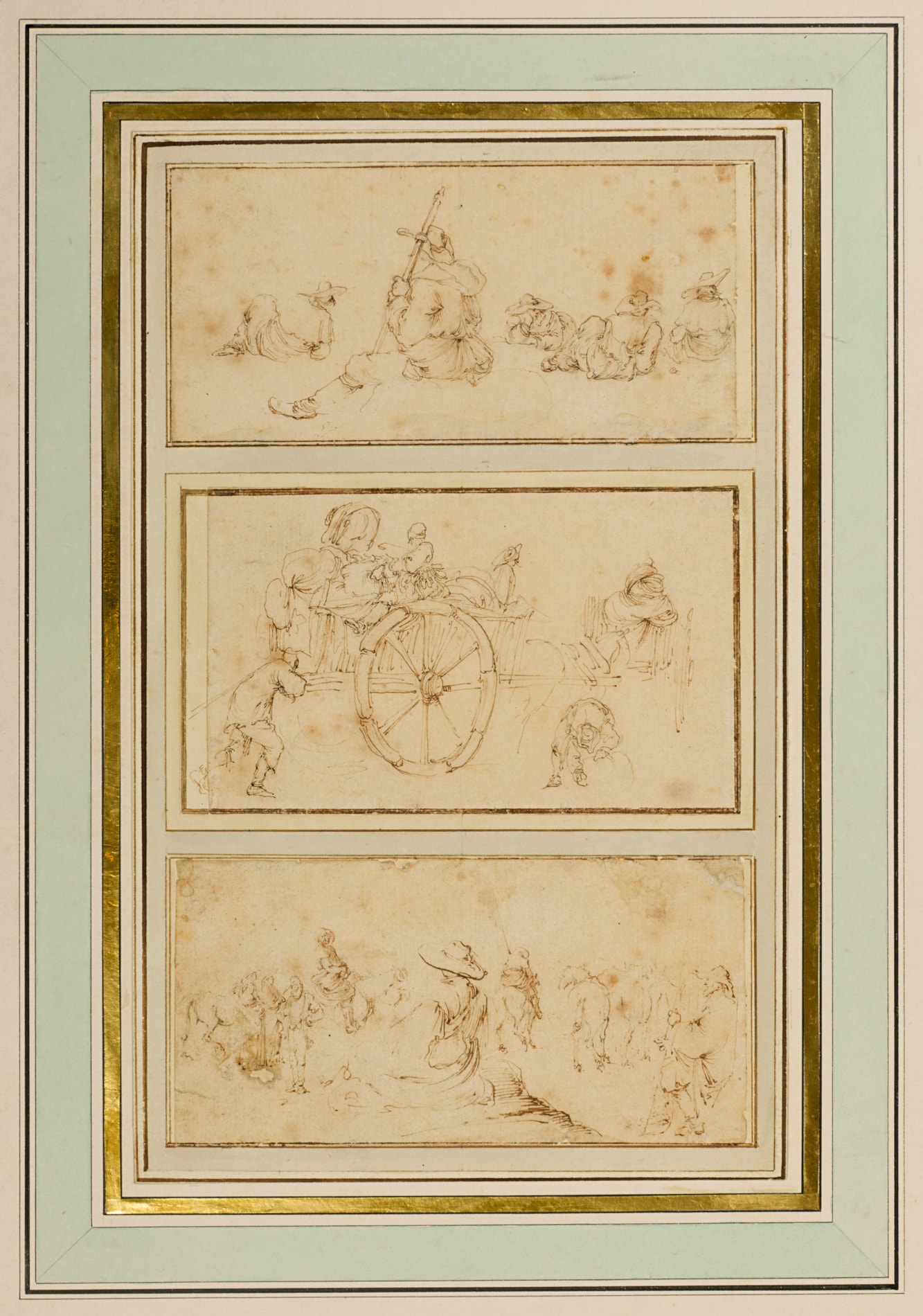 These three drawings, laid down on one mount, can be dated to the artist’s French period, and may be likened to a number of his drawings and prints of the 1640s. The drawing of Figures with a Horse-Drawn Cart, for example, finds parallels in a slightly larger drawing of a similar subject in the Louvre, which has in turn been related to an engraving of a Map and View of the Town of Arras, dated 1641.