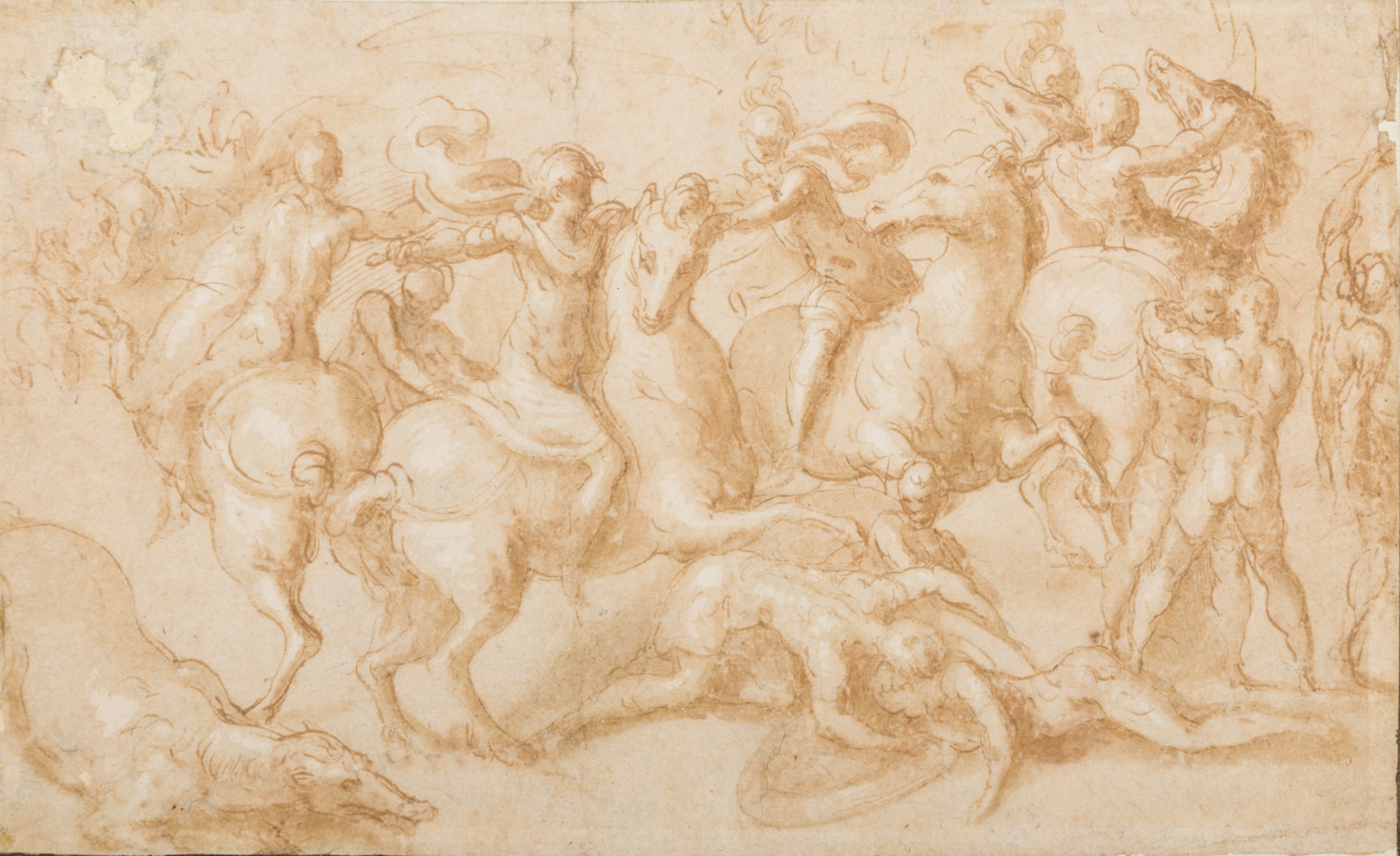 Thought to have been a student of Lorenzo Sabatini in Bologna, the Parmese painter Jacopo Bertoia became a leading member of the late Renaissance or Mannerist style that had become firmly established in his native city, in the previous generation, by the local painter Francesco Maria Mazzola, known as Parmigianino. Although Parmigianino had died a few years before Bertoia was born, the work of the elder artist remained a very strong influence on him throughout his relatively brief career of about a decade. This is already evident in Bertoia’s first known work, a fresco of The Coronation of the Virgin for the façade of the Palazzo Comunale in Parma, painted in 1566. By the late 1560s Bertoia was in the service of the Farnese family. Among his most significant works were the decoration of a number of rooms in the Palazzo del Giardino in Parma for Duke Ottavio Farnese, although there is some debate as to whether the design of two of the rooms, the Sala del Bacio and the Sala di Orfeo, long regarded as Bertoia’s masterpieces as a fresco painter, is in fact due to the Bolognese painter Girolamo Mirola (d.1570). In Rome Bertoia participated in the fresco decoration of the Oratorio del Gonfalone in Rome, on which a team of artists worked between 1569 and 1576, and the Palazzo Capodiferro, while for Cardinal Alessandro Farnese he decorated several rooms in the Palazzo Farnese at Caprarola, succeeding Federico Zuccaro.