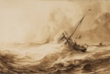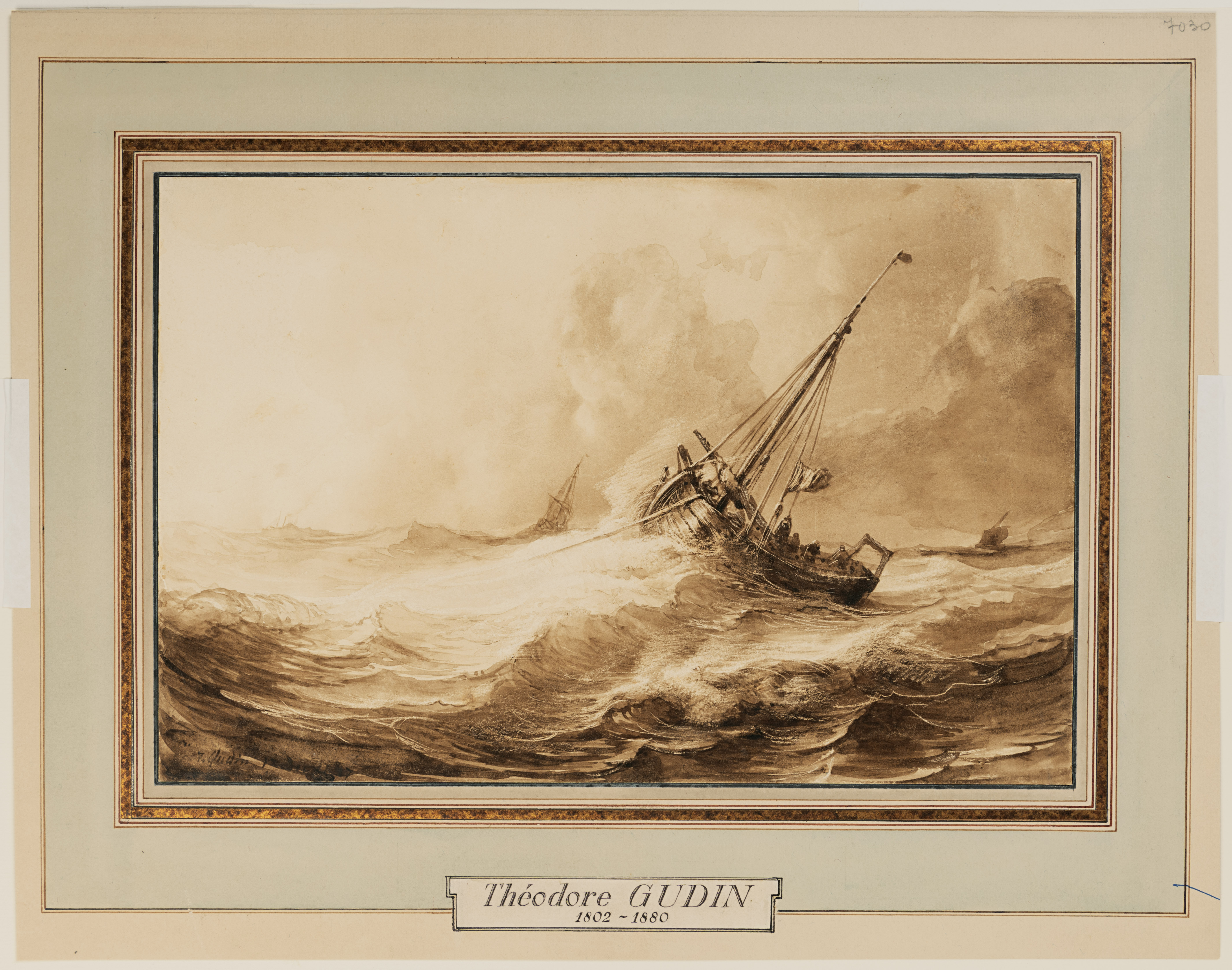 Théodore Gudin’s drawings in sepia wash or watercolour were much admired for their atmospheric depictions of stormy seas, placid waters, sunsets and harbour scenes by moonlight, and were avidly acquired by collectors and connoisseurs throughout Europe. Drawings and finished watercolours by Gudin are today in the collections of the Louvre, the British Museum, the Rijksmuseum in Amsterdam, and elsewhere.