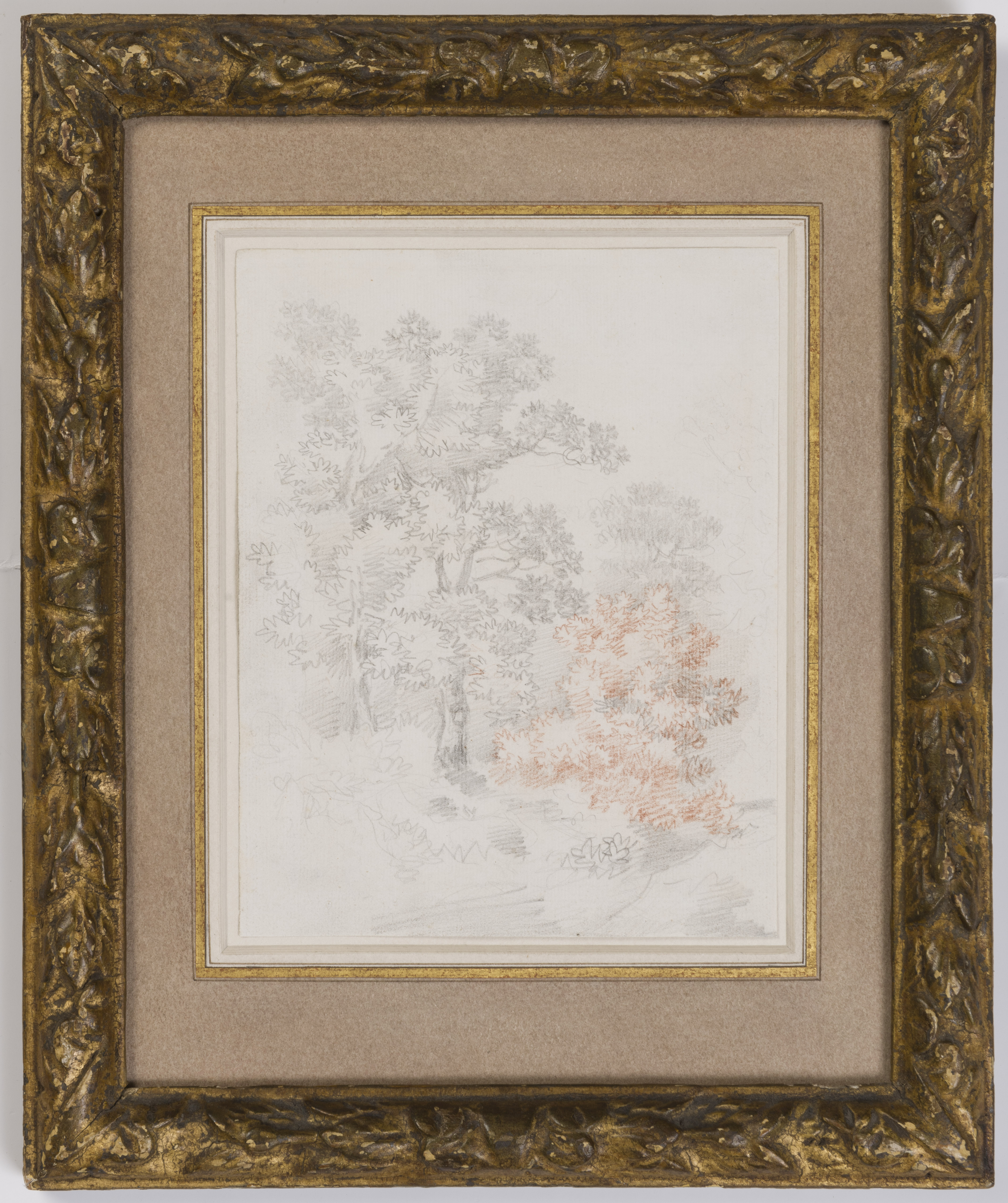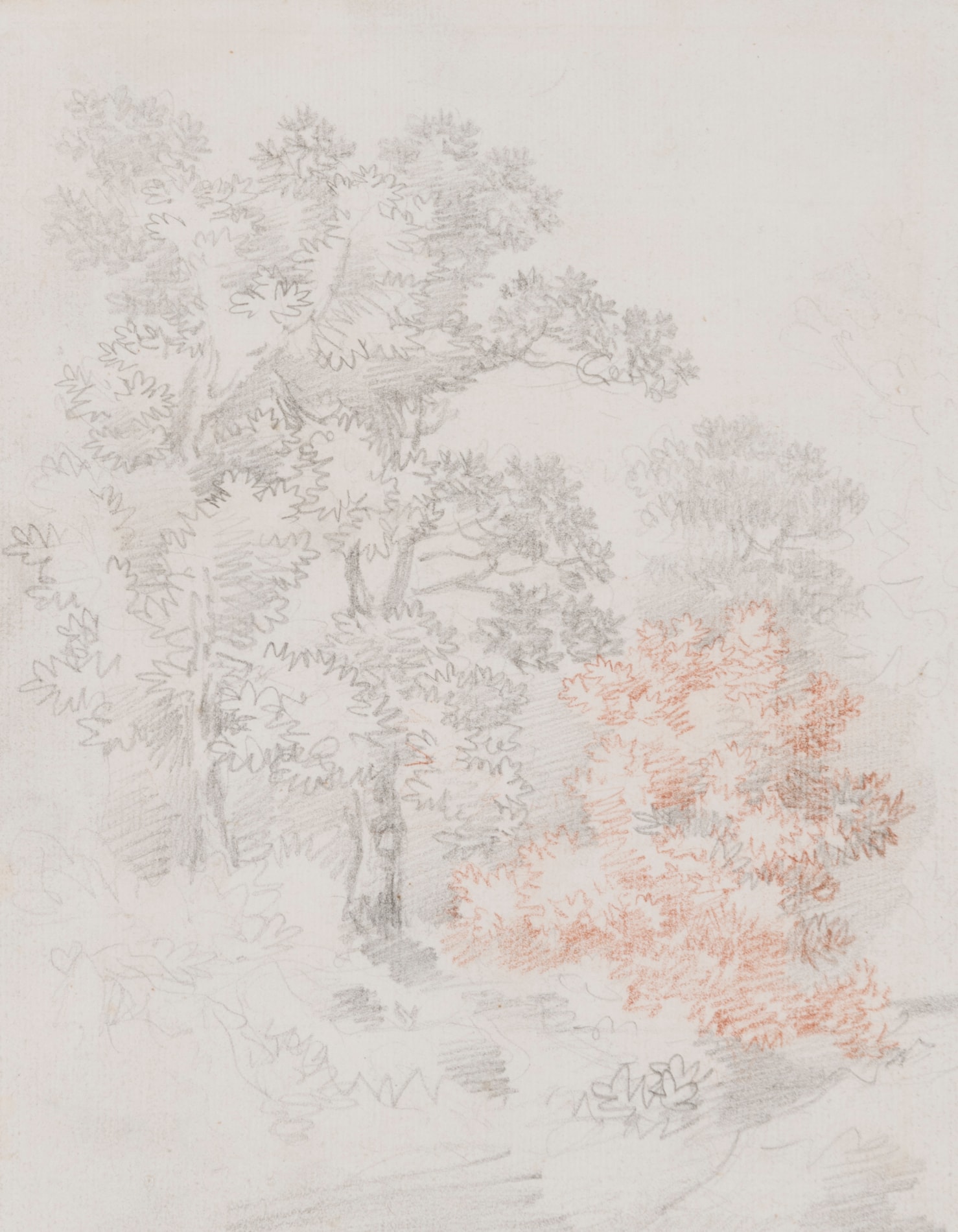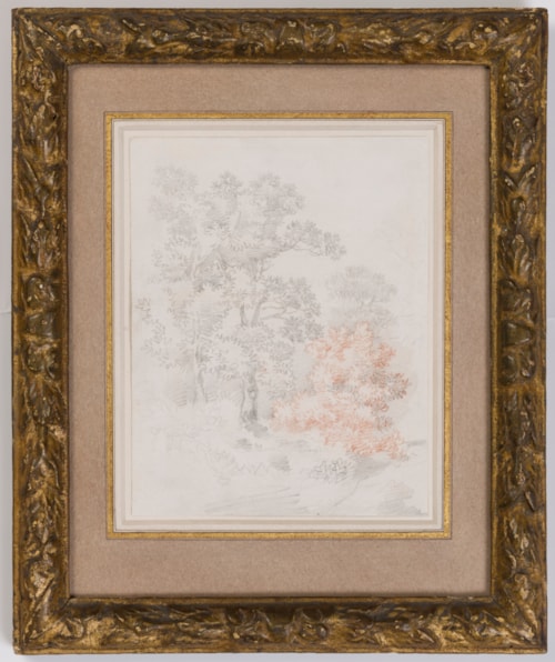 This rapidly drawn study of trees, previously unknown to scholars, may be dated to the early part of Gainsborough’s career, when he was living in his native Suffolk. It is probably from a small sketchbook, as its size is identical to several other early plein-air studies. The attribution of the present sheet has been confirmed by the Gainsborough scholar Hugh Belsey, who points out that it is a unique example among the artist’s early drawings in its use of a striking combination of pencil and red chalk.