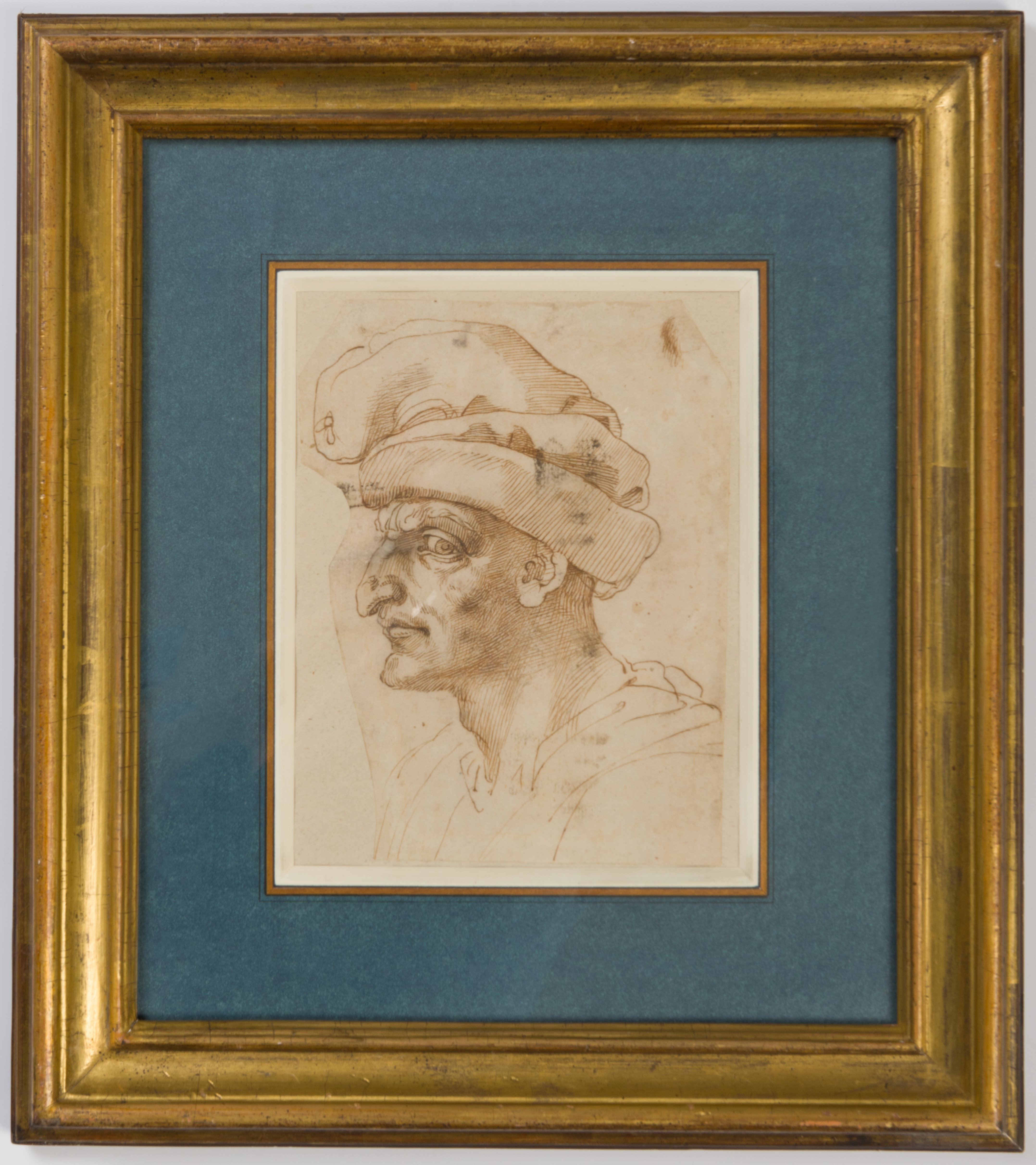As the Michelangelo scholar Charles de Tolnay has noted of the Ashmolean drawing, ‘It is a martial head with an intensely passionate expression, emphasised by the rolling eye with the pupil in the corner, the strong cheekbones, the curved nose, the energetic chin. The hat is similar to those worn by Italian warriors during the first half of the 15th century, around 1420-30...Michelangelo, however, has transformed the almost symmetrical form of the headgear into a hat reminiscent in silhouette of that of the ancient Phrygians, bringing the top forward.’ While it has been suggested that the head in Michelangelo’s powerful drawing may have been copied from a Quattrocento painting or fresco by an artist such as Andrea del Castagno or Masolino da Panicale, no precise source has been identified. As Paul Joannides has opined of the Ashmolean sheet, ‘It could, in principle, reflect a quattrocento portrait but, on balance, it seems more likely to be an invention “in the manner of” than a copy.’