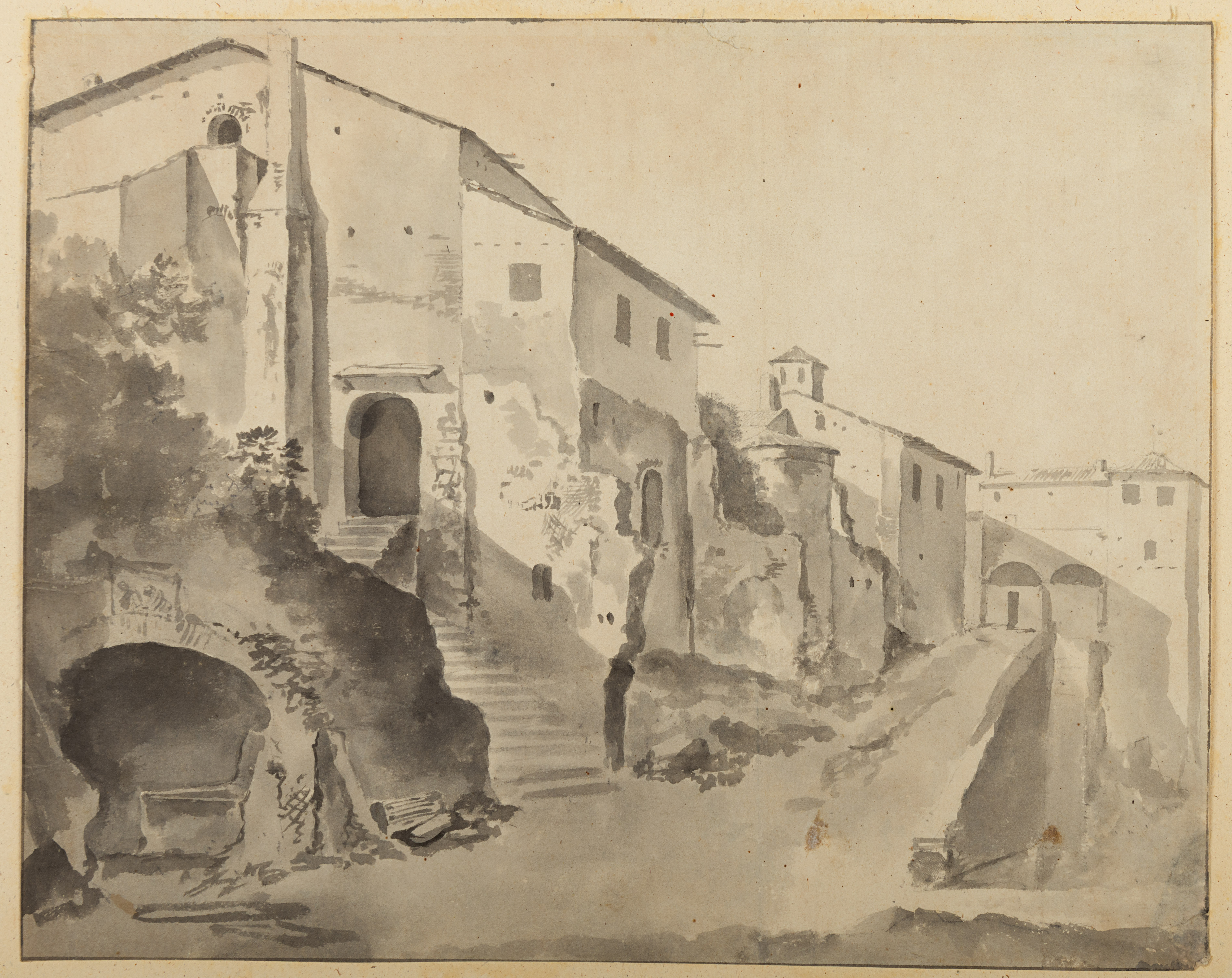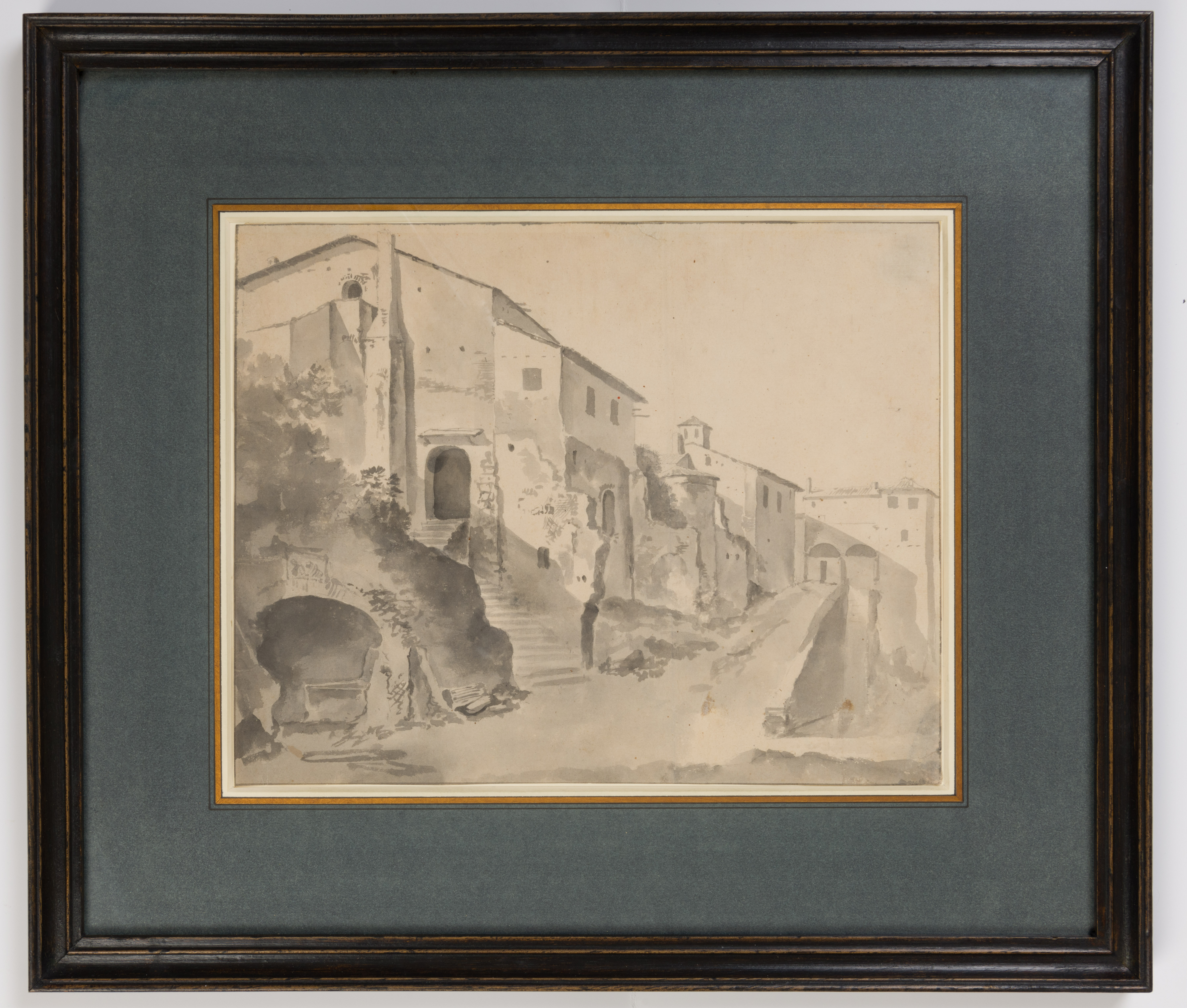 Thomas Wijck’s Italianate drawings are characterized by a talent for capturing light and atmosphere. As the scholar Robert Fucci has recently written of the artist’s landscape drawings, ‘These fascinate for their prosaic nature, especially since they differ so greatly from the majestic buildings portrayed in the majority of works by artists who sojourned to Rome and elsewhere in Italy. While Wijck occasionally drew larger structures, he focused more frequently on less distinguished edifices, and on architecture that might be old and full of character yet otherwise nondescript…Wijck made many of his drawings primarily in wash, using a remarkably controlled fine-pointed brush for details…, and generating delicate lighting effects in the more broadly-toned areas.’