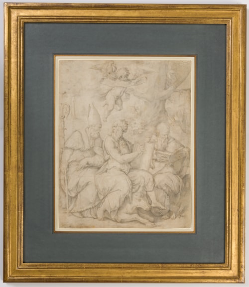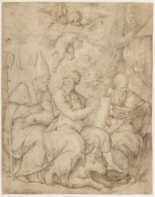 Datable to the middle of the 1540s, this fine drawing by Giorgio Vasari was in all likelihood a design for an altarpiece, although no related painting survives. As the Vasari scholar Florian Härb has noted, the figures in the present sheet are akin to those in the organ shutters painted by Vasari between 1545 and 1546 for the cathedral of San Gennaro in Naples. Indeed, the putto holding a scroll at the top of this drawing is repeated, with few differences, in the right-hand inner panel of the San Gennaro organ shutters. As Härb further points out, the present sheet may be likened to a pair of stylistically comparable drawings by Vasari of A Prophet (or Simeon?) and The Prophetess Anna, each with similar putti holding scrolls and also datable to c.1545, in a private collection.