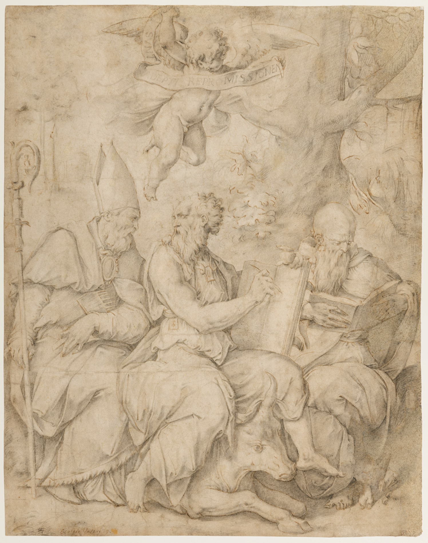 This drawing must have been highly regarded in Vasari’s day, as copies of it by two of his artistic contemporaries and followers are known. A variant of this composition, lacking the putto above and with other significant differences, particularly in the left-hand figure of Saint Blaise, is in the collection of the National Galleries of Scotland in Edinburgh, and has been attributed to Vasari’s pupil and assistant Cristofano Gherardi, known as Il Doceno (1508-1556). Another copy of this composition, drawn in pen and brown ink and wash, is found on the verso of a double-sided drawing by Giovanni Battista Naldini (1535-1591) in the Ashmolean Museum in Oxford.