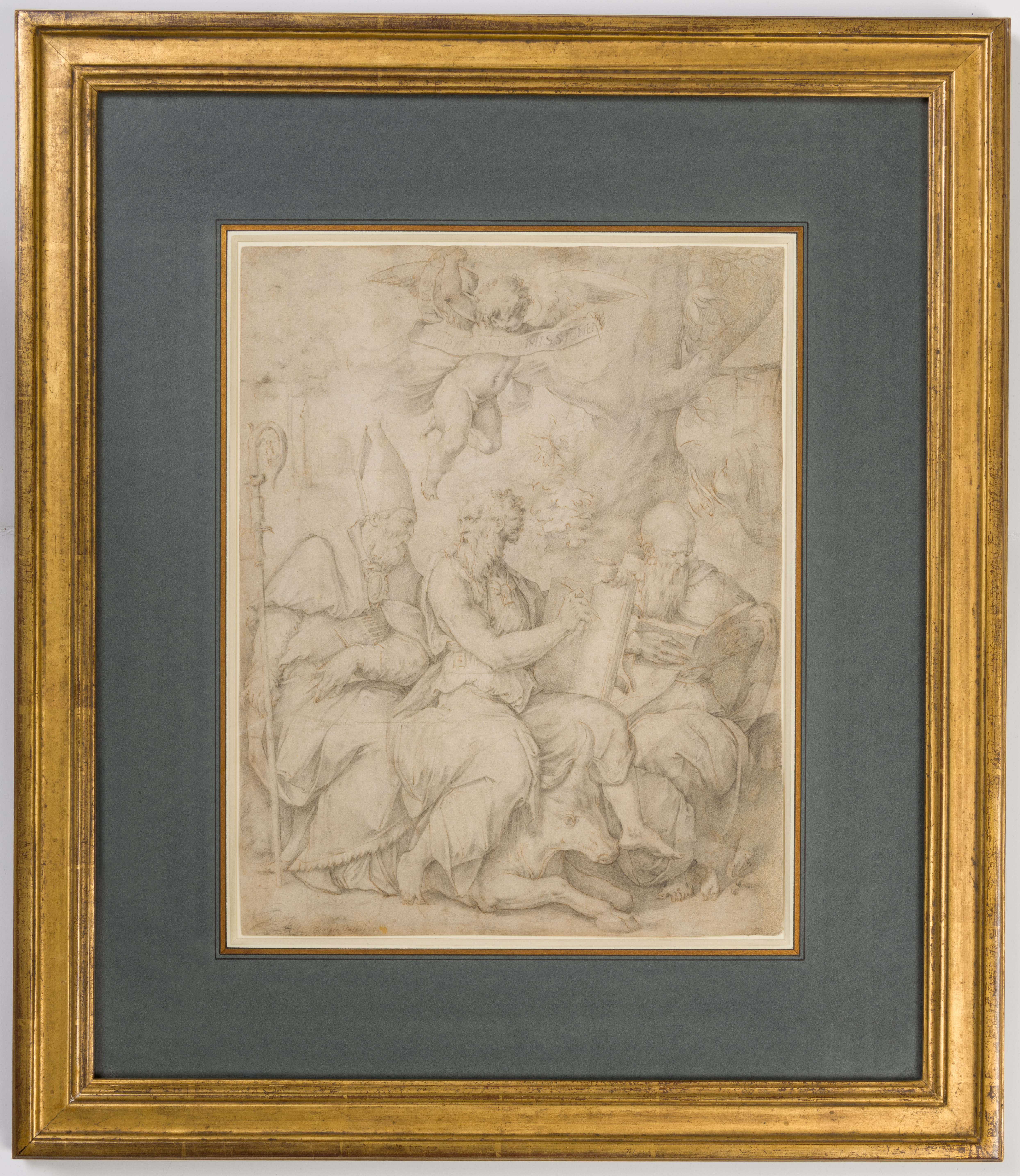 Datable to the middle of the 1540s, this fine drawing by Giorgio Vasari was in all likelihood a design for an altarpiece, although no related painting survives. As the Vasari scholar Florian Härb has noted, the figures in the present sheet are akin to those in the organ shutters painted by Vasari between 1545 and 1546 for the cathedral of San Gennaro in Naples. Indeed, the putto holding a scroll at the top of this drawing is repeated, with few differences, in the right-hand inner panel of the San Gennaro organ shutters. As Härb further points out, the present sheet may be likened to a pair of stylistically comparable drawings by Vasari of A Prophet (or Simeon?) and The Prophetess Anna, each with similar putti holding scrolls and also datable to c.1545, in a private collection.
