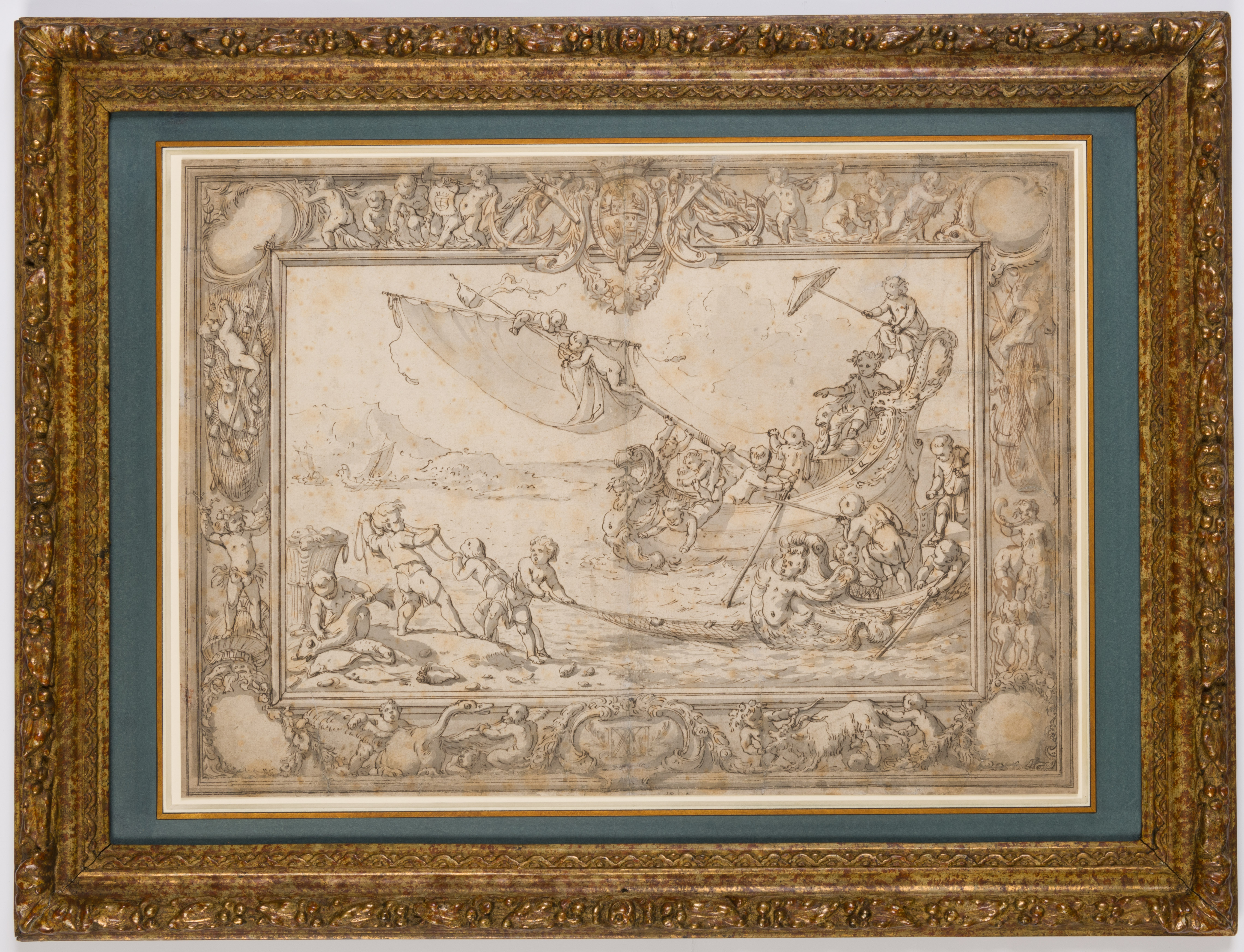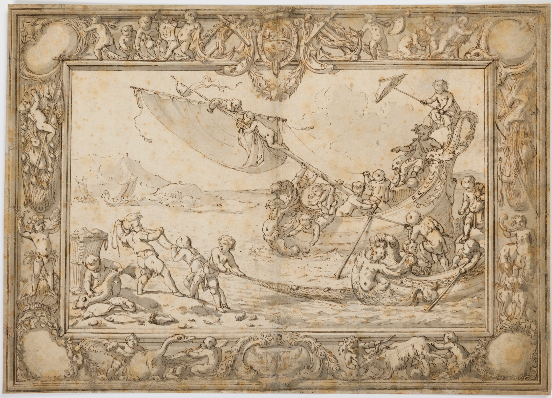 This large sheet represents the design for a lavish Baroque tapestry. The right-hand side of the panel shows a magnificent galleon, splendidly carved with a merman figurehead and manned by putti who are shown retrieving the sail and deploying oars in preparation of landing ashore. Seated on the throne-like raised stern, with one foot resting on a globe and shaded by a parasol, is a regally dressed putto, crowned with a laurel wreath, who may represent Bacchus. Standing ashore in the left foreground are further putti hauling in a fishing net and handling their catch, while in the right foreground appears the bow of a second ship, also manned by putti. The scene is framed by elaborate borders, centered to the top with the English Royal coat of arms, which provides a terminus ante quem for the drawing of before 1689. (The Royal Coat of Arms depicted in this drawing is the one that was in use between 1603, when James VI of Scotland assumed the throne of England as James I, and 1688.) The coat of arms, crowned and encircled by the Order of the Garter, is flanked by anchors wrapped with foliate garlands, while the lower border is centered by a cartouche with Roman letters. The corners are set with further cartouches, while the reserves show scenes of putti busying themselves with floral garlands, trumpets as well as hunting and fishing gear and trying to restrain a swan and a goat.