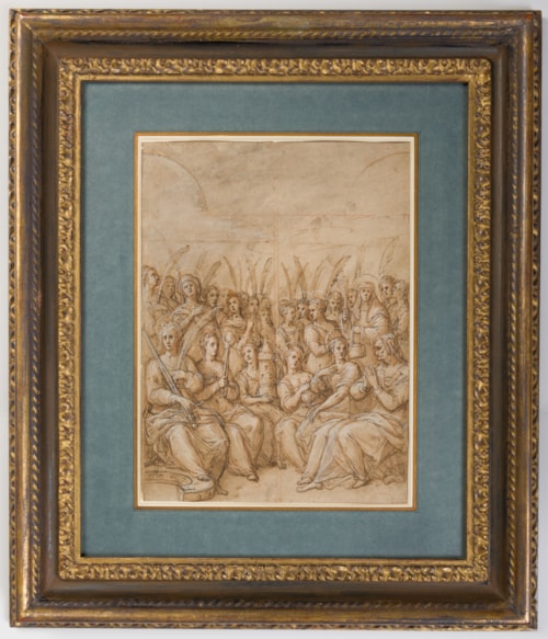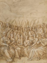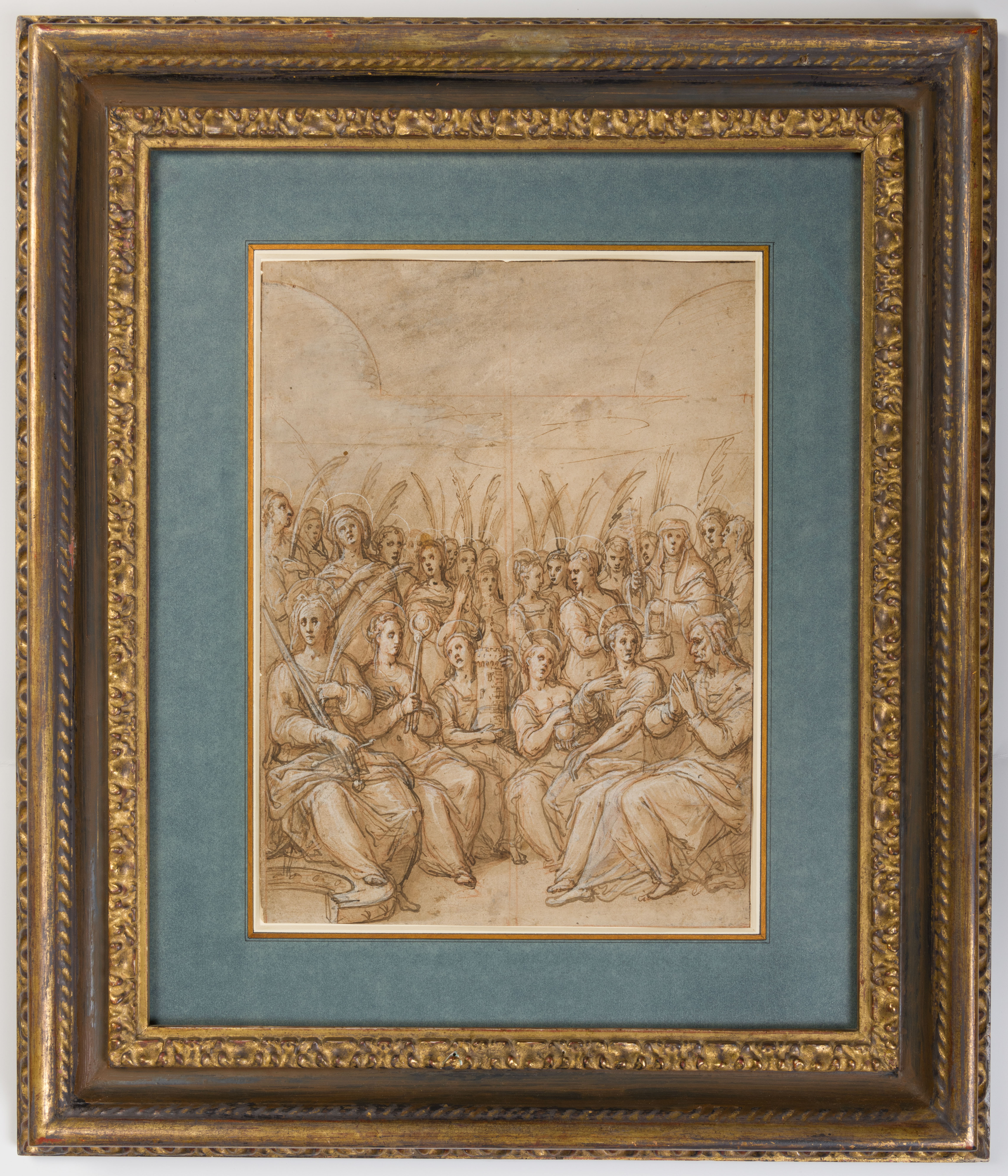 As John Gere had noted of this drawing, ‘Of the six seated saints in the front row, the three on the left can be identified from their attributes as Catherine of Alexandria, Agatha, and Barbara. The drawing cannot be connected with any known work by Federico. A group of female saints occurs in the northwest section of the cupola of the Duomo in Florence, but it occupies only one half of the width of the section and the figures are not grouped symmetrically as in the drawing.’ What may have been Zuccaro’s preparatory drawing for the outer wings of the same altarpiece or reliquary – a closely related sheet depicting A Group of Bishops, A Pope, A Cardinal and other Monastic Figures, of identical technique and dimensions to the present sheet – was on the Paris art market in 2004.
