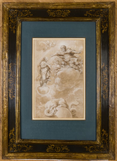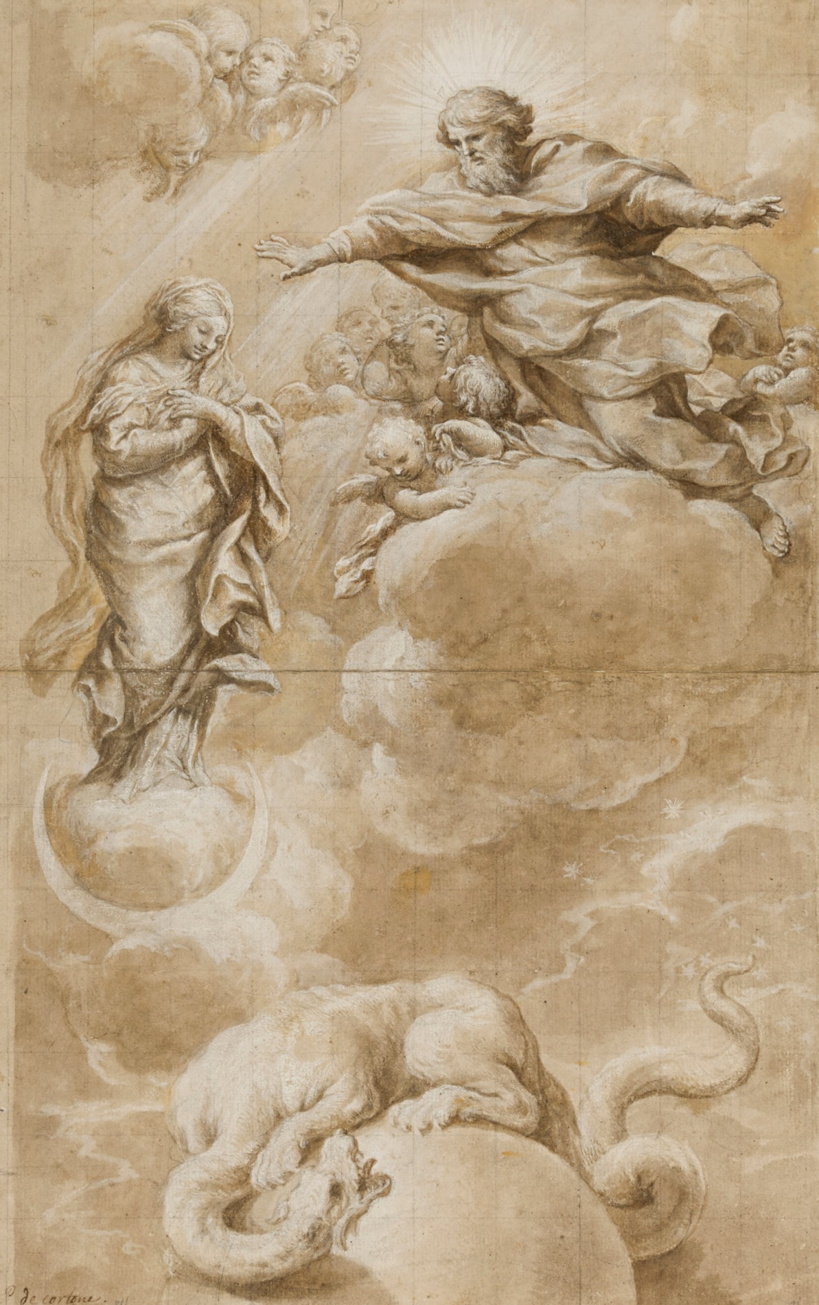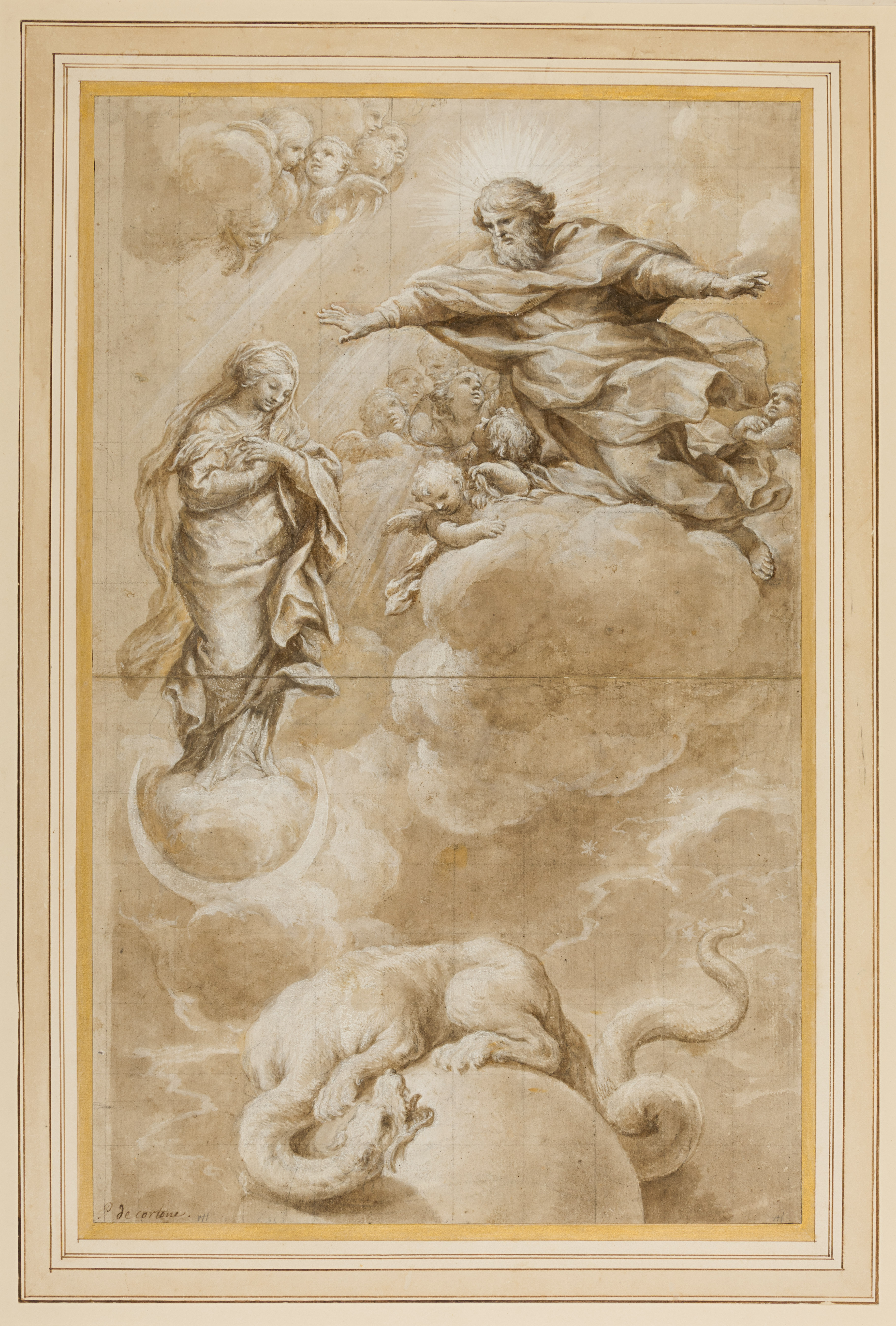This large drawing by Ciro Ferri, as Jörg Martin Merz was the first to point out, is a preparatory study for a large altarpiece of The Virgin Immaculate, commissioned in 1657 from Pietro da Cortona by Cardinal Luigi Capponi for the high altar of the church of San Filippo Neri (also known as the Chiesa Nuova) in Perugia; a church dedicated to the Immaculate Conception. The circumstances of the commission made clear that the design of the altarpiece and the painting of its most important parts were entrusted to Cortona, while the remainder of the work was to have been painted by his assistants – with Ferri mentioned in particular – working under the master’s supervision. Cortona indeed enlisted the assistance of Ferri in preparing for the project, and in March 1658 the Cardinal was shown, and approved, a finished drawing for the altarpiece, which may well have been the present sheet by Ferri. However, the painting remained unfinished at the time of Cardinal Capponi’s death in April 1659. Almost two years later, in February 1661, the cardinal’s nephew and heir, the Marchese Scipione Capponi, wrote to request that either Cortona or Ferri finish the altarpiece, which was eventually completed by the former later that year and installed in the church in July 1661.