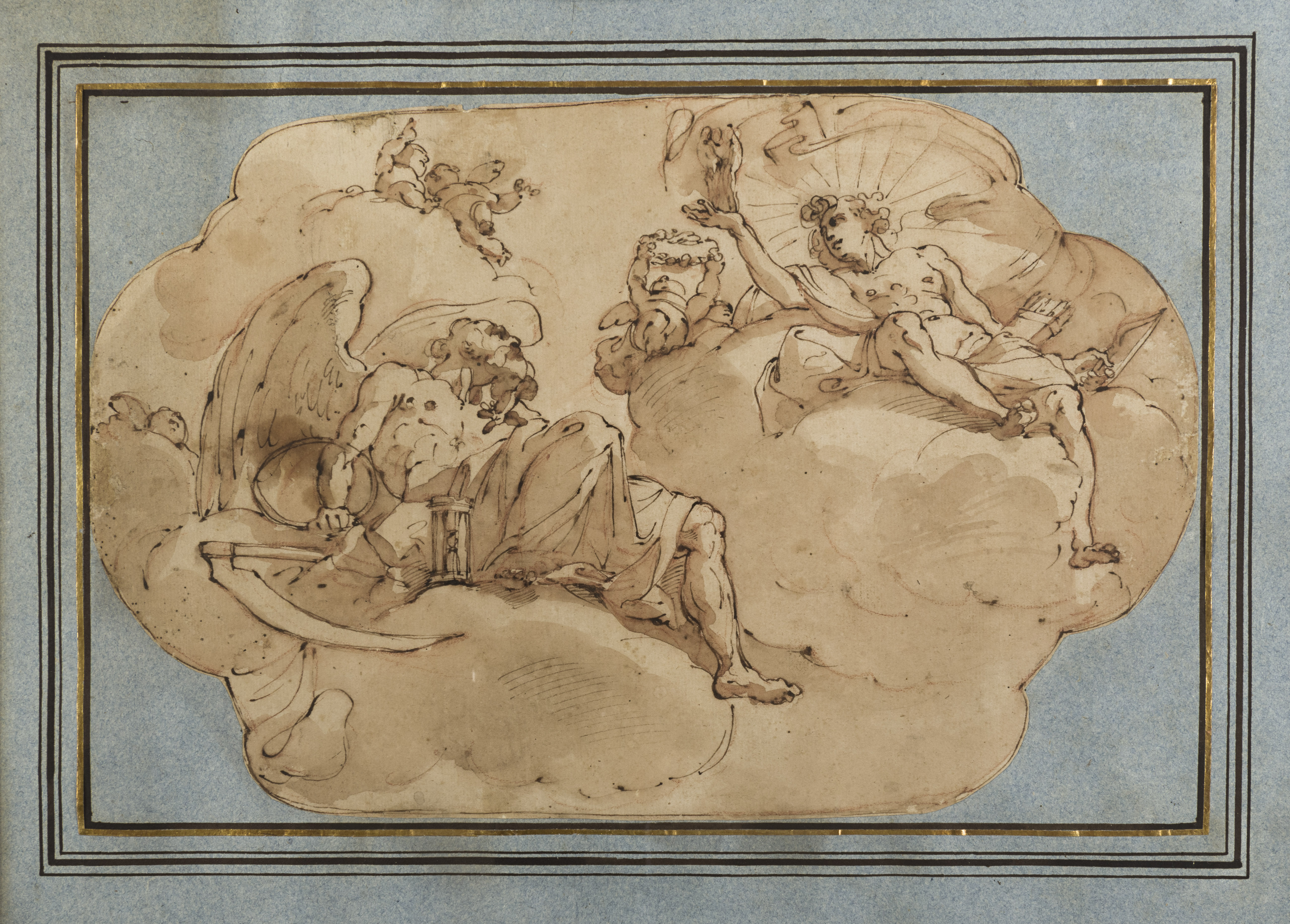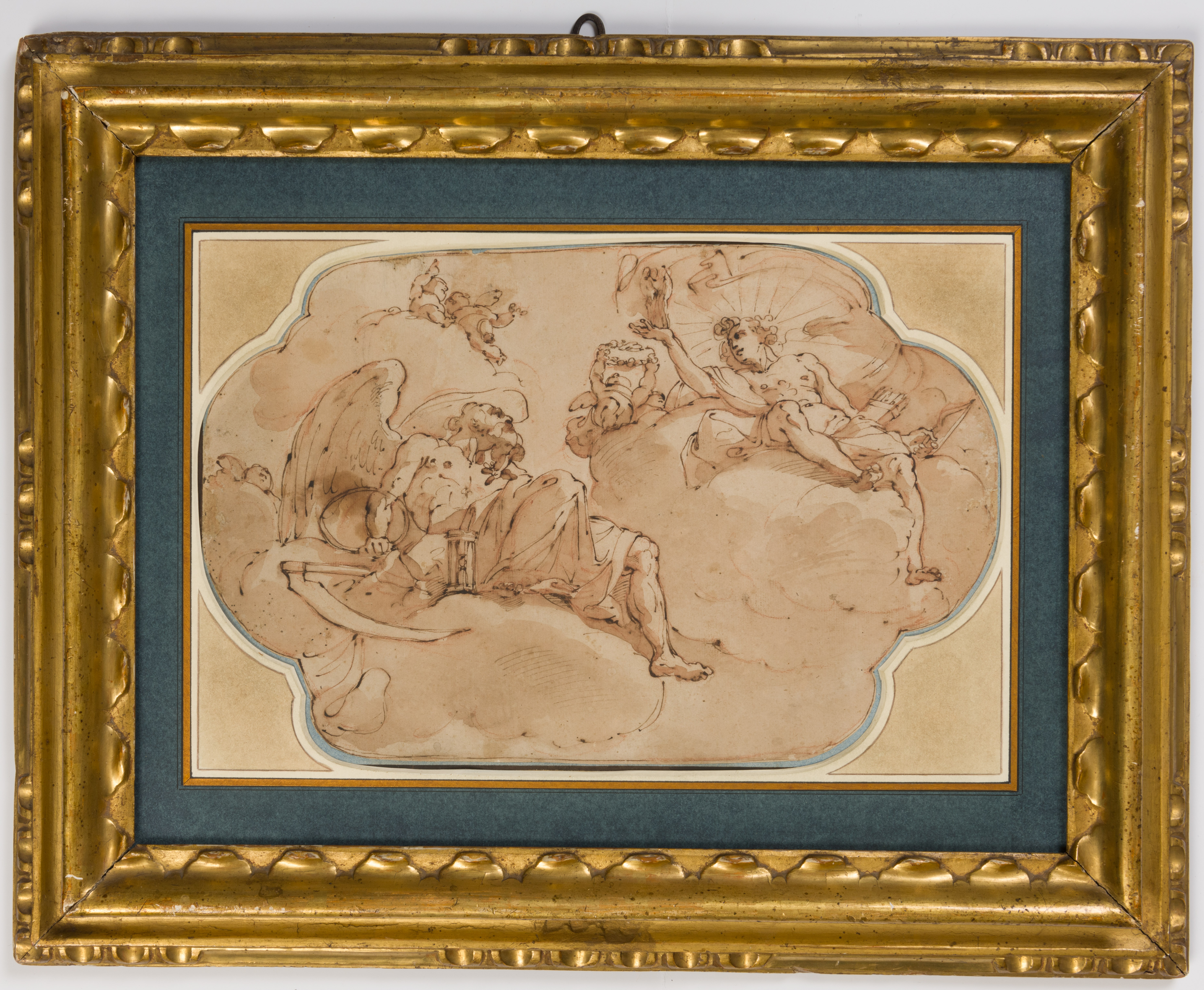 This is a finished preparatory study for Ubaldo Gandolfi’s ceiling fresco of Apollo and Chronos, painted in the first half of the 1770s in the Palazzo Bovio Silvestri in Bologna. Although the artist painted an extensive series of frescoes in two other rooms in the same palace, in collaboration with the quadraturisti Serafino Barozzi and Davide Zanotti, the ceiling fresco of Apollo and Chronos, which is in a private wing of the building, remains relatively little-known today. The composition of the present sheet is close to that of the final painting, which likewise shows Apollo holding a statue of the Three Graces in one hand and his bow in the other, while the winged Chronos is accompanied by an hourglass and a scythe. That Gandolfi had initially planned the fresco as a vertical composition, however, is seen in another extant study for it; a pen and ink drawing, of similar dimensions, in the Schloss Fachsenfeld collection in Stuttgart. A third pen and ink study of Chronos and Apollo, also vertical in orientation and with the positions of the protagonists reversed from the Stuttgart drawing, is in the Szépmüvészeti Múzeum in Budapest.