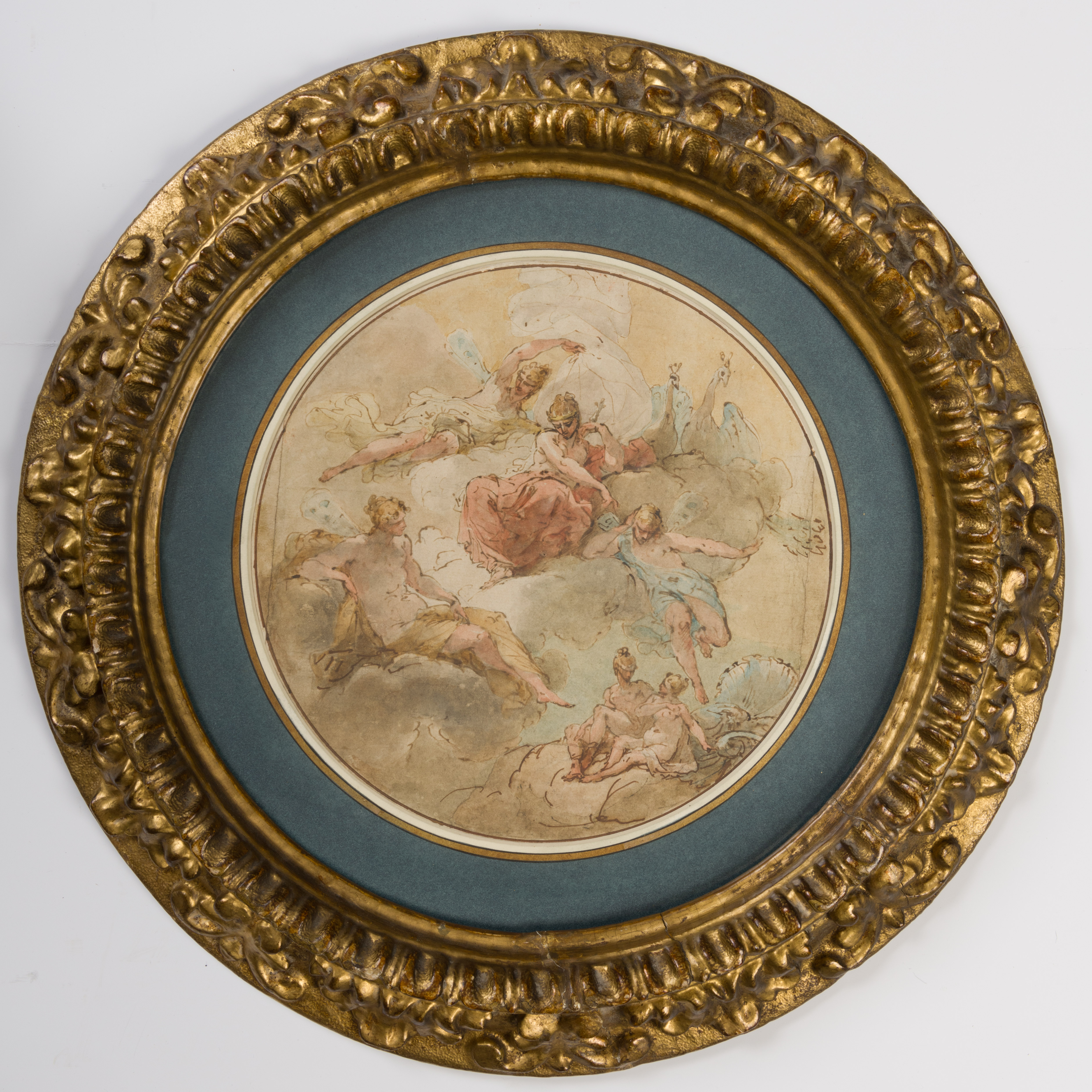 In medium, technique and handling, this drawing may be likened to a study of The Apotheosis of Venus(?), which was on the art market in 2001 and was in a private collection in Venice before recently being presented to the Musei Civici in Venice; that drawing is in turn a preparatory study for an easel painting by Pedrini in a private collection. Another stylistically comparable drawing is an ink and watercolour study of Venus and the Hours in the Museo Davia Bargellini in Bologna. A winged figure similar to that seen at the top of the present composition appears in a drawing by Pedrini of The Apotheosis of Hercules, formerly in the collection of the late John O’Brien and recently sold at auction, as well as in a study of The Muse Clio Crowned by Fame in the Schloss Fachsenfeld collection in Stuttgart.