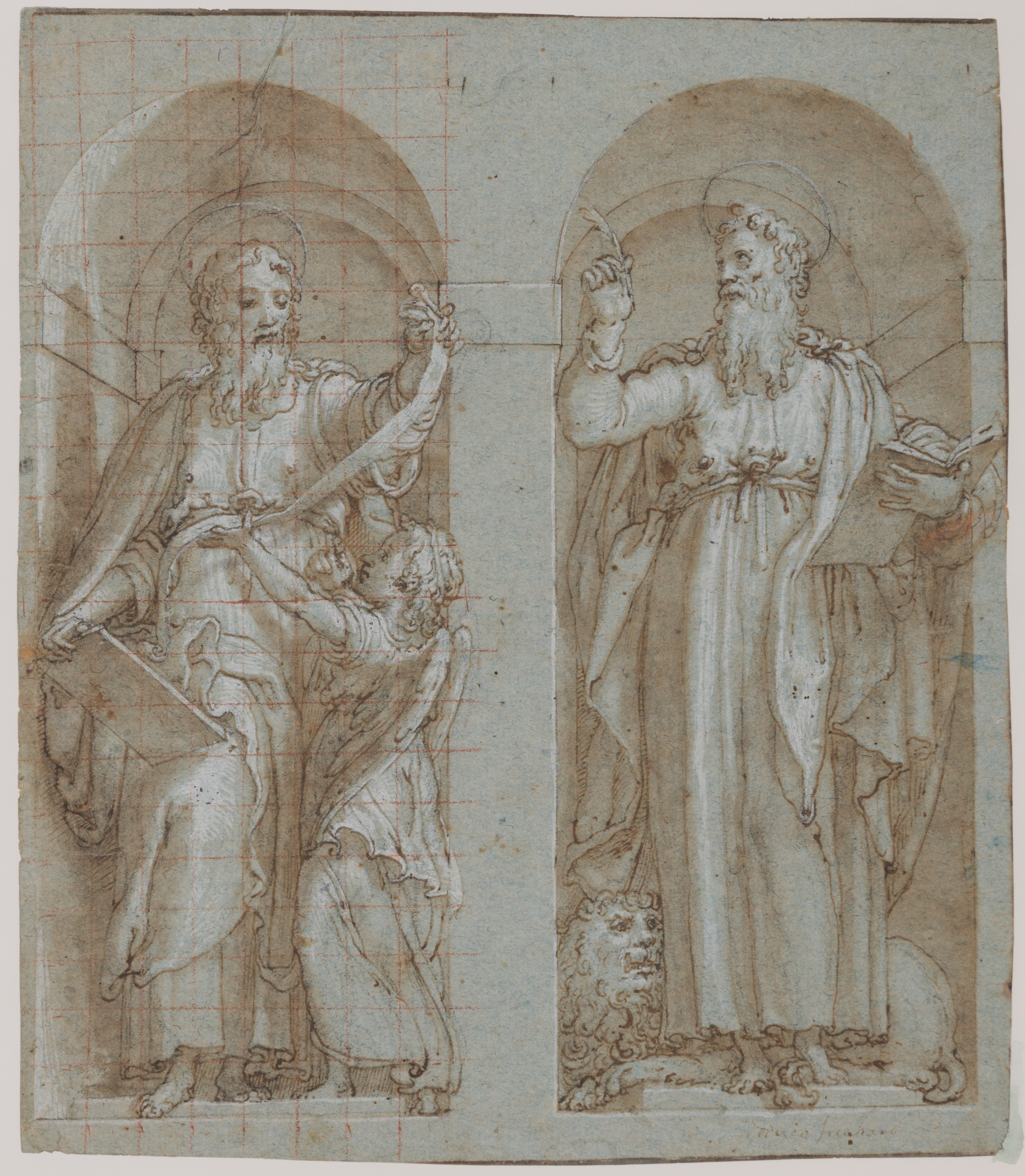The figure of Saint Matthew squared for transfer in red chalk.