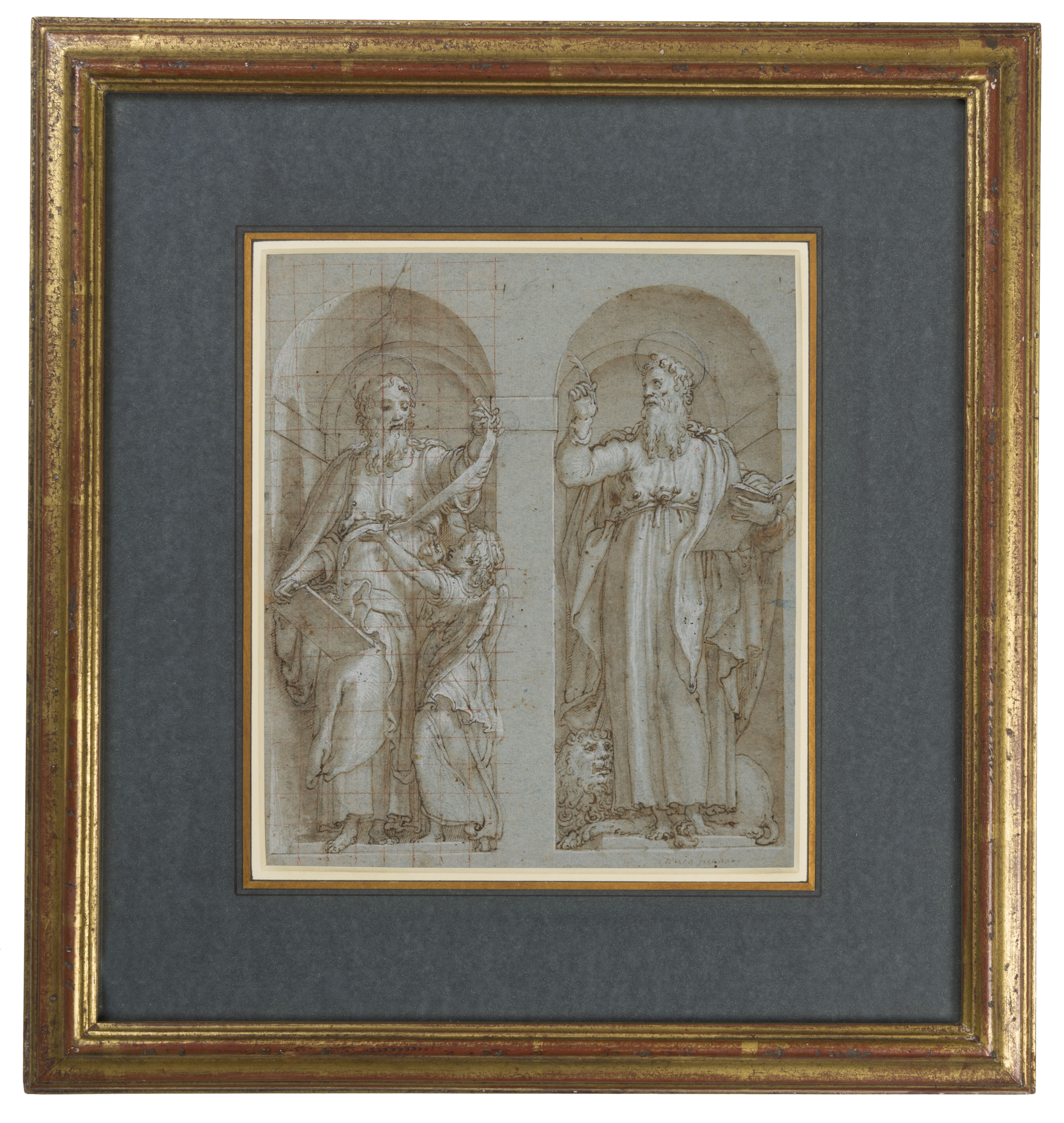 Formerly attributed to Federico Zuccaro, this drawing, toigether with its pendant, is a splendid example of Trometta’s graphic style. Both drawings can be identified as preparatory studies for one of the artist’s least known commissions; the fresco decoration of the Franciscan church and convent of the Capuchins in the town of Frascati, southeast of Rome. This small church, elevated to the rank of a pontifical chapel by Pope Gregory XIII, was lavishly decorated by the Pope and two of his nephews, Cardinals Filippo Boncompagni and Filippo Guastavillani, before its consecration in October 1578. Three new altarpieces were commissioned, including one by Girolamo Muziano and another by Trometta, along with a series of fresco paintings of the four Evangelists by the latter, set in false niches on the side walls of the single nave. These nave frescoes, only recently restored, were first attributed to Trometta by the scholar Alessandro Zuccari in 2006, and the existence of these two preparatory studies by the artist serves to confirm the attribution of the mural paintings.
