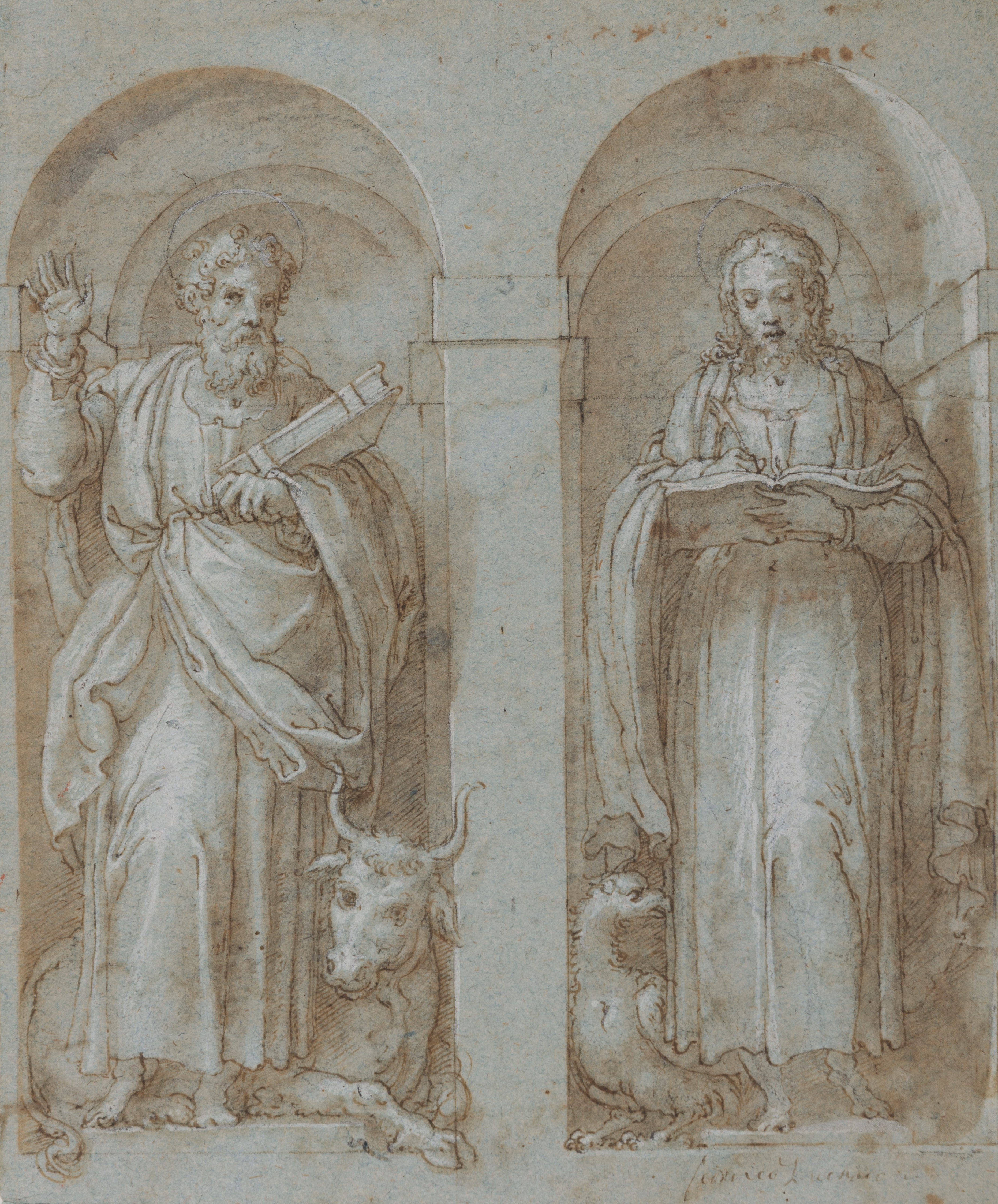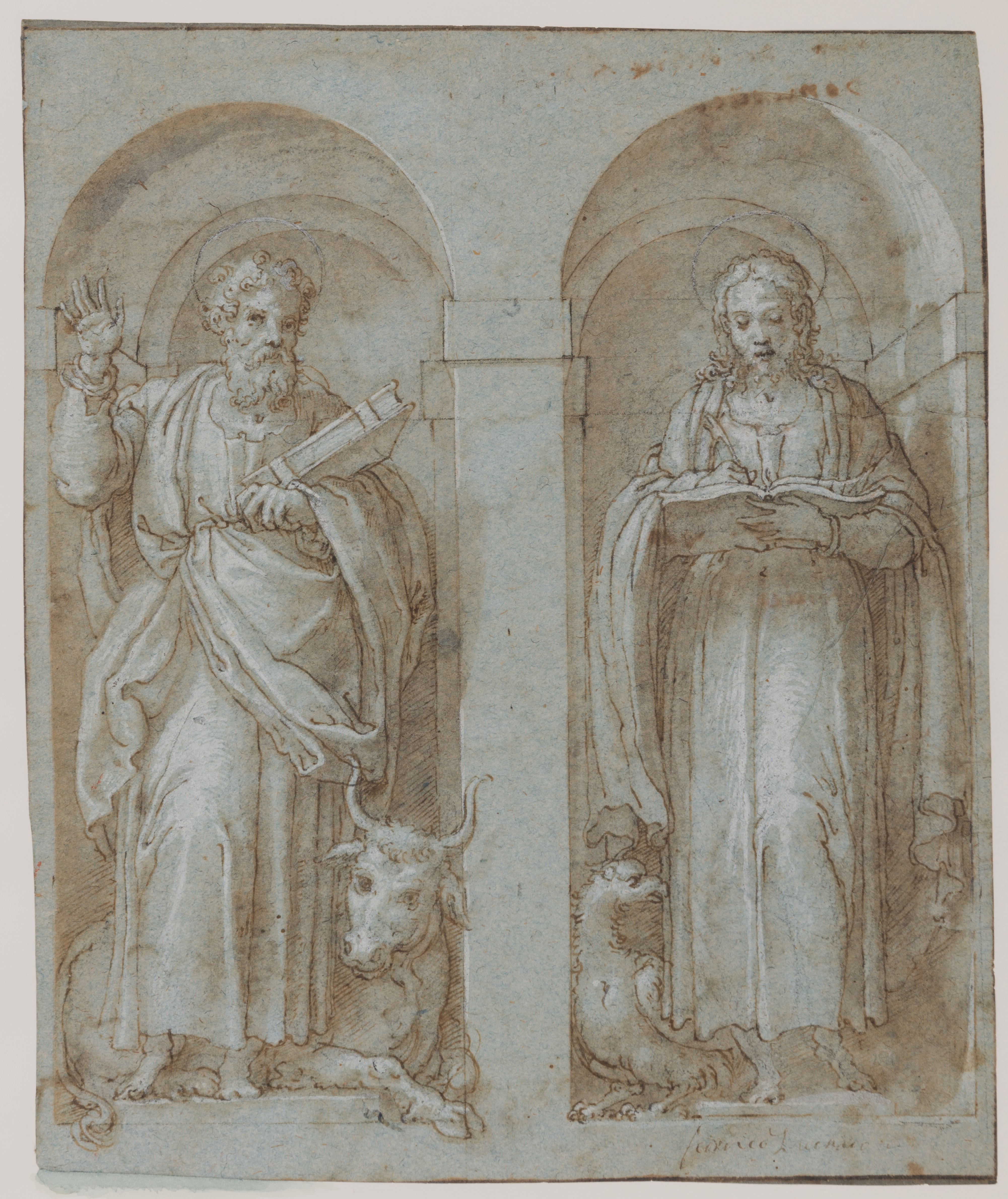 Another drawing by Trometta of Saint Luke the Evangelist standing in a niche, possibly a first idea for the Frascati commission, is in the collection of the Harvard University Art Museums in Cambridge, Massachusetts. A drawing of a standing prophet or evangelist in a niche, also possibly related to the same commission, is in the Biblioteca Ambrosiana in Milan.