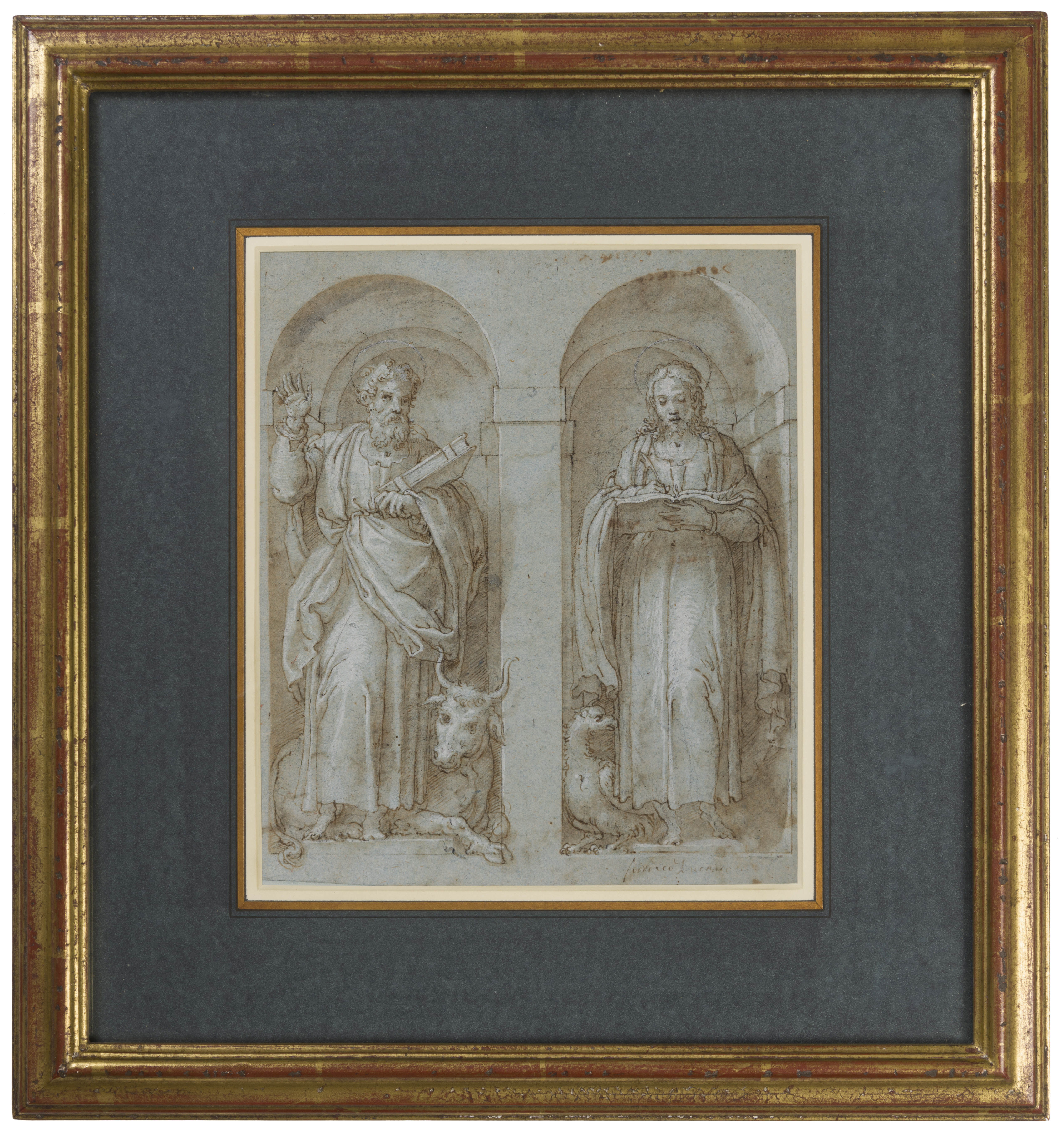Like its pendant, the present sheet can be identified as a preparatory studiy for Tronetta's fresco decoration of the Franciscan church and convent of the Capuchins in the town of Frascati, southeast of Rome. This small church, elevated to the rank of a pontifical chapel by Pope Gregory XIII, was lavishly decorated by the Pope and two of his nephews, Cardinals Filippo Boncompagni and Filippo Guastavillani, before its consecration in October 1578. Three new altarpieces were commissioned, including one by Girolamo Muziano and another by Trometta, along with a series of fresco paintings of the four Evangelists by the latter, set in false niches on the side walls of the single nave. These nave frescoes, only recently restored, were first attributed to Trometta in 2006, and the existence of these two preparatory studies by the artist serves to confirm the attribution of the mural paintings.