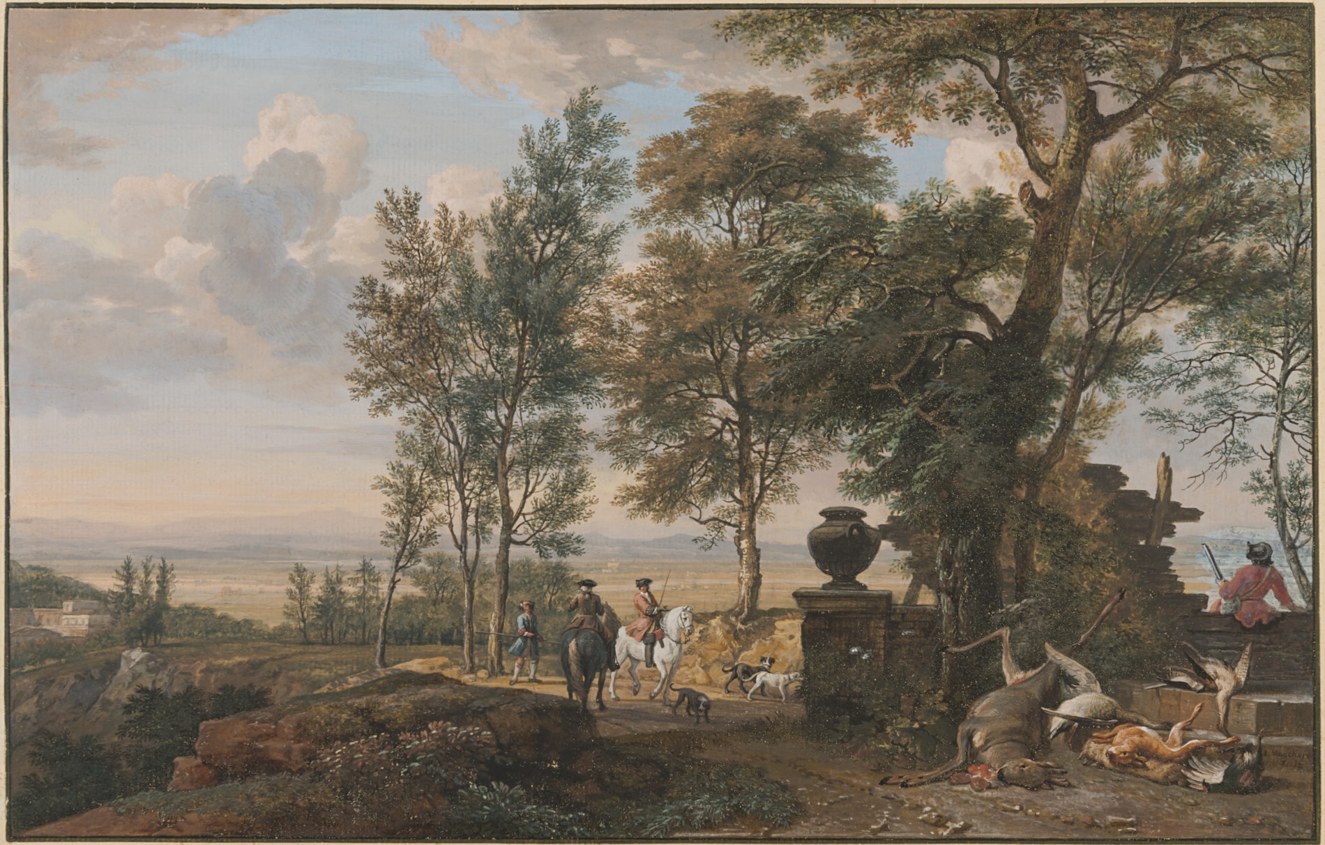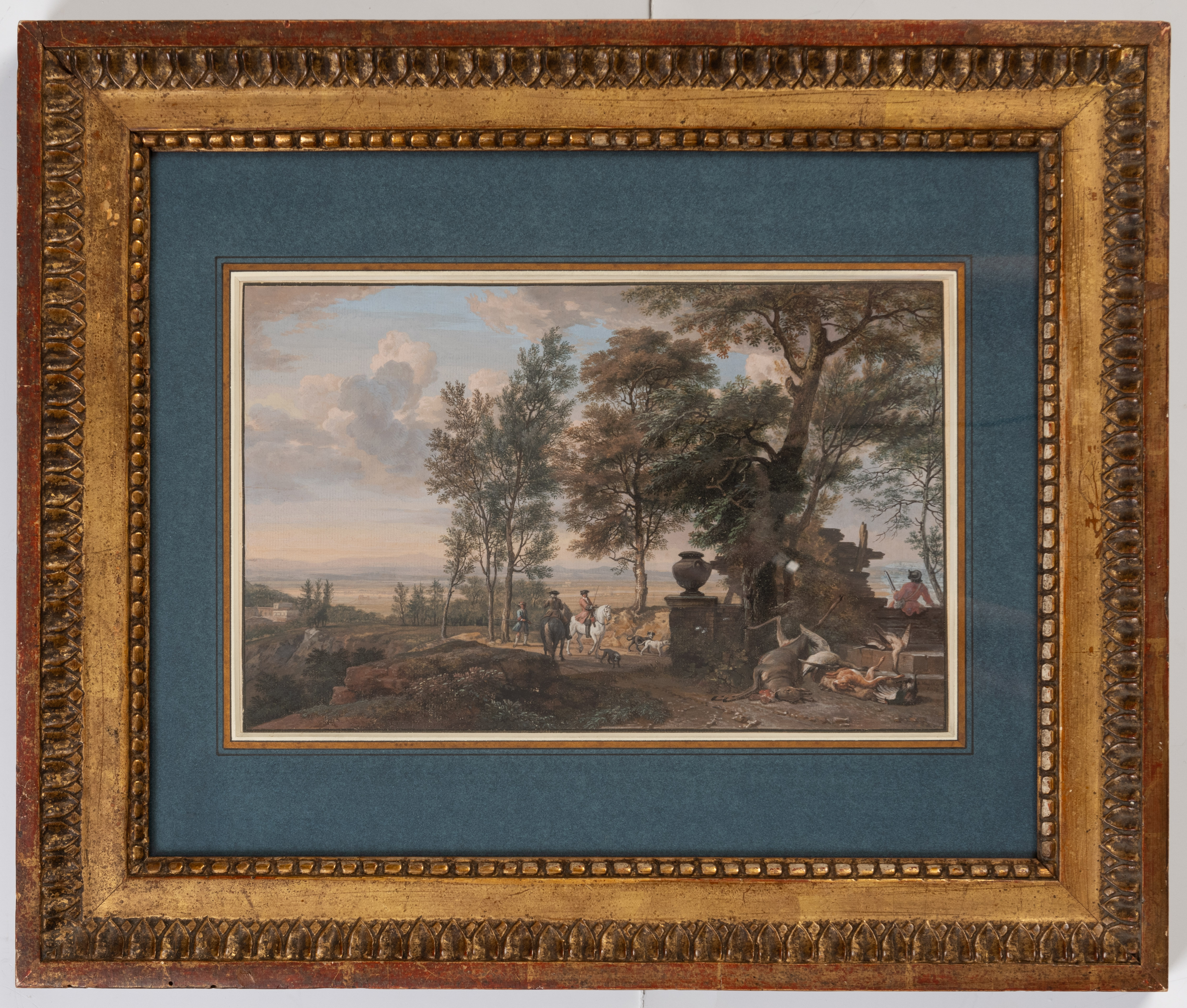 His posthumous sale, Amsterdam, Pierre Yver, 31 October 1774 onwards, lot 152 (‘Paysage, orné d’un Retour de Chasse; on voit, à droite, sur le devant, du Gibier Mort &, dans le Lointain des Montagnes. Ce Morceau est à gouache, très terminé & imite bien la Nature.’, bt. Oets for 116 fl.)