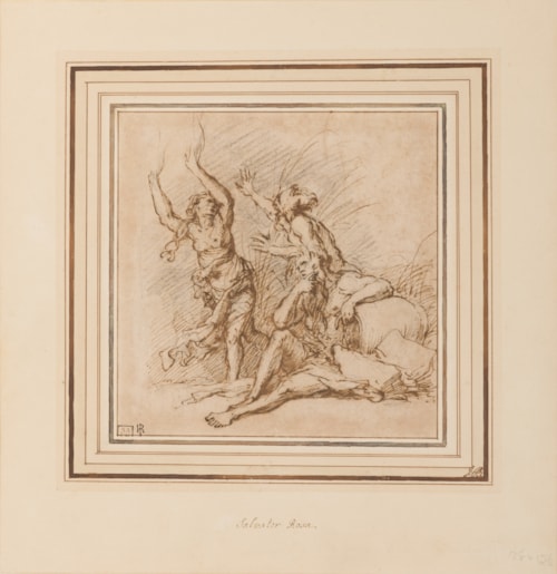 Rosa was a remarkable draughtsman, and his spirited, exuberant drawings were highly praised by connoisseurs even in his own day. The bulk of the nine hundred or so surviving drawings by the artist are figure studies, usually in his preferred medium of pen and ink, and often enlivened with touches of wash. Many of the drawings from the early part of his career are signed, and these may have been sold to collectors or presented as gifts to friends or patrons. However, almost no signed drawings dating from after 1649 exist, and it has been suggested that, after his return to Rome, Rosa chose to keep most of his drawings for himself, and not part with them.