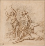 The present sheet differs from the finished painting is depicting the river god at the lower right, rather than at the left, and placing a bit more space between the two main figures. The only other known preparatory drawing by Rosa for the Caldaro painting, a pen and ink sheet in the collection of the Princeton University Art Museum includes a study for the upper part of the figure of Syrinx, but shows her with her arms spread wide. A drawing of a seated river god in red and black chalk, in the Museum der bildenden Künste in Leipzig, has recently been posited as an early preparatory study for the river god at the lower left of the painted composition.
