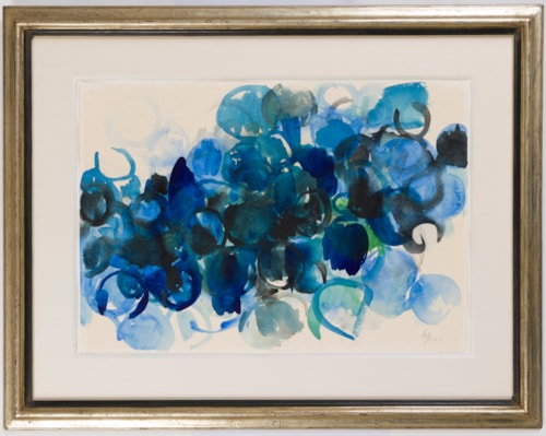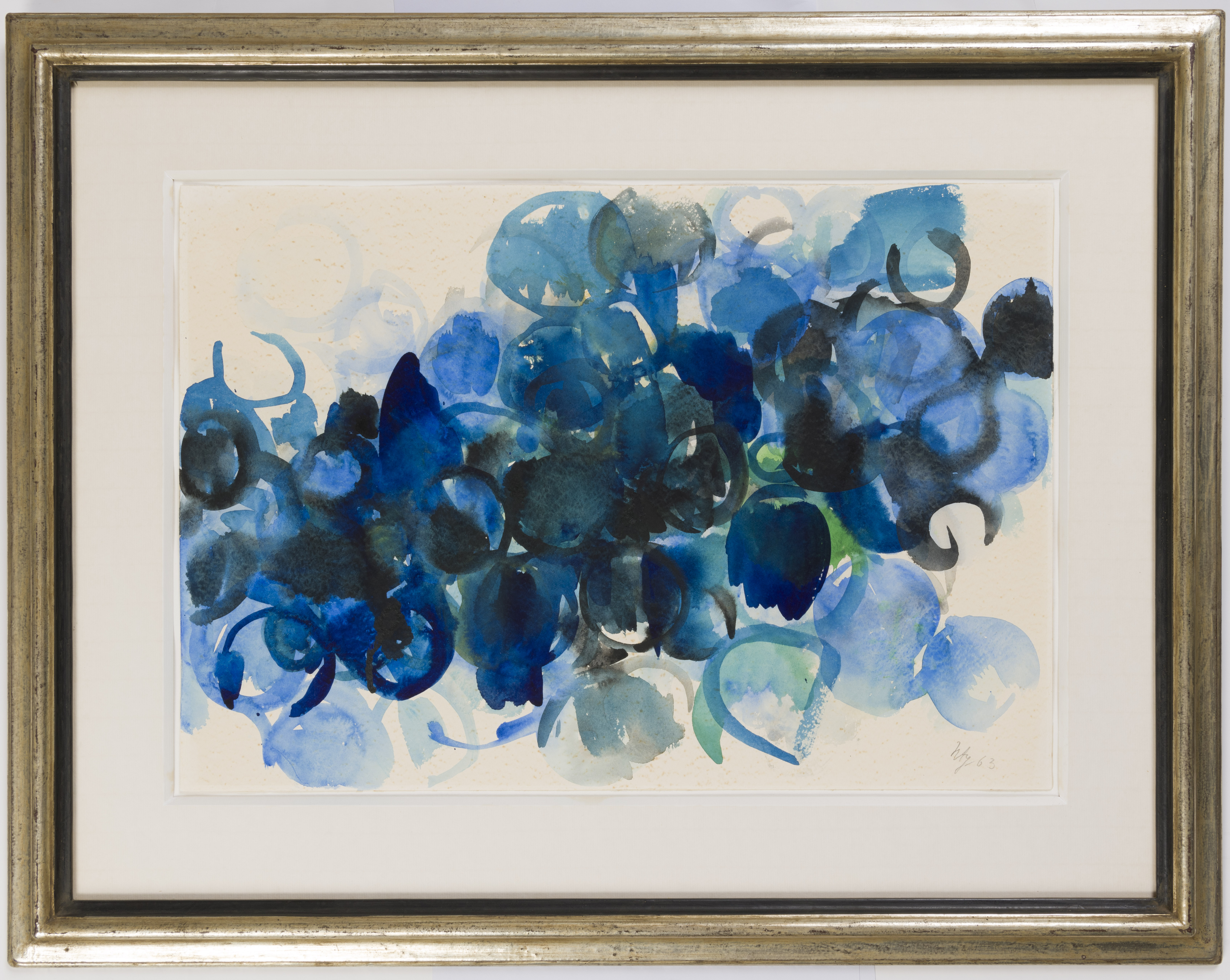 This large watercolour by Ernst Wilhelm Nay may be associated with a group of abstract works on paper produced during the second half of the 1950s and the first half of the 1960s, in which rounded or circular shapes (which the artist referred to as ‘discs’) are repeated to create an almost floral effect. These works are closely related to both the artist’s critically acclaimed 'Scheibenbildern', and the successive series of 'Augenbilder', or ‘eye paintings’ of 1963-1964, in which the disc motifs were developed into eye-like forms. Executed in 1963, the year in which Nay undertook a long trip to California and Mexico, this untitled watercolour may be likened to several works of this period in which a bluish tonality is predominant, such as Ohne Titel (Aquarellstudie Blau) of 1956, Aquarell Blau of 1958, Ohne Titel of 1960 and Ohne Titel (Aquarell Blau) of 1962, all in private collections. A particularly close comparison may be made with a large watercolour of the same date and dimensions, entitled Composition 2, formerly in the Rockefeller collection and sold at auction in New York in 2018.