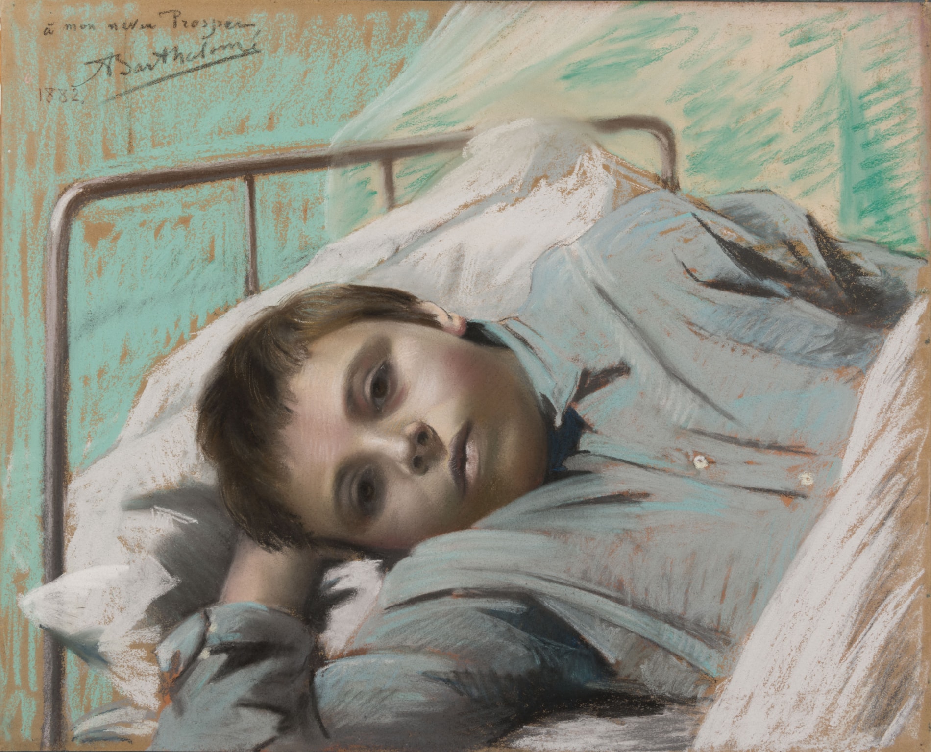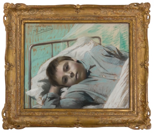The young subject of this superb pastel, Prosper Raymond de Fleury (1880-1960), was Bartholomé’s nephew by marriage. Although the present sheet is dated 1882 (possibly by a different hand from that of the artist), Thérèse Burollet, in her recently published catalogue raisonné of the artist’s works, has dated this pastel to 1887, which would accord better with the apparent age of the sitter. The eldest child of Prospérie de Fleury Bartholomé’s brother Olivier de Fleury, Georges-Marie Prosper Raymond de Fleury was born on 23rd April 1880 and appears in two other works by his uncle. A painting of him as a baby, accompanied by a nurse, was exhibited at the Salon in 1881 and is today in a private collection in Switzerland, while a pastel portrait of Prosper de Fleury at the age of three, wearing a sailor suit, is in a French private collection.