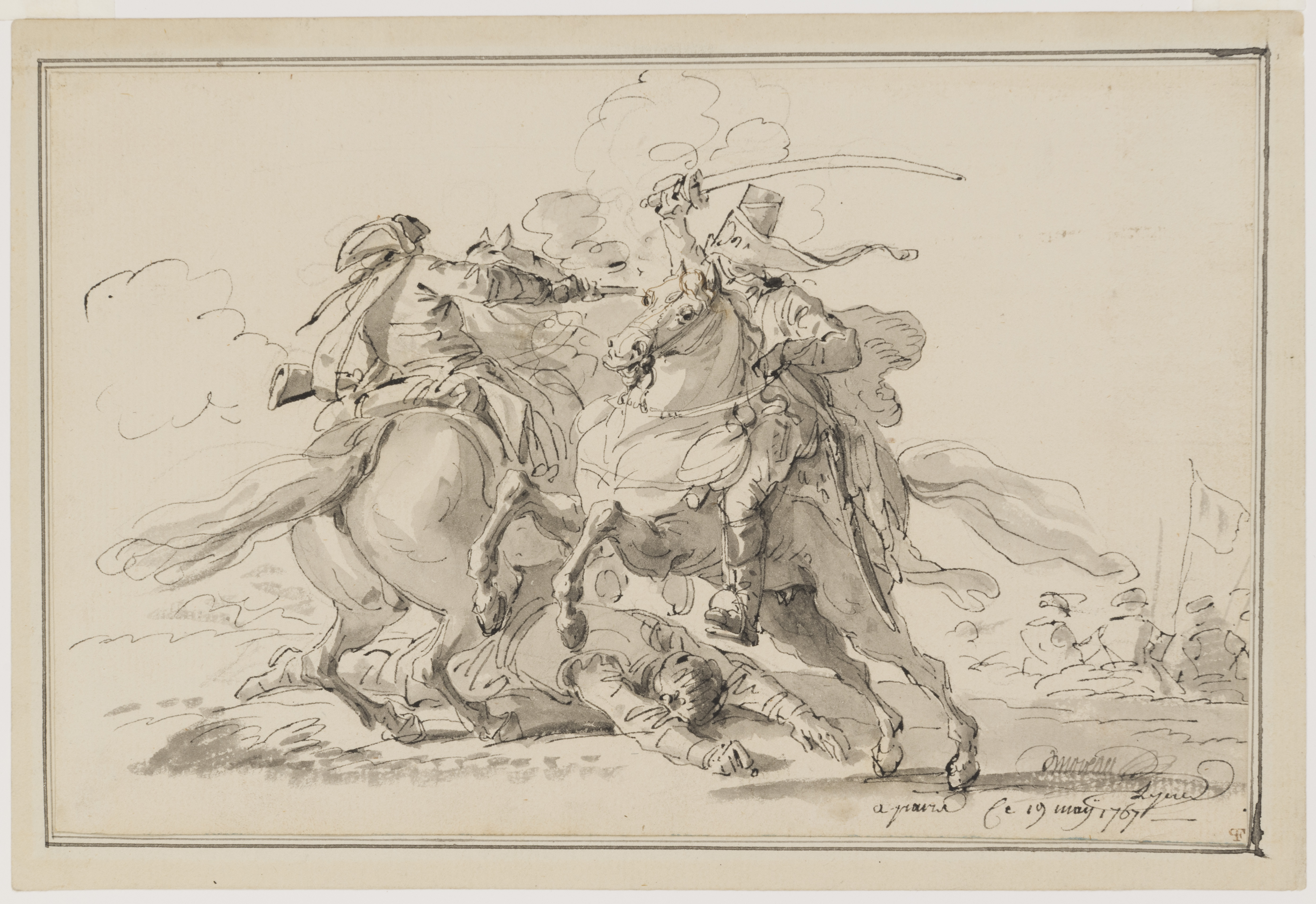 The present sheet depicts a martial subject that is rare among Moreau the Younger’s corpus of drawings. A youithful work by the artist, the drawing is signed and fully dated the 19th of May 1767, and must have been intended as an autonomous work of art for sale.