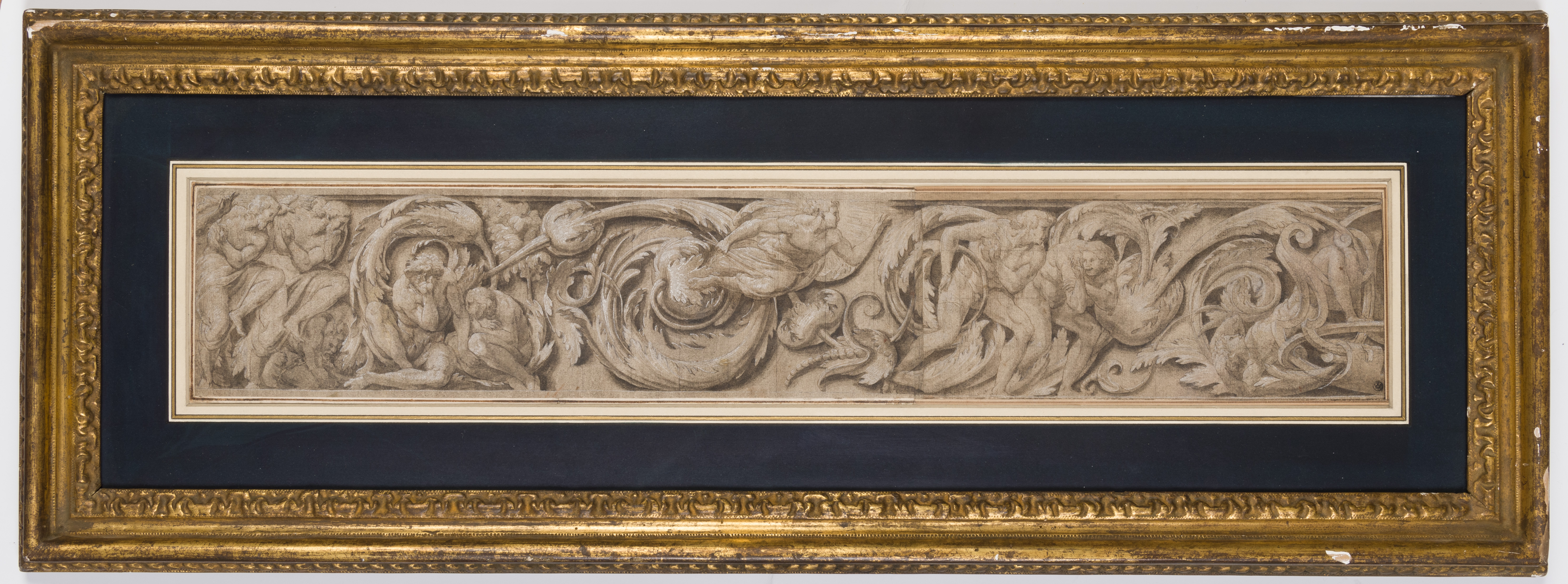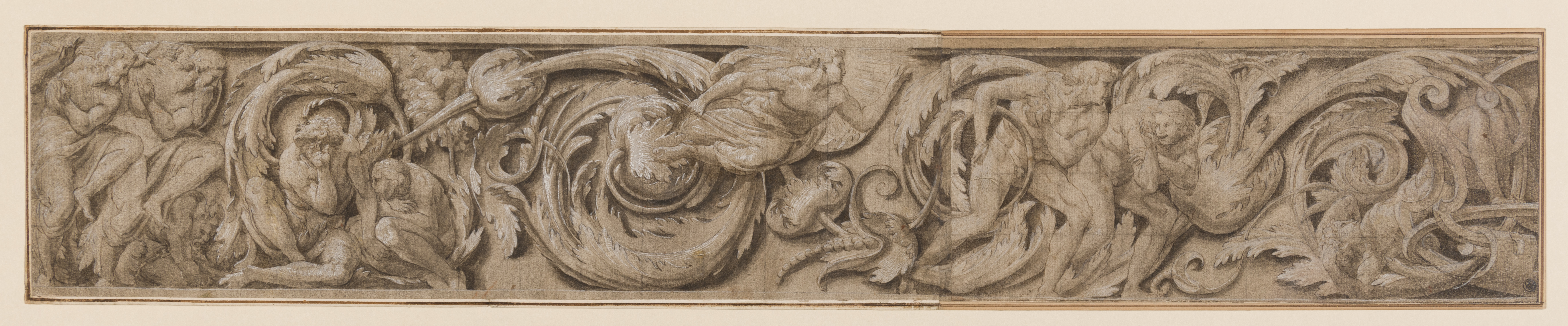 This highly finished drawing is a fine and typical example of Lelio Orsi’s technique as a draughtsman. Although unrelated to any surviving work by the artist, it may be grouped with several similar designs for frieze decorations by the artist, all for apparently the same project; in the Uffizi in Florence, the Musée des Beaux-Arts et d’Archéologie in Besançon, the Musée des Beaiux-Arts in Lille, and at Kingston Lacy in Dorset. All of these drawings depict figures among acanthus leaf scrolls with Biblical or mythological subjects. The present sheet is the largest of this group. Roberto Salvini has dated these drawings to c.1563, but Vittoria Romani has suggested an earlier dating to between 1554 and 1555, shortly after Orsi’s stay in Rome.