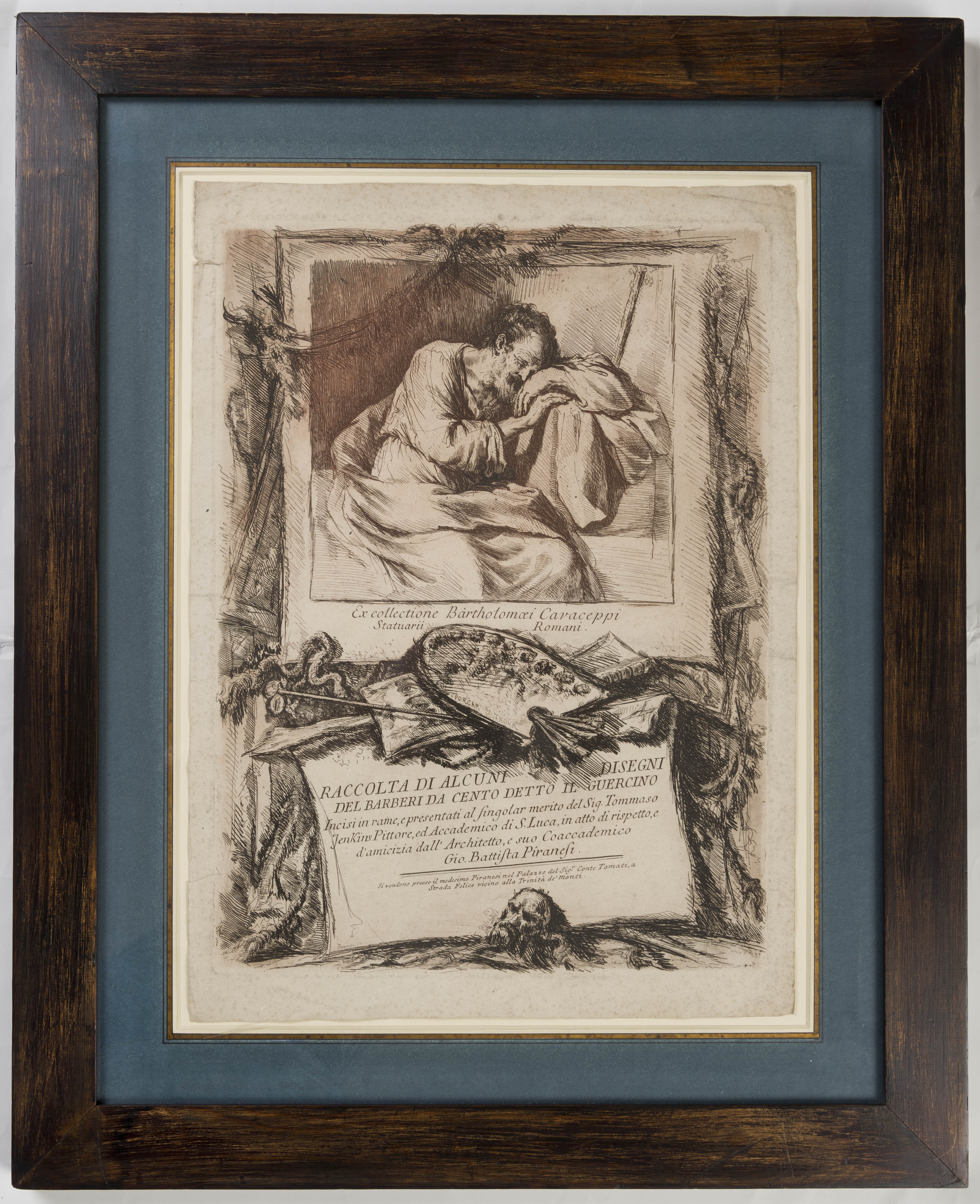 This large print by Giambattista Piranesi served as the frontispiece to the Raccolta di Alcuni Disegni del Barberi [sic] da Cento detto Il Guercino; a series of twenty-eight etchings after drawings by the 17th century Giovanni Francesco Barbieri, known as Guercino (1591-1666) and a handful of other artists. The series was published by Piranesi in Rome in 1764, although he only etched this frontispiece and three of the plates; two after drawings by Guercino in his own collection and one after a drawing by Pier Leone Ghezzi. The remainder of the plates in the volume were etched by other printmakers, in particular Francesco Bartolozzi, who was responsible for the bulk of the etchings, as well as Aureliano Milani and Giovanni Ottaviani. Each of the twenty-one etchings after Guercino in the series noted the name of the owner or the location of the original drawing. While most of the drawings reproduced in the volume were in Venetian collections, a few were from the vast corpus of Guercino drawings that at the time were still held at the Casa Gennari, the home of the artist’s heirs in Bologna. These were the work of Bartolozzi, who seems to have sold the plates to Piranesi before his departure for England in 1764.