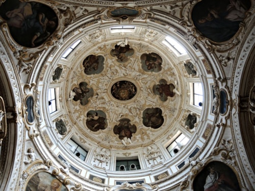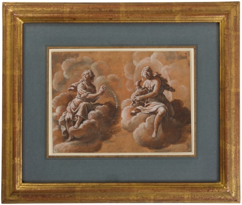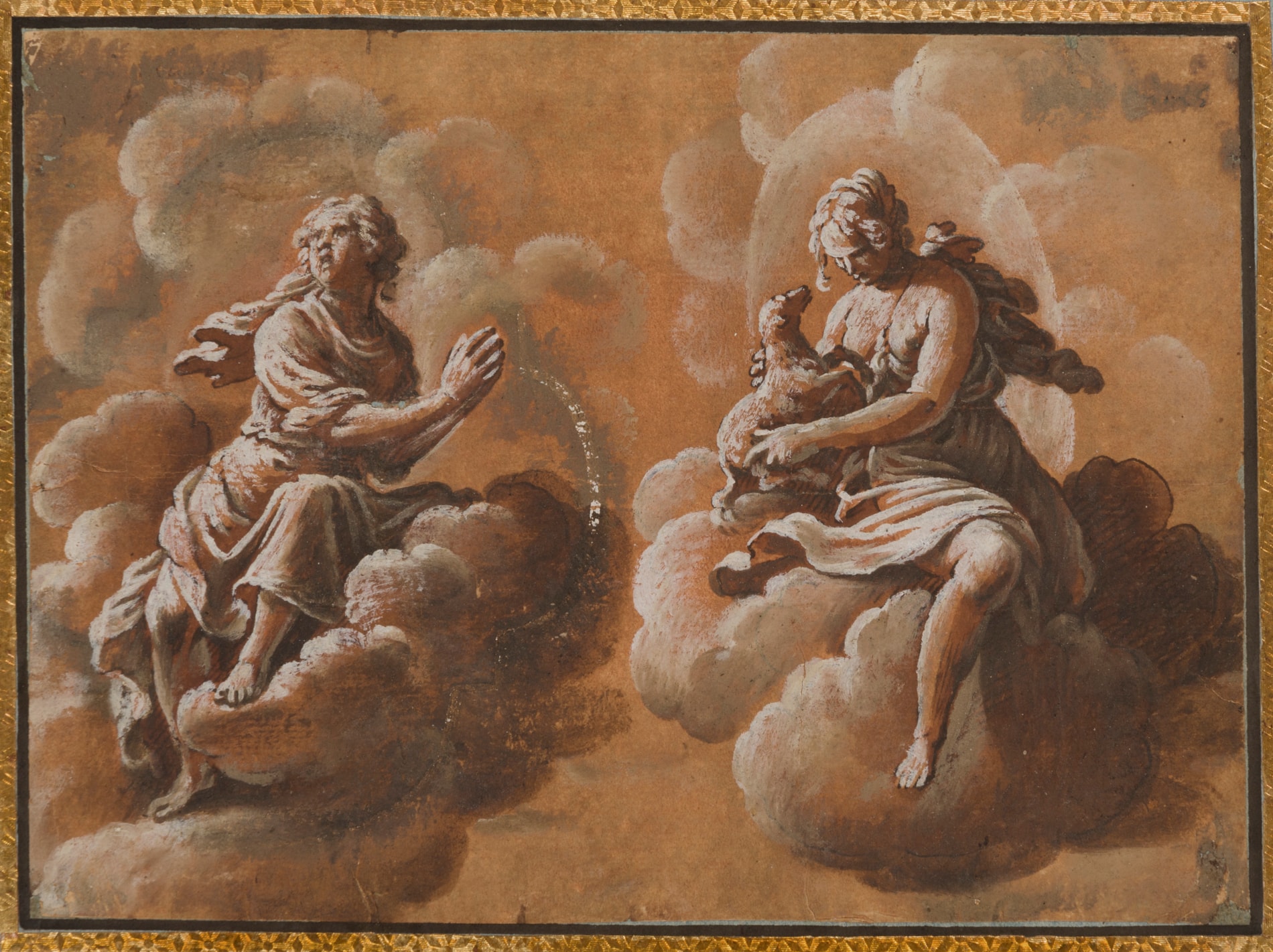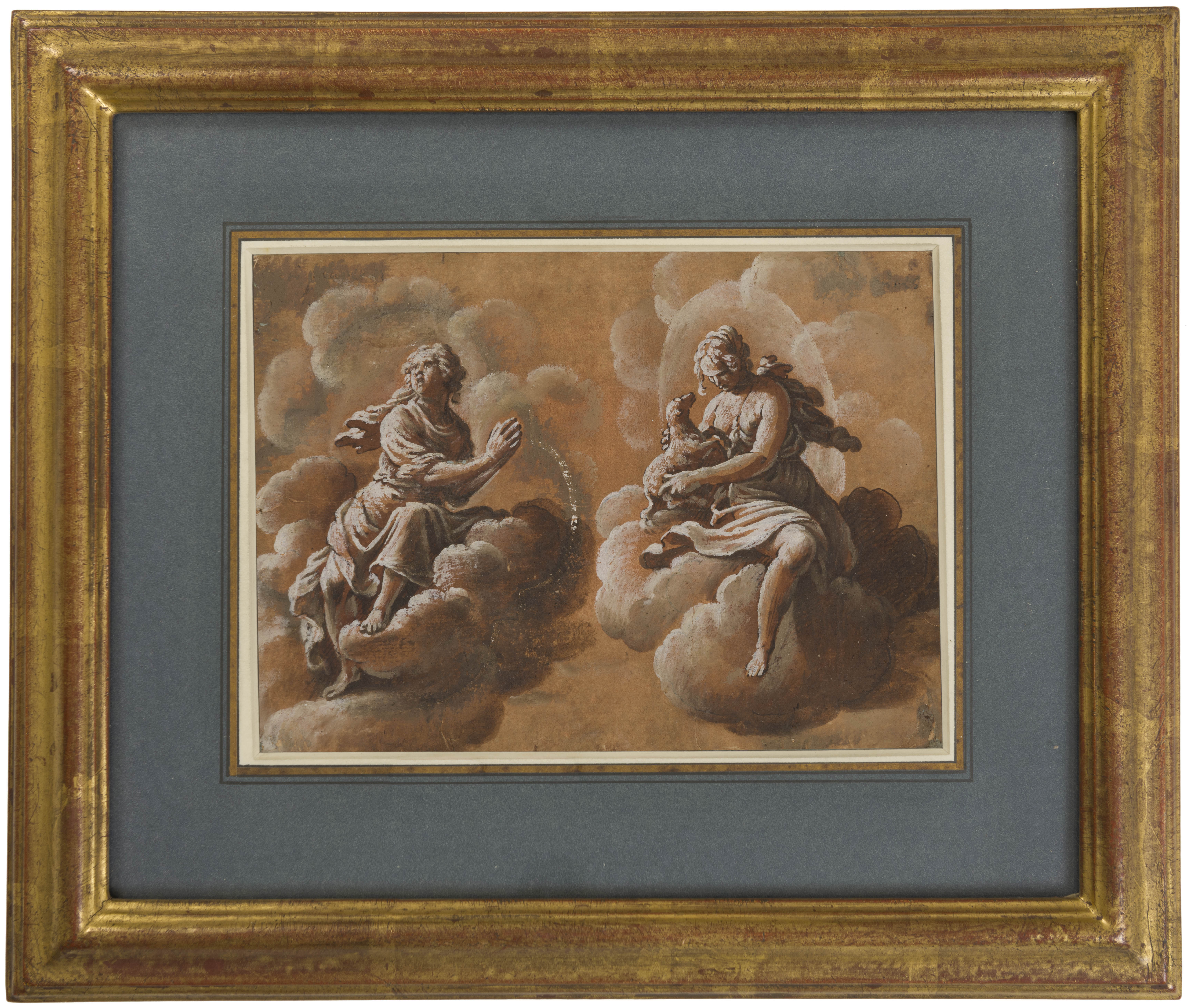 Andrea Piai has kindly pointed out that the present sheet is a preparatory study, with differences, for two allegorical figures in Bassetti’s fresco decoration on the vault of the cupola of the Varalli chapel, known as the Chapel of the Innocents, in the church of Santo Stefano in Verona. Built between 1618 and 1621 for the parish priest Giulio Varalli, this important Baroque chapel was decorated with works by a number of prominent Veronese painters, including altarpieces by Alessandro Turchi, Pasquale Ottino and Bassetti, as well as frescoes by Ottino and Bassetti. Both figures in this drawing are studies for allegorical female figures of Virtues painted by Bassetti in the polylobed compartments of the Varalli chapel dome. The right-hand figure, depicting a woman with a lamb, is a study for an Allegory of Meekness, while the left-hand praying figure appears in another compartment; it may also be noted of the latter figure that it is surrounded by a faint polylobed shape that matches that of the compartment in which the painted figures are placed.