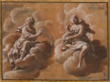 The praying woman on the left of this sheet may also have been used several years later, for a figure in Bassetti’s monumental altarpiece of The Virgin and Child with Saints Blessing the City of Capodistria, dating from the second half of the 1620s. The painting was commissioned around 1627-1628 by the Veronese churchman Marco Belli for the Franciscan church of Santa Marta in Capodistria (today Koper in Slovenia) and is now on loan to the Narodna Galerija in Ljubljana, Slovenia. The left-hand figure in this drawing would seem to be a study for the second figure from the right of a group of saints in clouds at the top of the painting; in the altarpiece this figure is, however, partly obscured both by the male saint seated next to her and the hand of the Virgin.