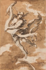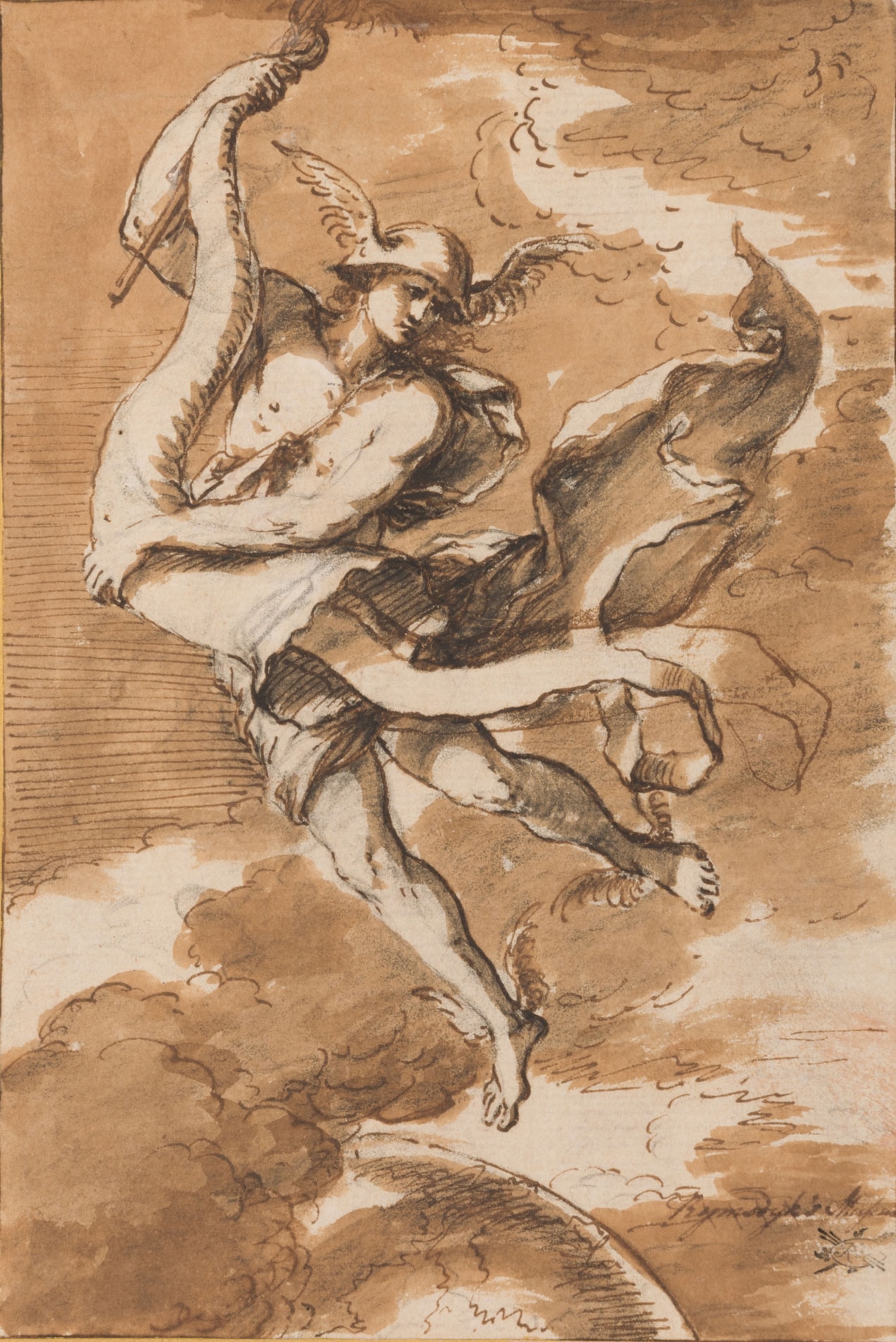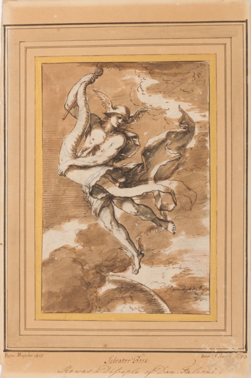 Rosa may have been inspired by a somewhat similar figure of Mercury that appears in the frontispiece to the 17th century German Jesuit scholar Athanasius Kircher’s Obeliscus Pamphilus, published in Rome in 16503. (Indeed, the artist is known to have met Kircher in Rome.) The imagery of both the present sheet and the related print anticipates that of Rosa’s painting of an Allegory of Fortune of 1659, in the J. Paul Getty Museum in Los Angeles, in which the female figure also bears a cornucopia. In stylistic terms, the present sheet may be compared with a number of Rosa’s preparatory studies for his celebrated Figurine series of etchings of soldiers, peasants and other figures, datable to c.1656-1657.