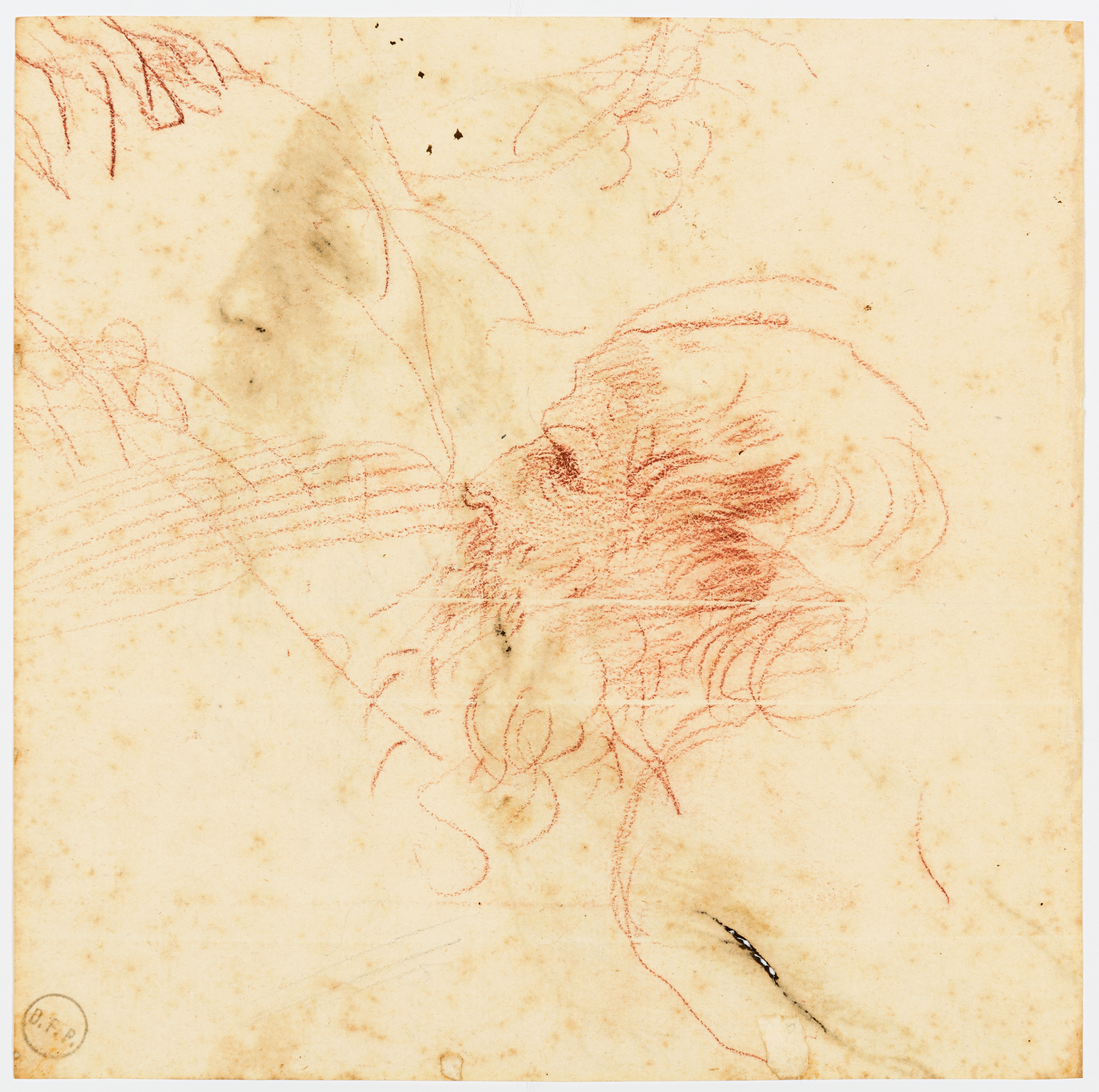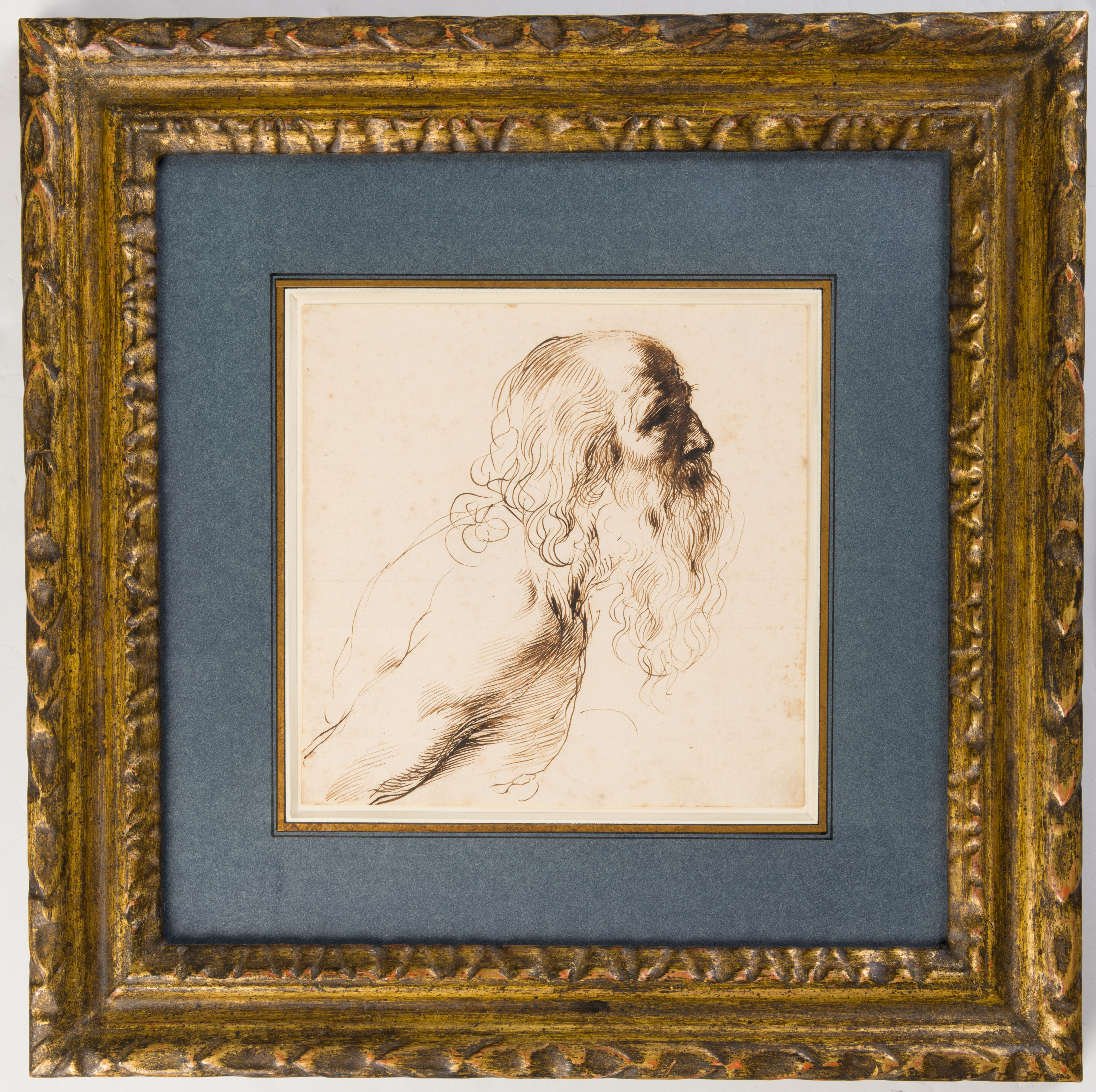 This drawing may be compared stylistically with a damaged study of an old bearded man in profile to the right, in the Royal Collection at Windsor Castle, which is drawn on the reverse of a letter dated Cento 1638. Also somewhat similar is the head and torso of an elderly bearded saint in profile to the right found in a red chalk drawing at Chatsworth. As one scholar has noted, ‘the texture of hair seems to have fascinated Guercino, and few draftsmen represented it as adeptly. Whether head-born or face-worn, hair is used subtly to bring a sense of verisimilitude and realism to Guercino’s figures and compositions.’