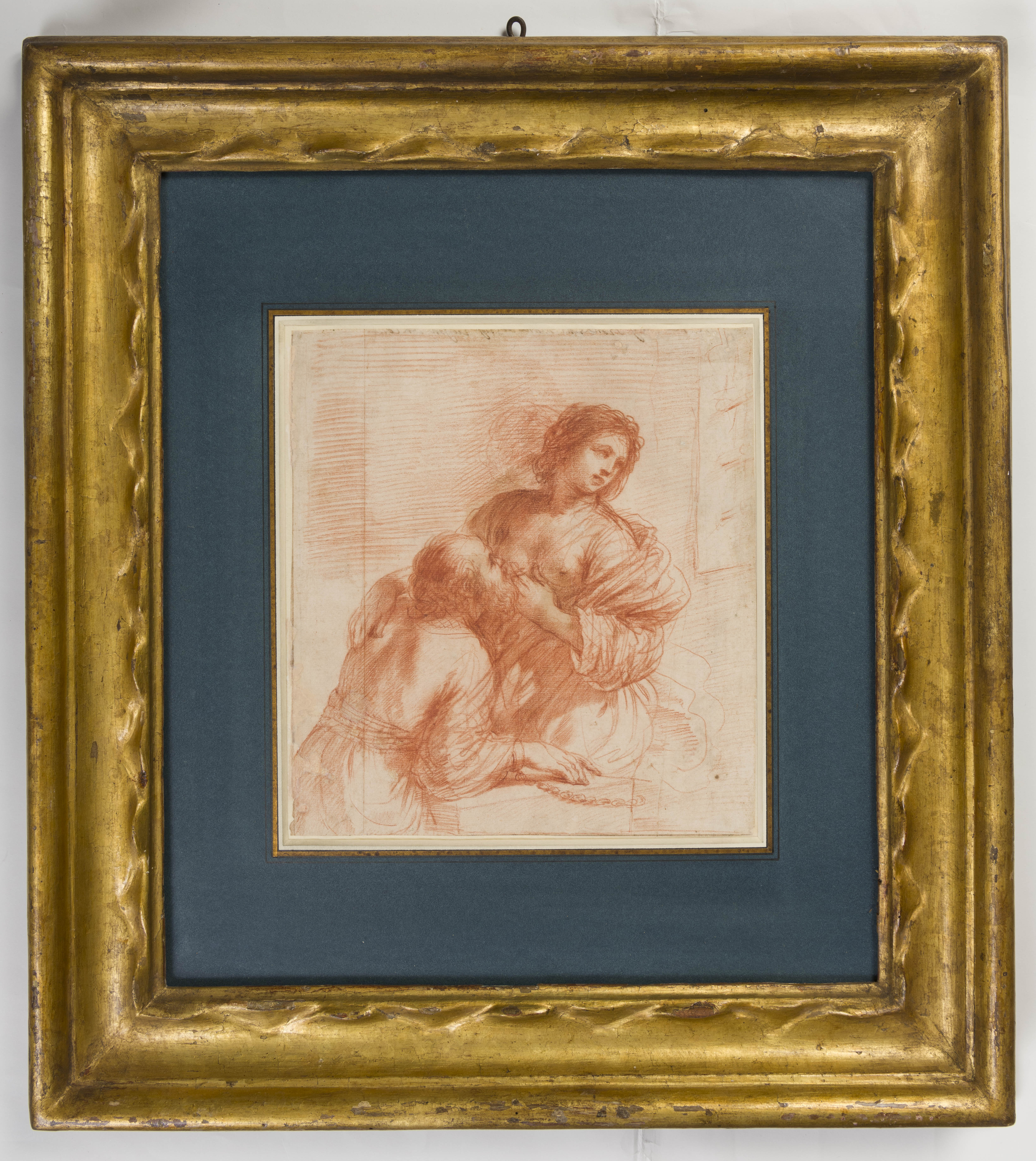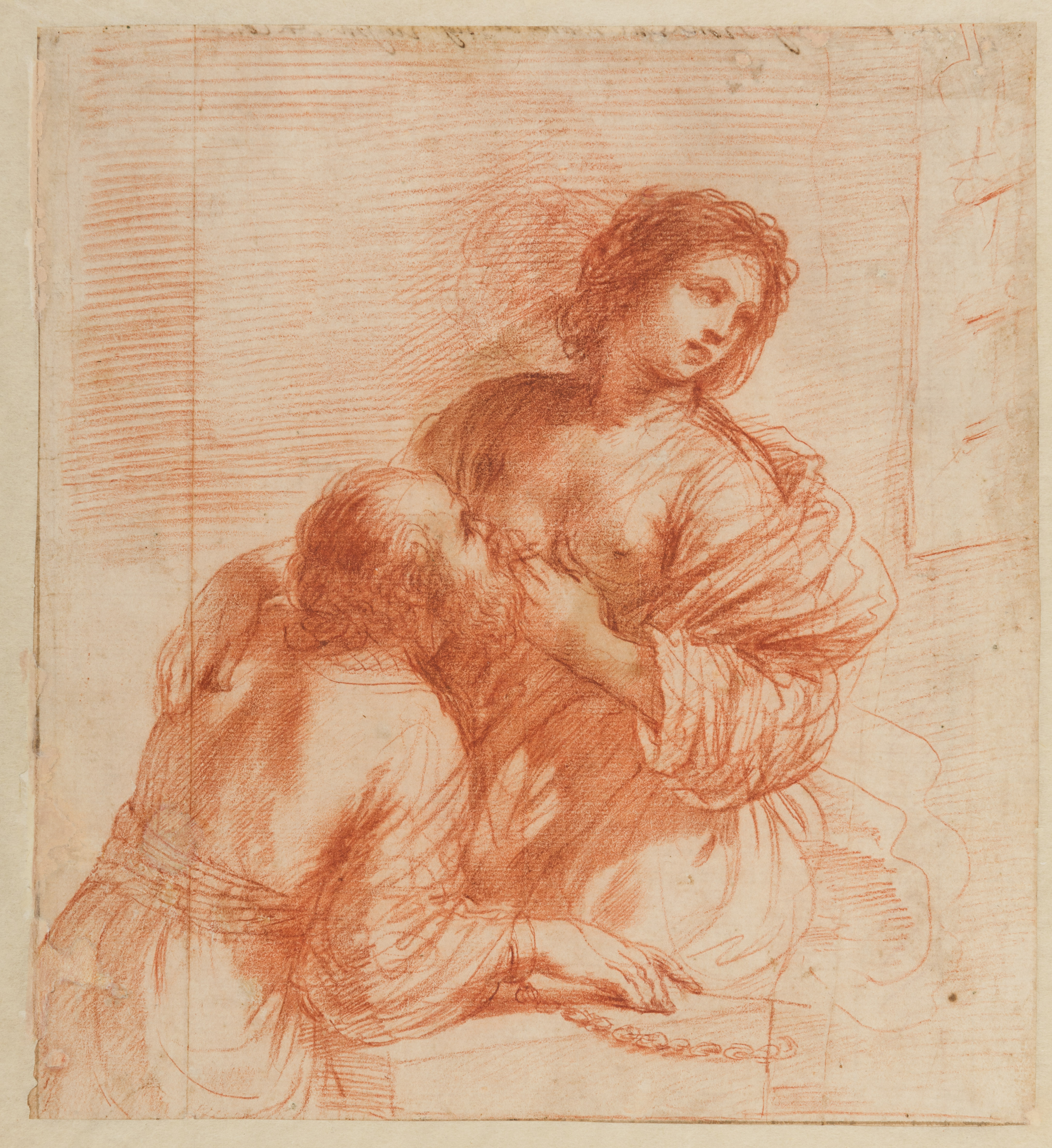 As David Stone has noted of this recent addition to the corpus of Guercino’s drawings, ‘Of the many preparatory sheets [for the 1639 painting] thus far identified, the present sheet is closest to the scheme realized...As in the latter, Cimon’s shackle and chains on the stone block feature prominently in the newly identified drawing, which has wonderfully realized shadows for the individual links of the chains. Guercino’s treatment of Cimon’s right hand is particularly sensitive, giving the viewer a sense of the man’s age and fragility. The daughter’s left hand, meanwhile, simultaneously conceals and reveals: with her fingers, with a degree of modesty, she holds her right breast to give suck to her prisoner-father; with her thumb she presses up against the contours of her left breast, reinforcing the voluptuousness of her body.’ An interesting pentiment is noticeable in the present sheet, where Guercino first drew Pero’s head angled more to the left and looking down at Cimon, before deciding to tilt her head to the right to look away from her father as he nurses at her breast.