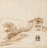 In many of Guercino’s landscape drawings, there is an echo of the pastoral views of 16th century Venetian artists such as Giorgione, Titian and Domenico Campagnola. (The last of these, like Guercino, drew a large number of landscapes as independent works of art.) The artist may also have found other sources of inspiration in the work of such contemporaries in Rome as Agostino Tassi, Annibale Carracci, Domenichino and Paul Bril, all of whom produced landscape drawings. It has been further suggested that Guercino may have been influenced by Netherlandish landscape prints of the early 17th century, of which he may have owned some examples; he is certainly known to have admired the etchings of Rembrandt.