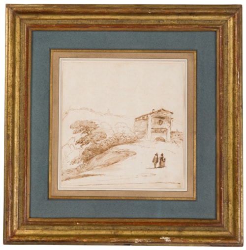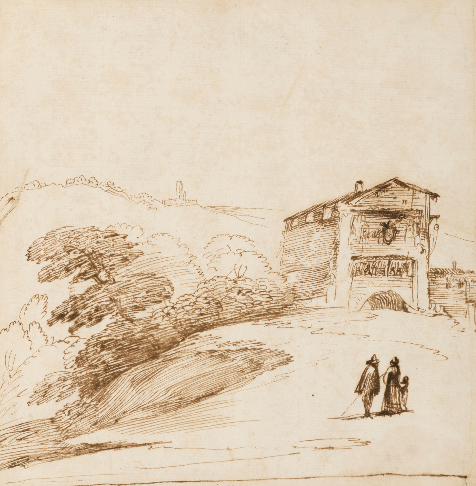 As has been noted, ‘there are always interesting details to be noted in Guercino’s landscapes’, and in this drawing it may be observed that the prominent building, despite its rustic appearance, is decorated with a grand stemma, or coat of arms. The inclusion of figures in the foreground is also typical of Guercino; as Turner has written of his landscapes, ‘Another characteristic of these drawings is the endless stream of little figures dotted about, enlivening the scene and at the same time providing a sense of scale: wayfarers, country folk engaged in different occupations, children playing together and the occasional yapping dog.’