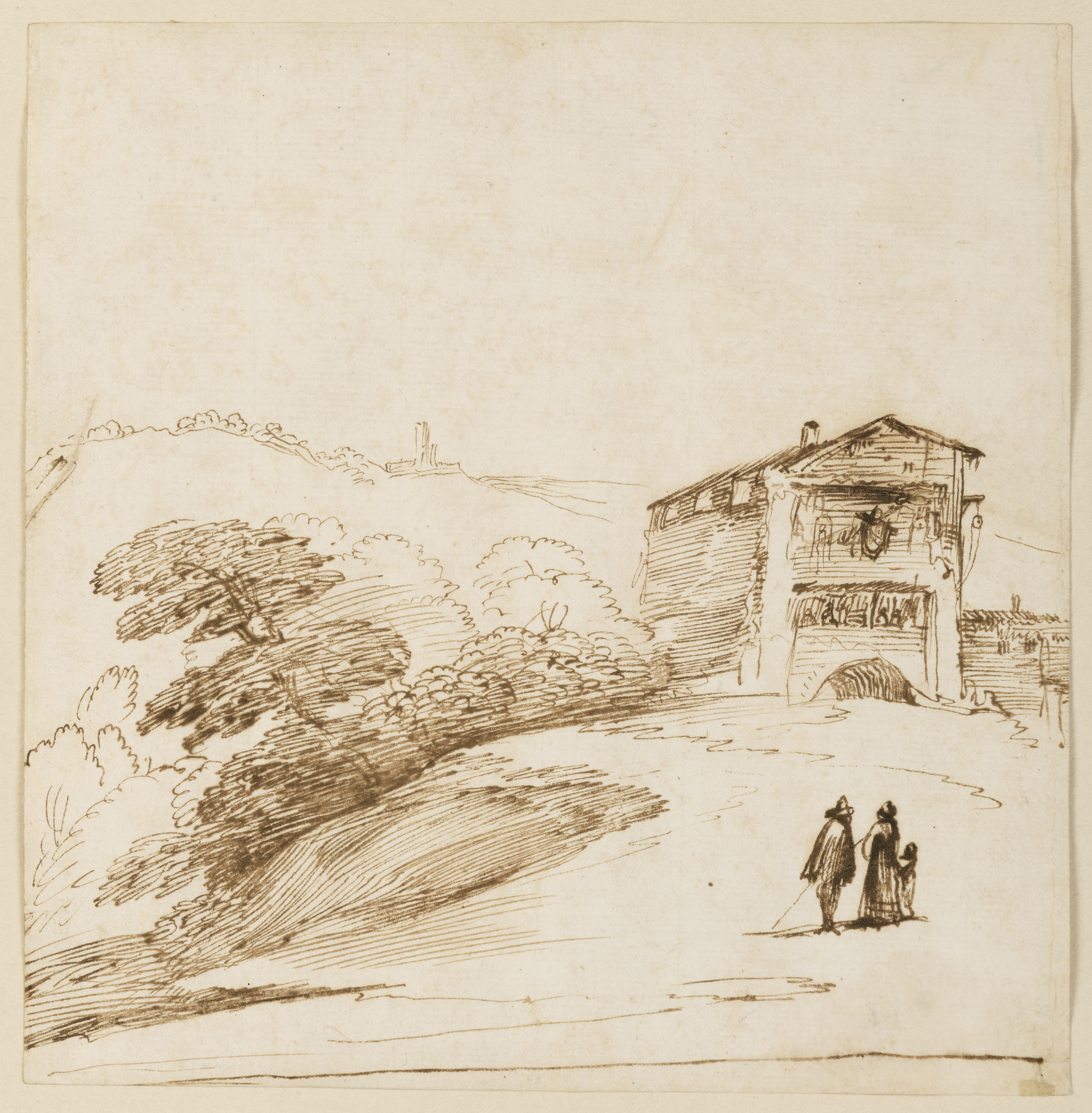 As has been noted, ‘there are always interesting details to be noted in Guercino’s landscapes’, and in this drawing it may be observed that the prominent building, despite its rustic appearance, is decorated with a grand stemma, or coat of arms. The inclusion of figures in the foreground is also typical of Guercino; as Turner has written of his landscapes, ‘Another characteristic of these drawings is the endless stream of little figures dotted about, enlivening the scene and at the same time providing a sense of scale: wayfarers, country folk engaged in different occupations, children playing together and the occasional yapping dog.’