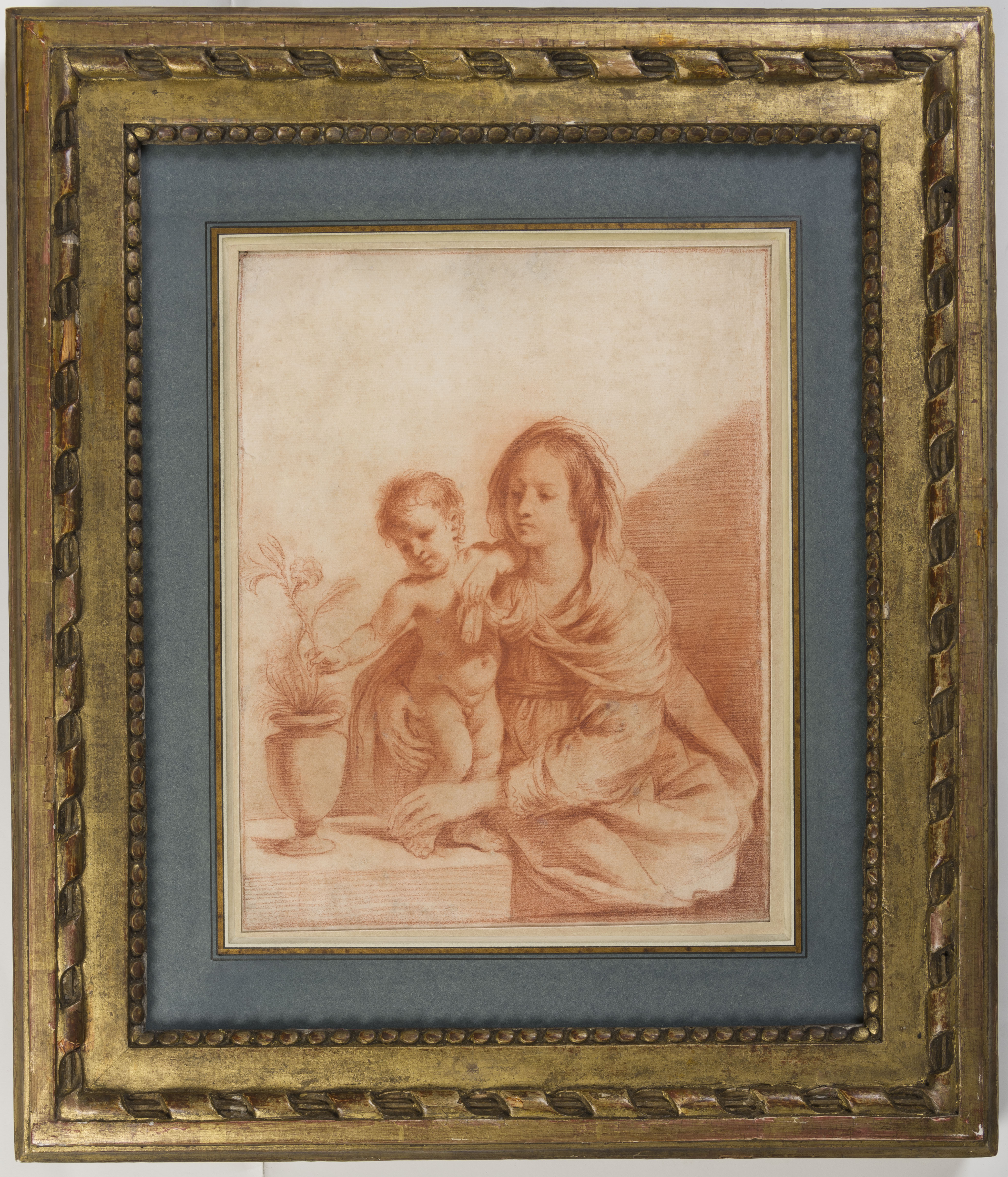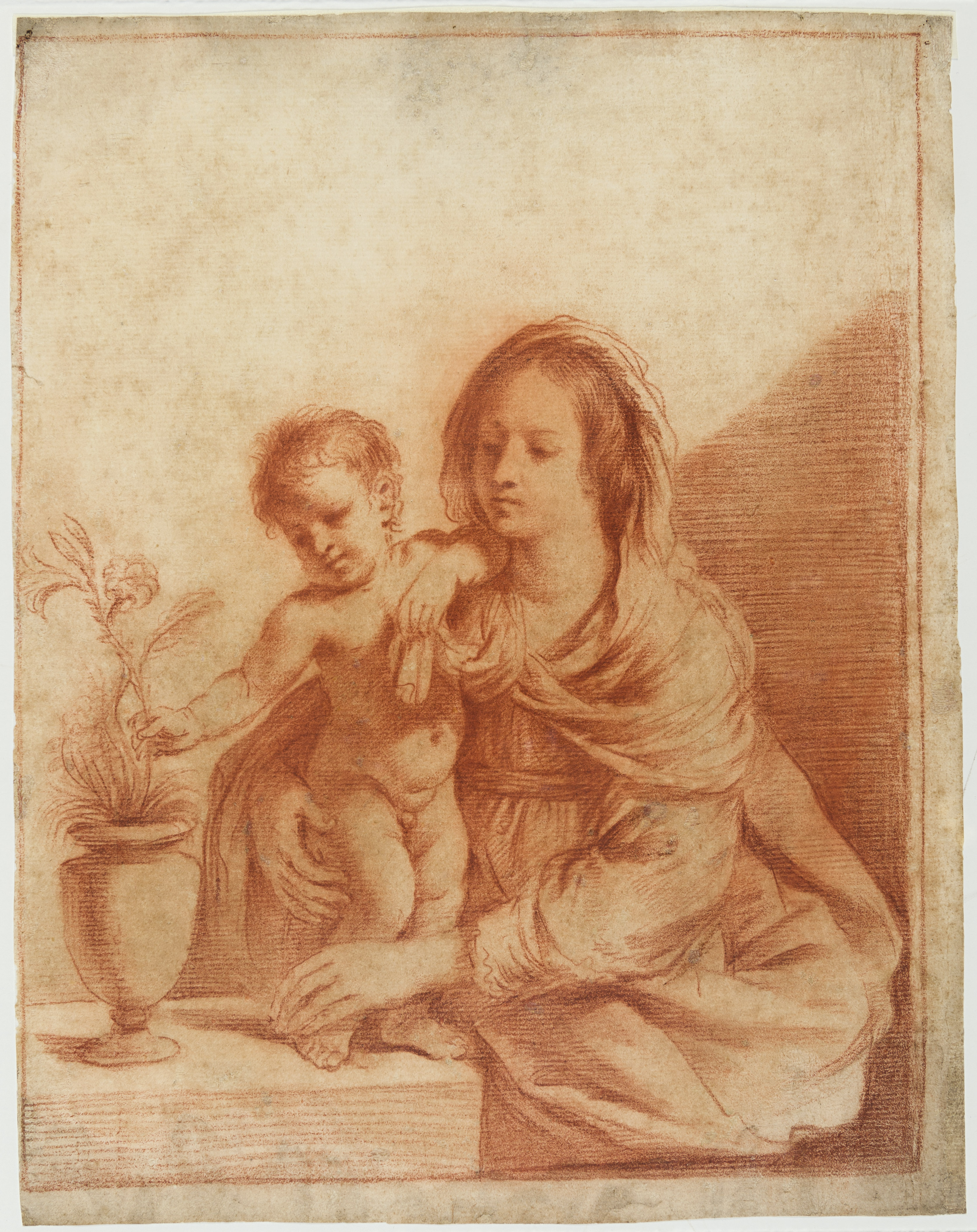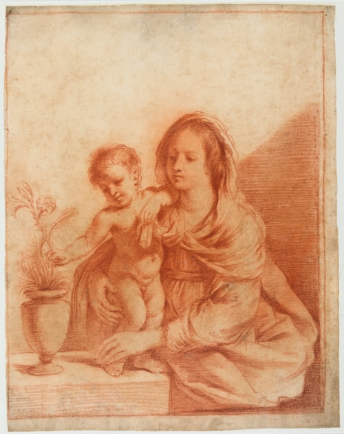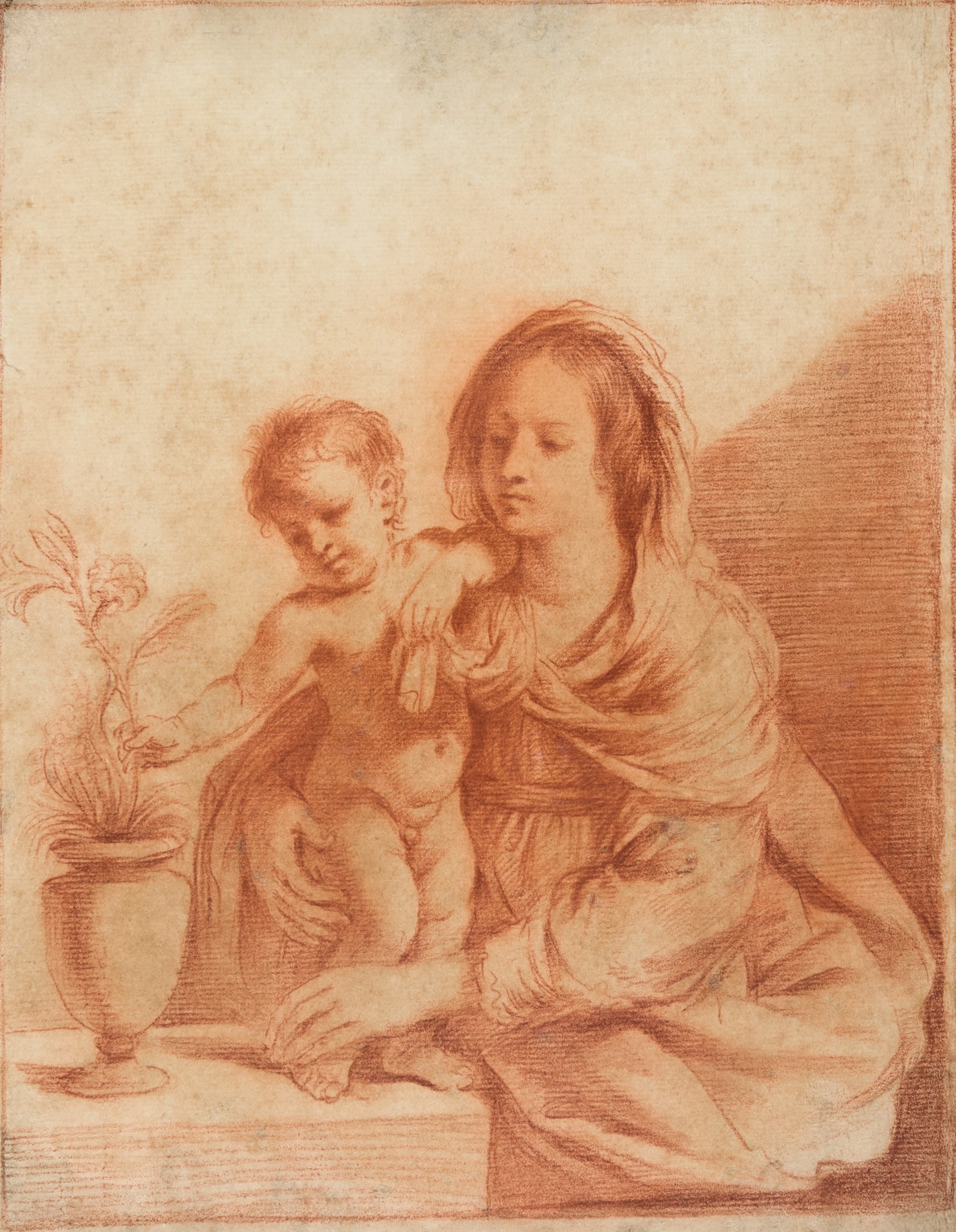 In terms of subject, medium and style, this drawing can be likened to an equally finished red chalk study of The Virgin and Child with a Book and a Pot of Pinks of c.1635-1638, in the collection of the Pierpont Morgan Library in New York. A counterproof of the Morgan drawing is in the Royal Library at Windsor Castle, which was in turn used as a model for an undated engraving by Francesco Curti.