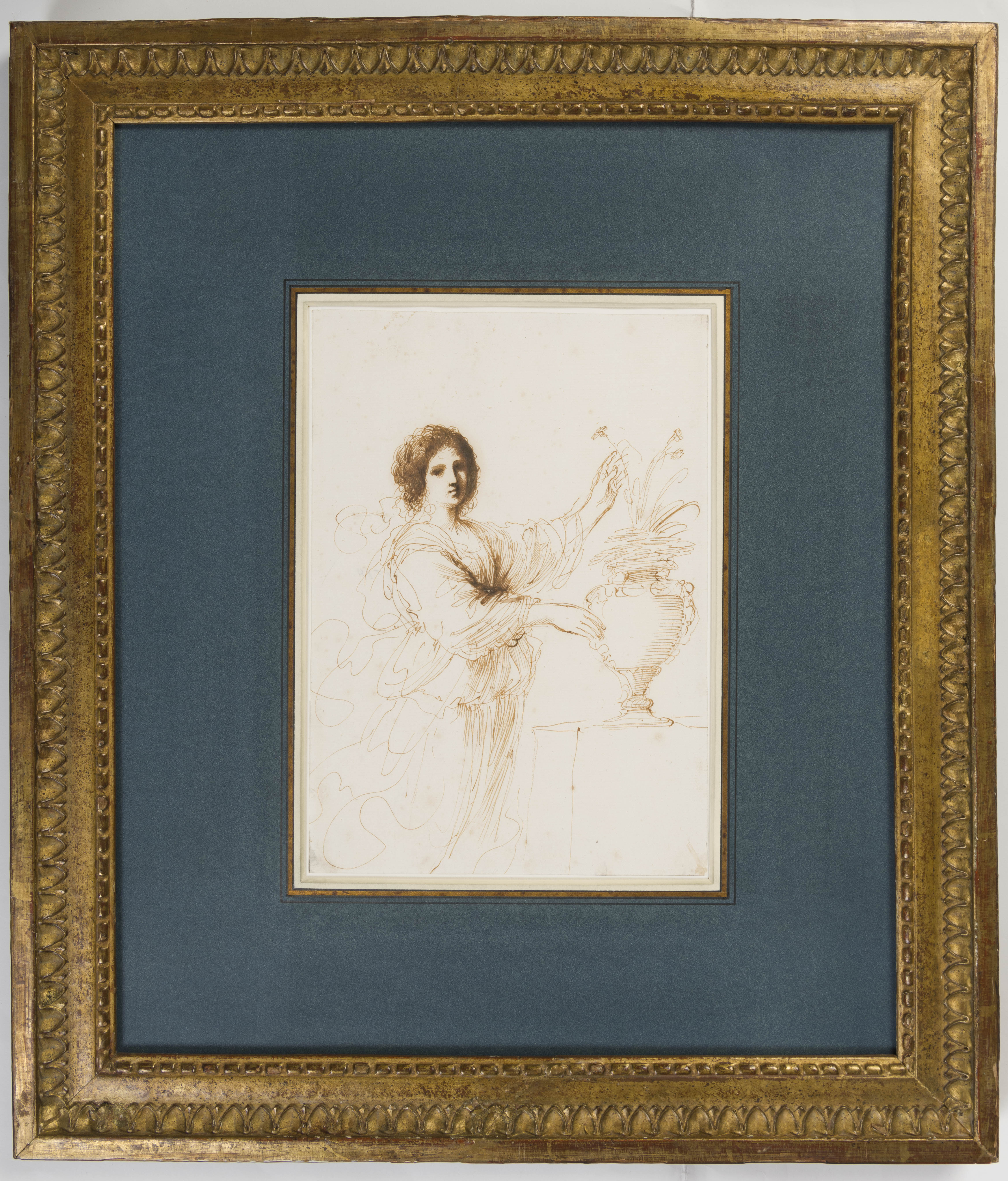 A stylistic and thematic connection may be made with a pen and ink drawing by Guercino of a Seated Woman Wearing a Wreath of Foliage on her Head, in the Royal Collection at Windsor Castle, which has been tentatively related to a lost Flora painting of 1632.