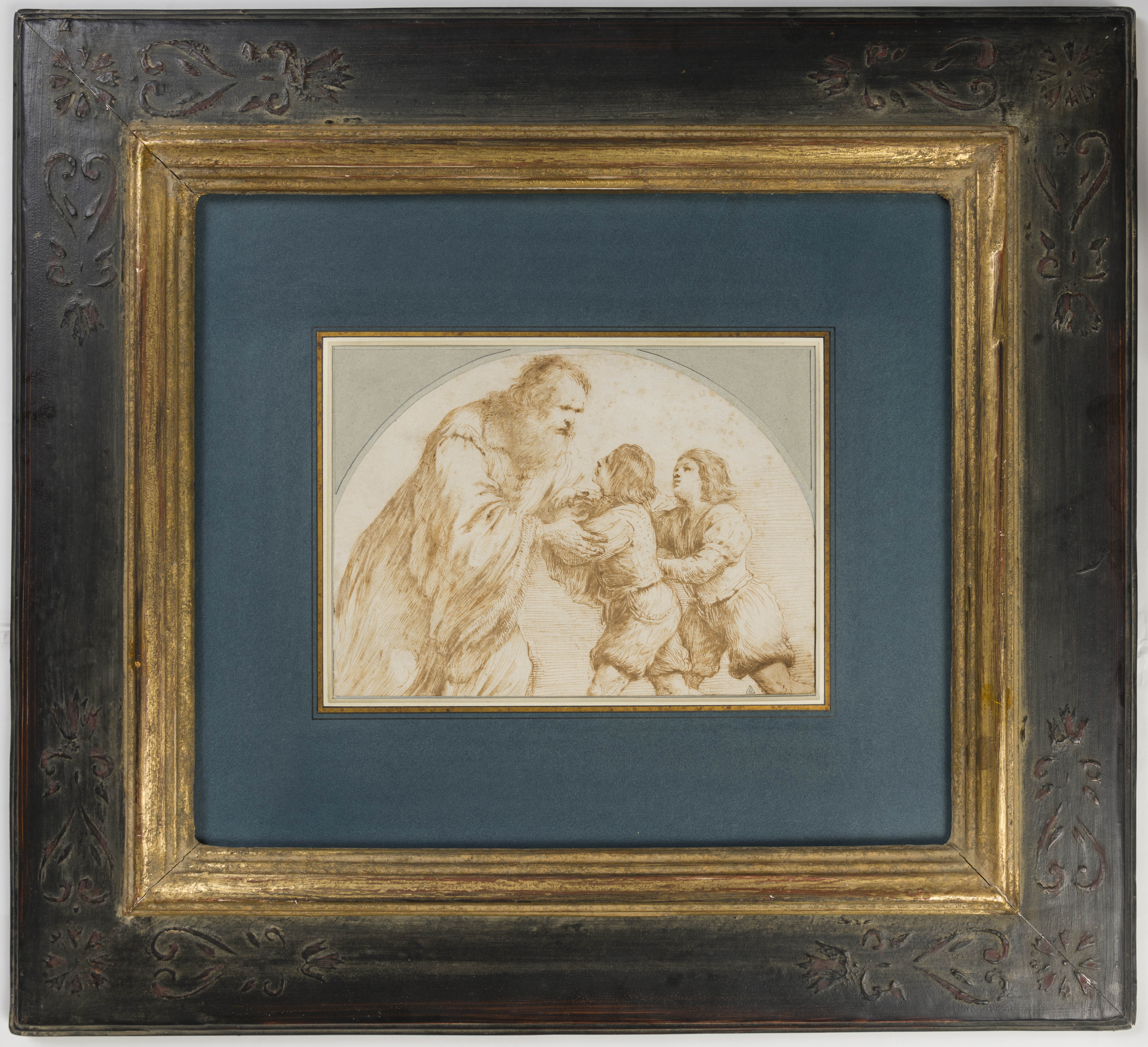 The subject here depicted is probably from the Old Testament. While it has been tentatively suggested that this drawing may represent the return of the prodigal son, the two boys appear to be too young to fit the Biblical parable. A more likely subject for our drawing, as well as those in Windsor and Chatsworth and the lost Denon sheet, would be Jacob blessing the sons of Joseph, as David Stone has recently suggested. An important episode from Hebrew scripture, the patriarchal blessing of Jacob, who was given the name Israel by God, is told in the Book of Genesis: