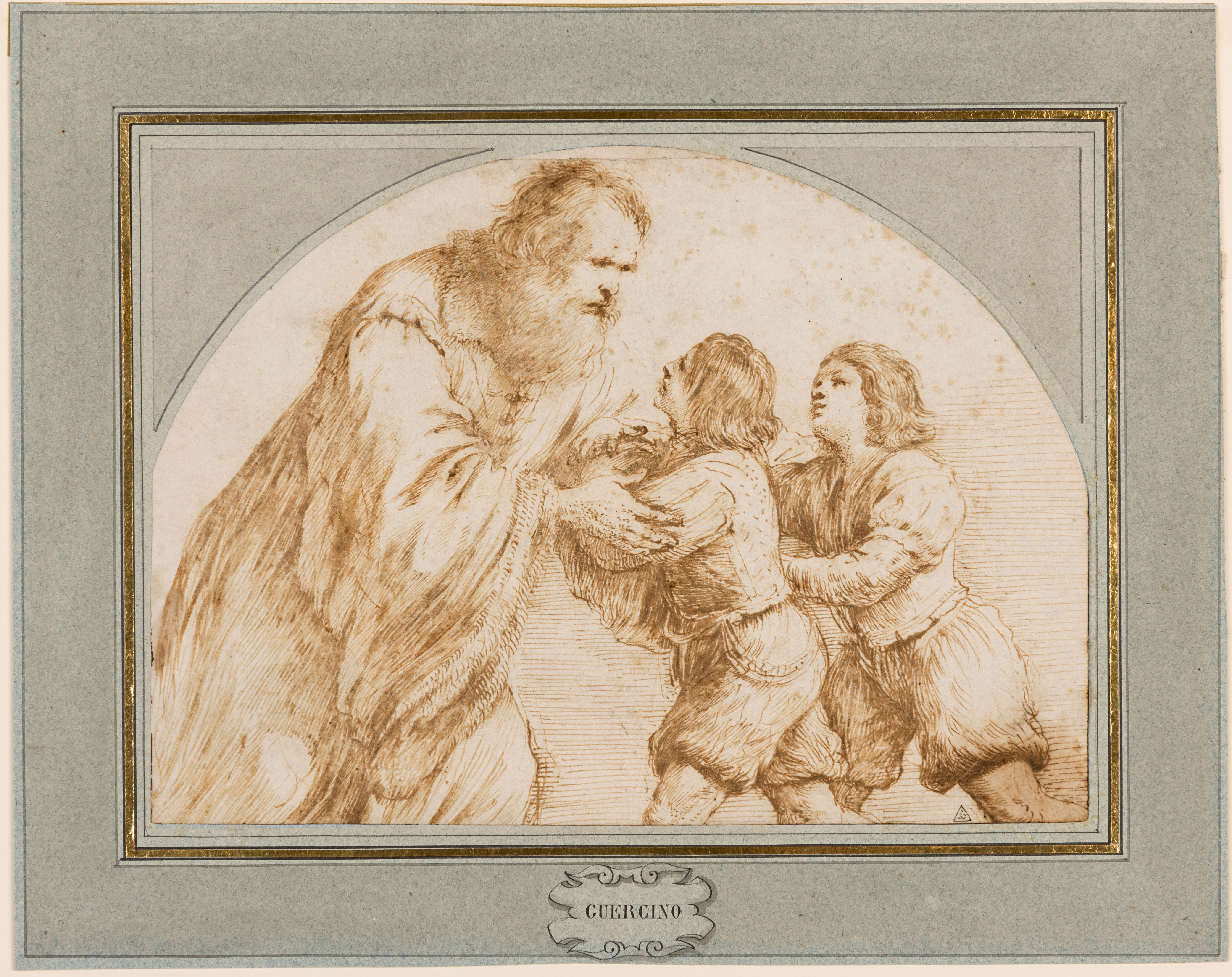 The present sheet would appear to depict Jacob, having blessed his younger grandson Ephraim, being confronted by the older brother Manasseh, in a manner that is also apparent in the lost Denon drawing. No related painting of this composition is known, however. Guercino had painted the subject of Jacob Blessing the Sons of Joseph early in his career, in a painting commissioned by Cardinal Jacopo Serra in 1620 and today in the National Gallery of Ireland in Dublin, but this drawing and the three other related studies would appear to be considerably later in date.